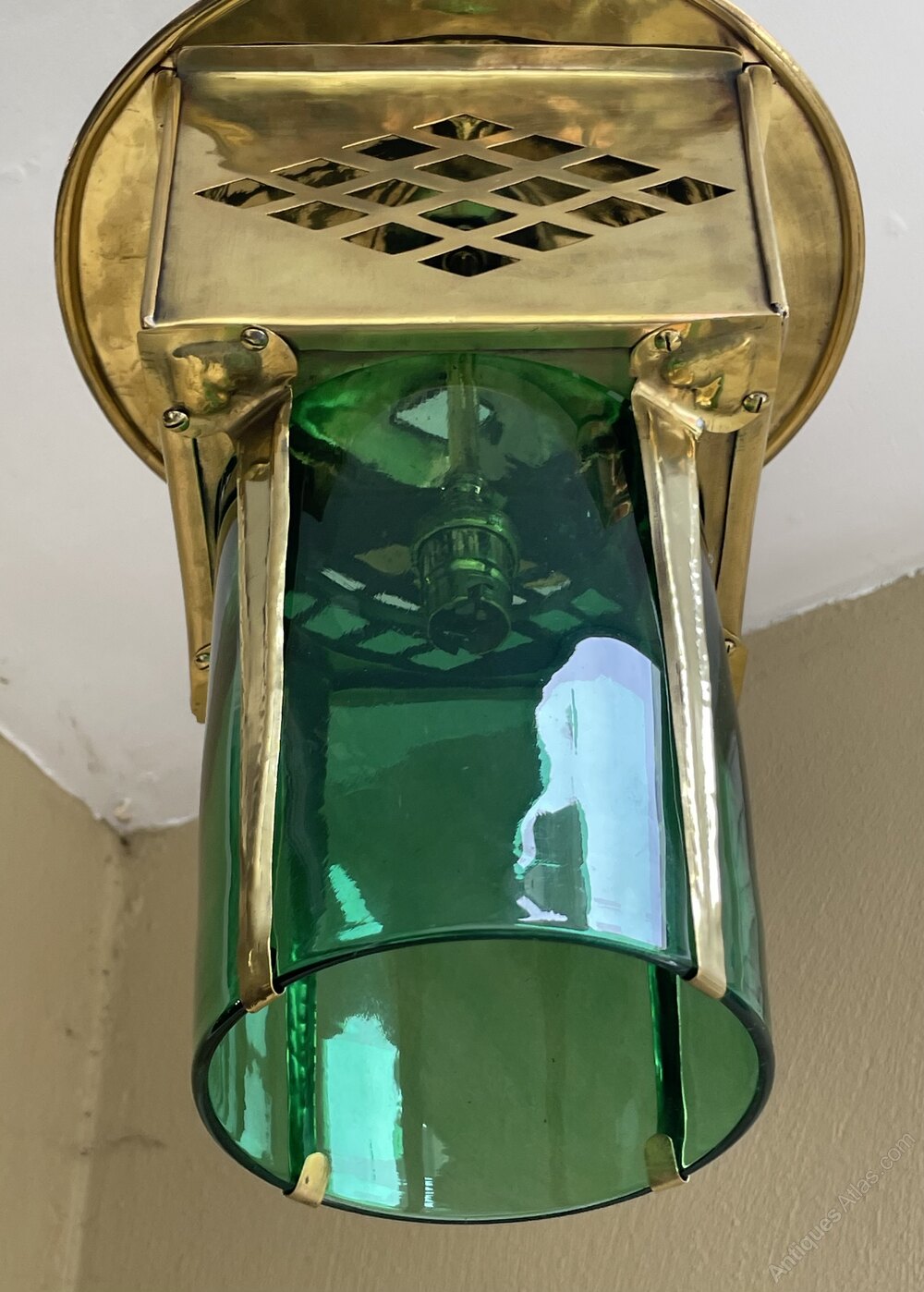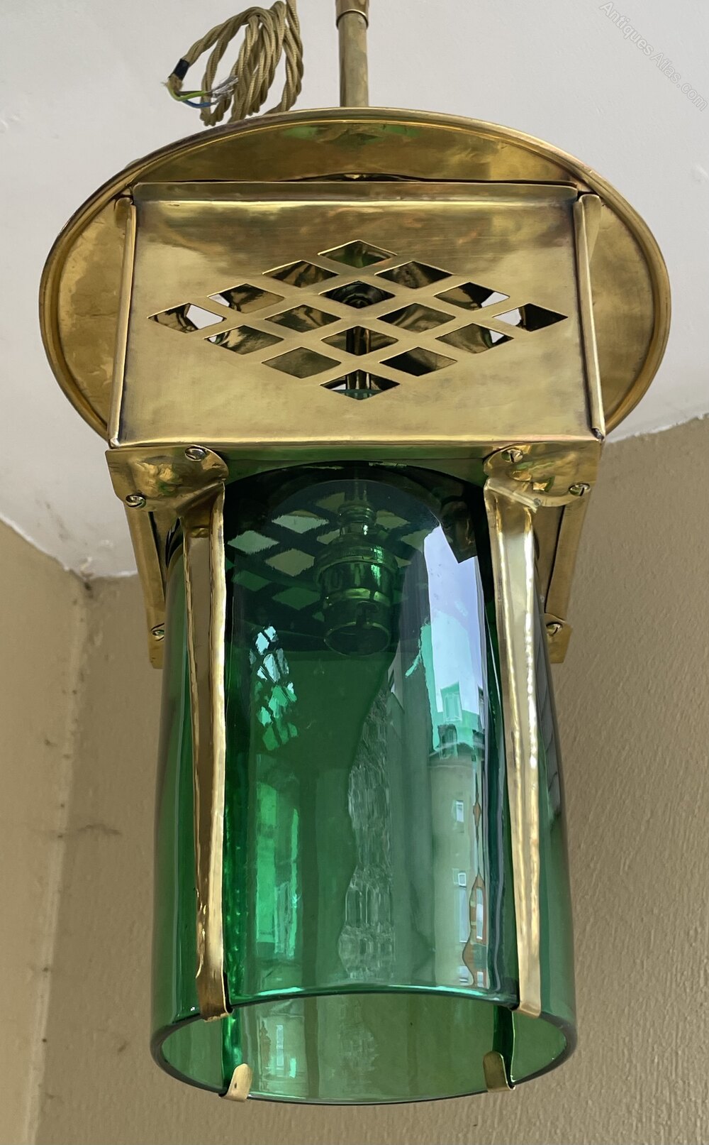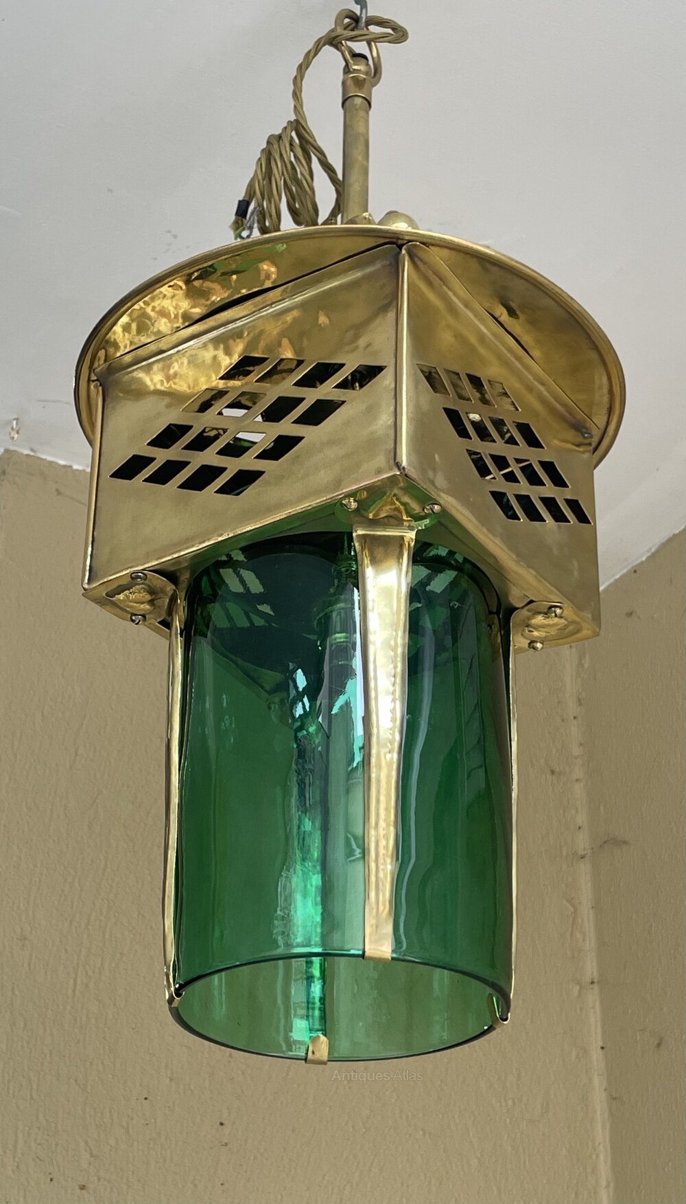 A good Arts & Crafts brass hall lantern of good scale and wonderful design, with pierced square top and beautiful hand made supports with heart detail supporting a replacement green glass shade.