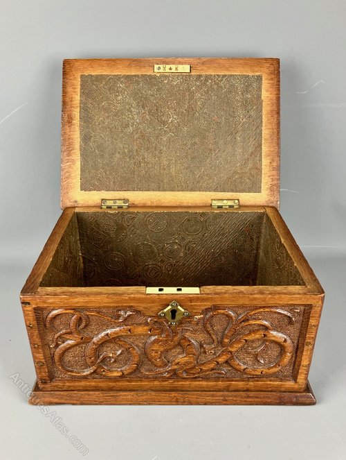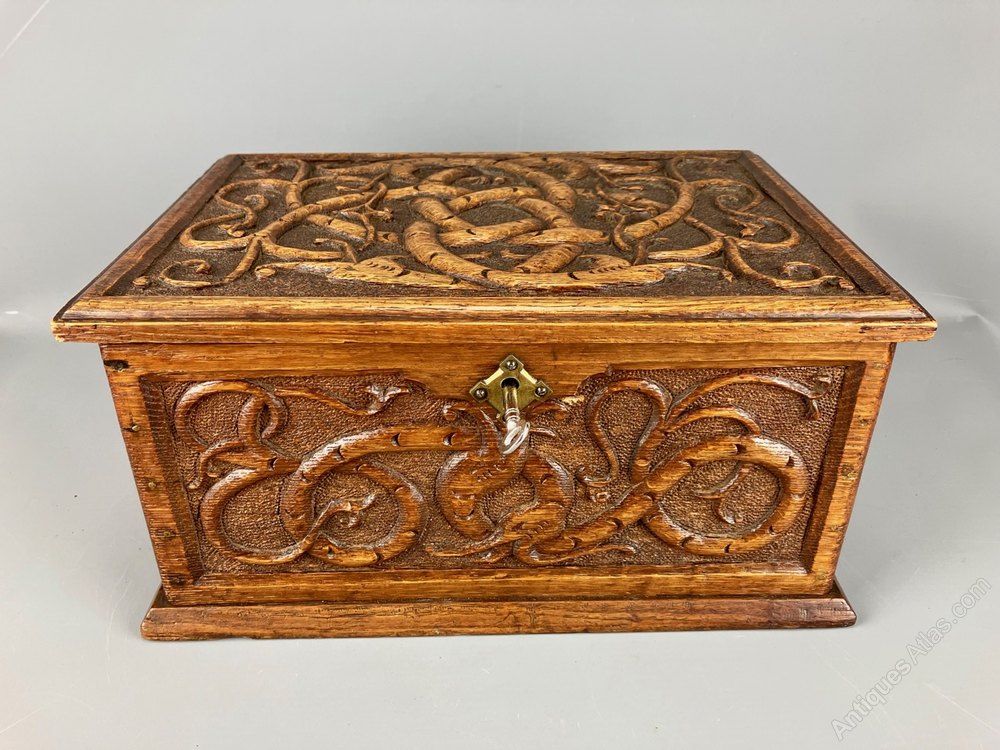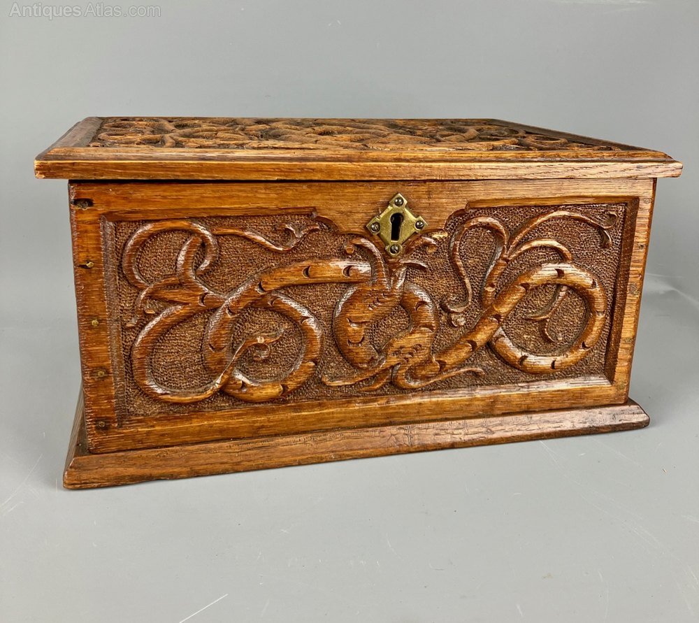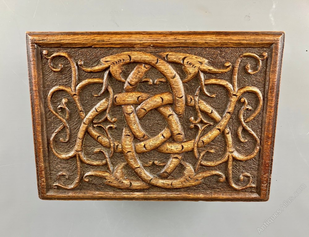 Arts & Crafts Carved Oak Box Celtic Beasts