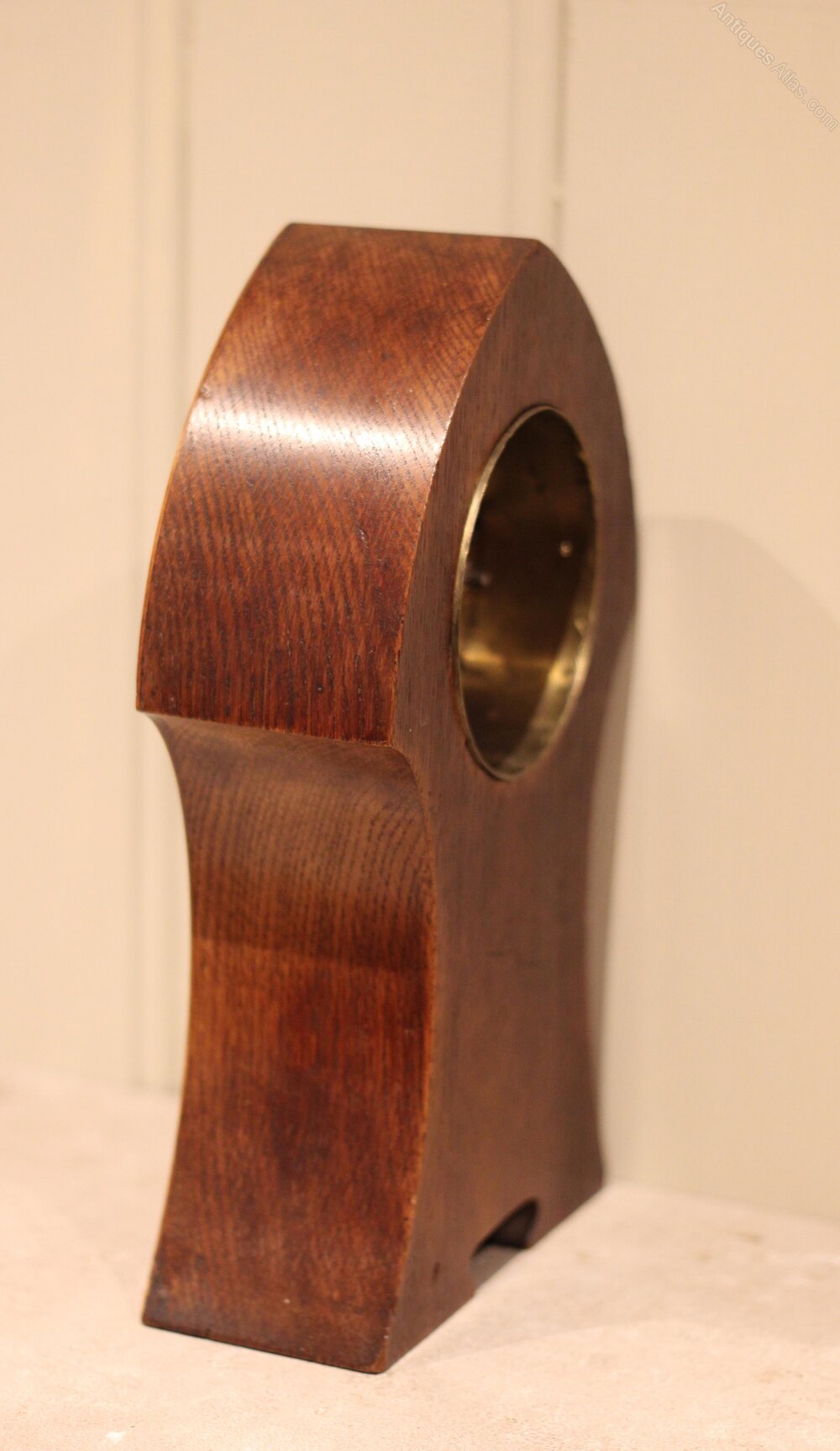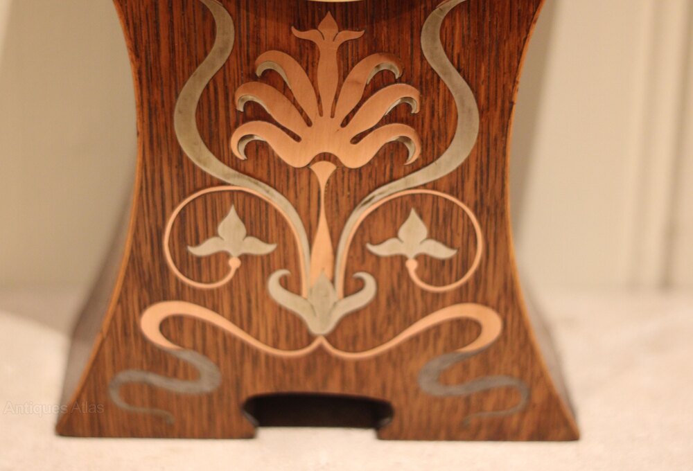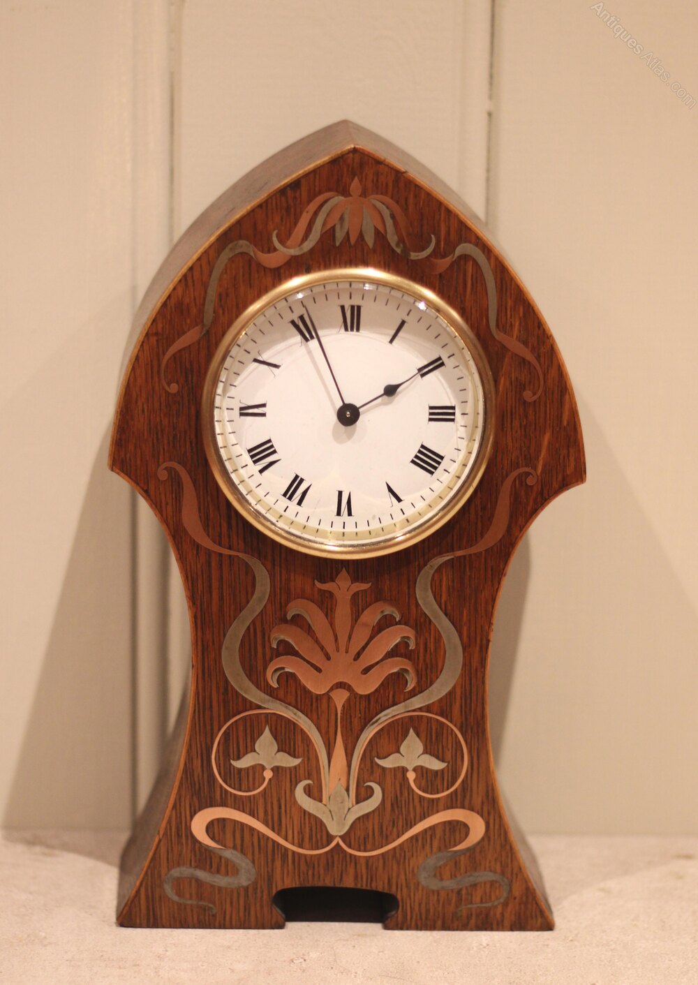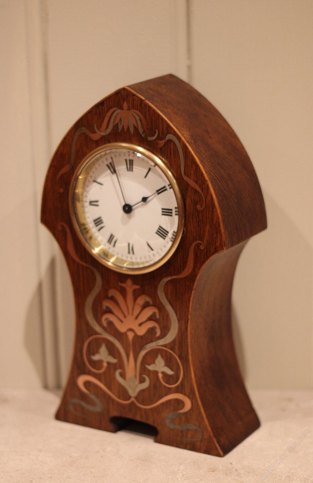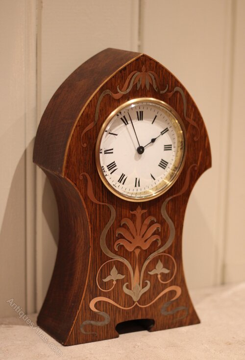 A solid oak Arts and Crafts mantel clock, having a solid oak case inlaid with copper and pewter stringing. It has an enamel dial with a bevel edge glass and a French 8 day lever platform movement.
