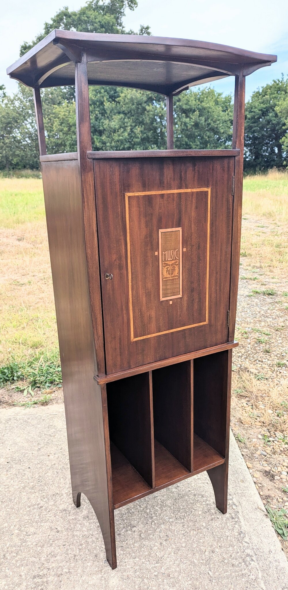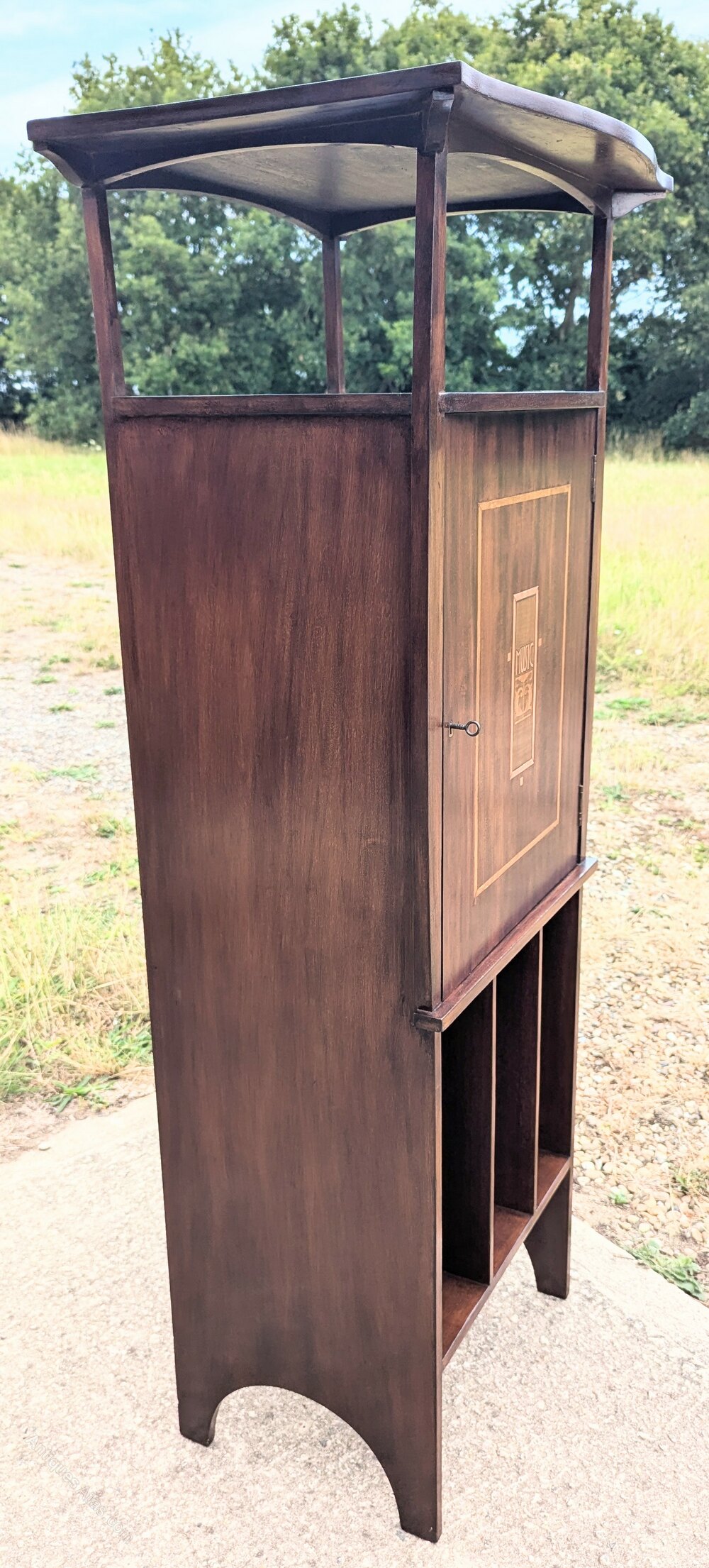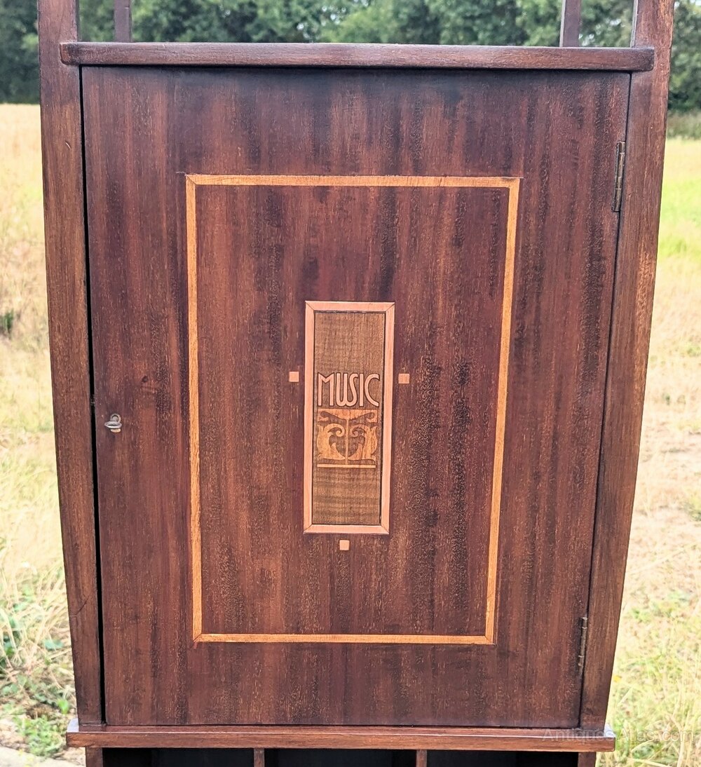 An interesting Scottish Arts & Crafts mahogany music cabinet inlaid with copper, boxwood and fruitwood after a design by Harvey Ellis for Gustav Stickley. It is in good condition and has a brass plaque to Miss Frazer from the congregation of Barry Parish Church 1918 and one for retailers Methven Ltd Dundee.