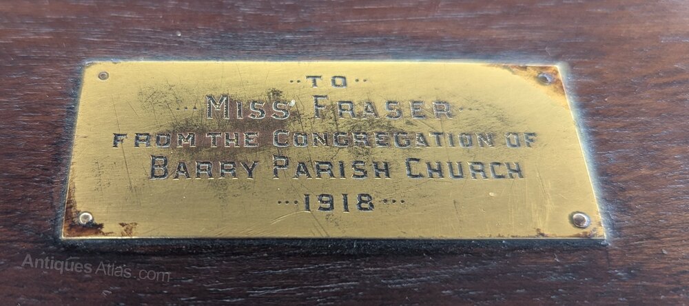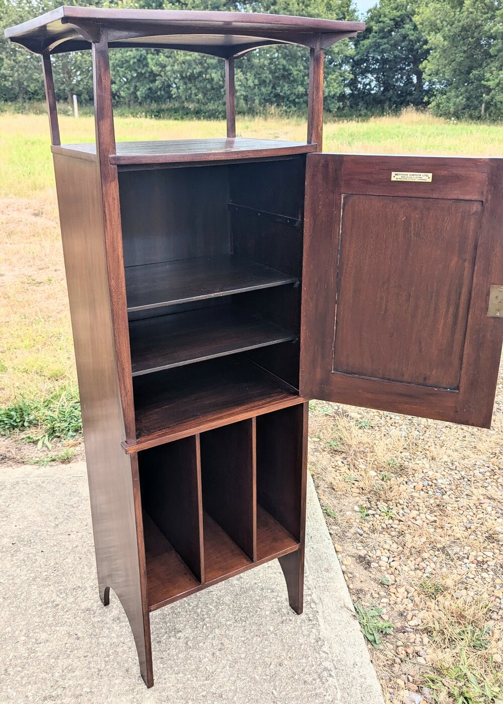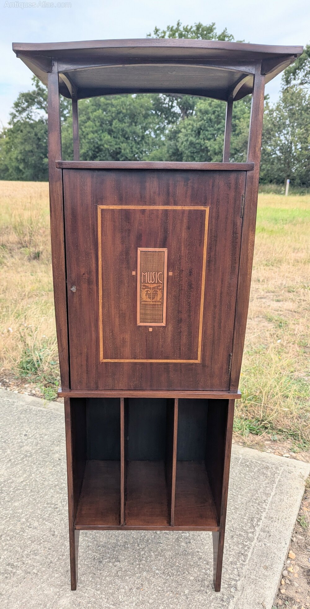 An interesting Scottish Arts & Crafts mahogany music cabinet inlaid with copper, boxwood and fruitwood after a design by Harvey Ellis for Gustav Stickley. It is in good condition and has a brass plaque to Miss Frazer from the congregation of Barry Parish Church 1918 and one for retailers Methven Ltd Dundee.