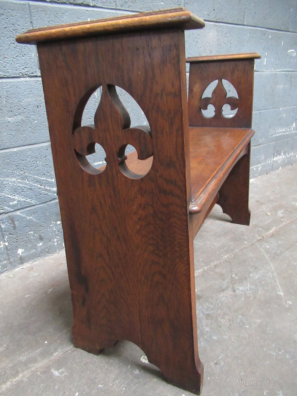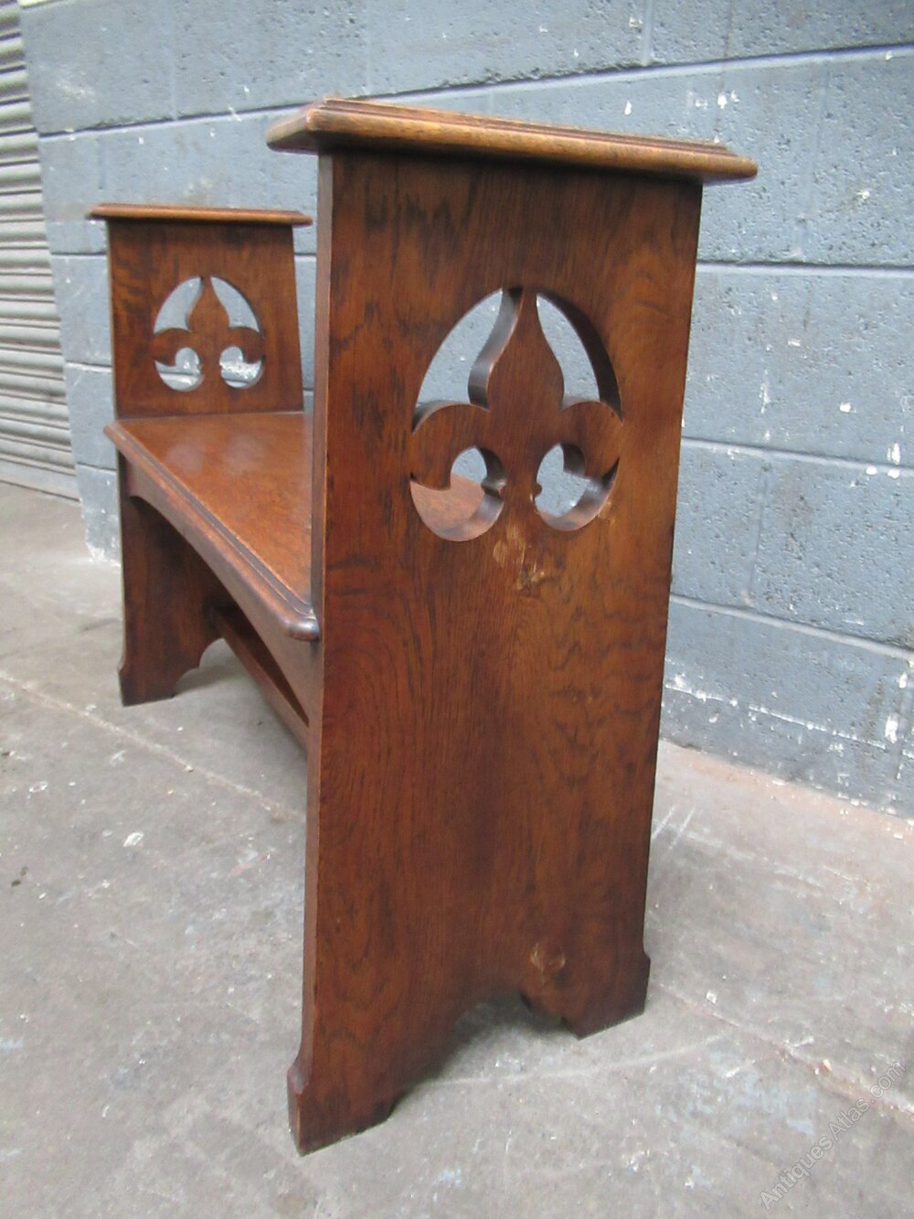 Arts and Crafts period Oak bench seat dating from around 1900. A solid made piece . with tall ends with top arm rests, the ends have a shaped cut out design. There is a lower cross stretcher.