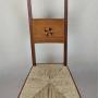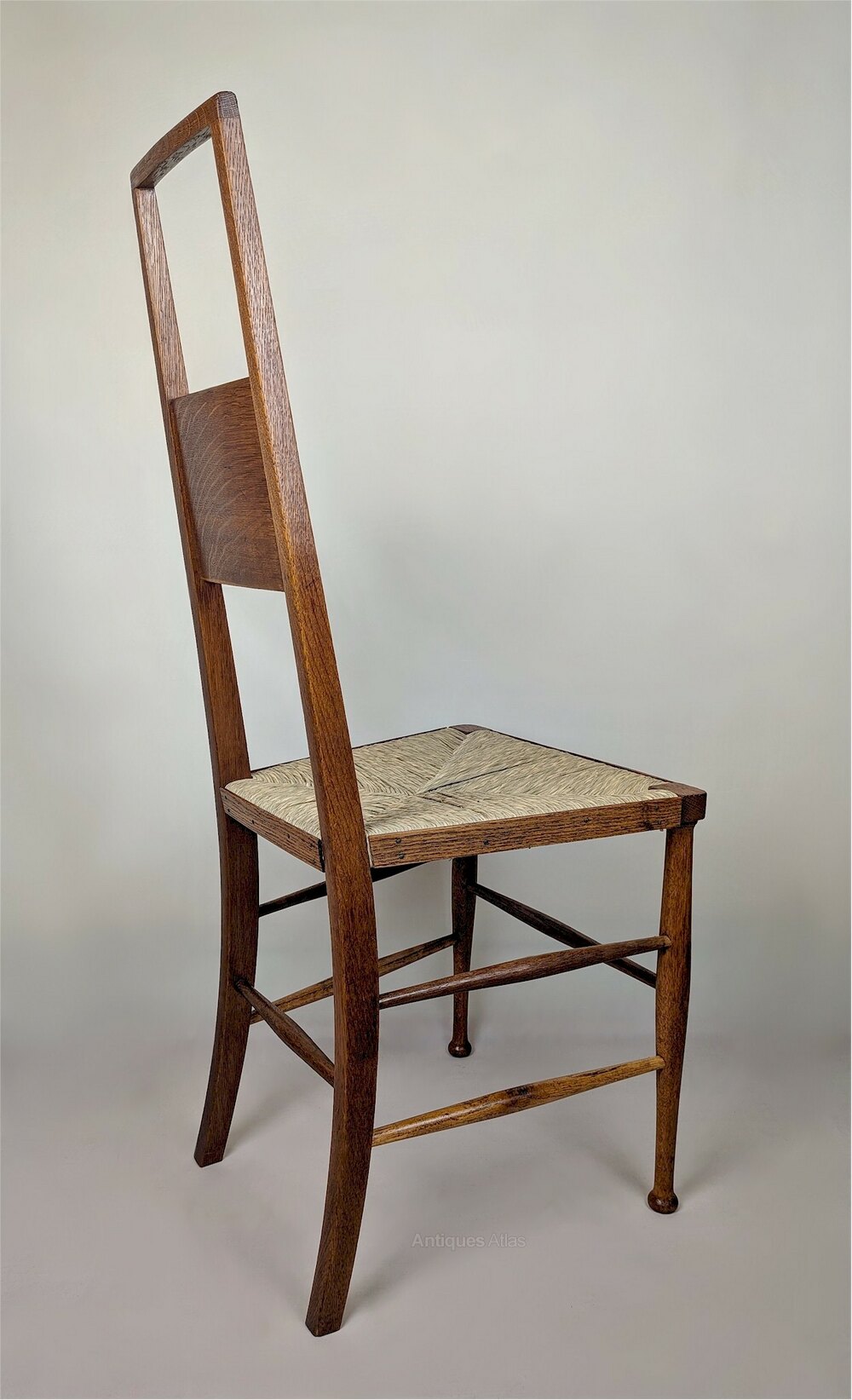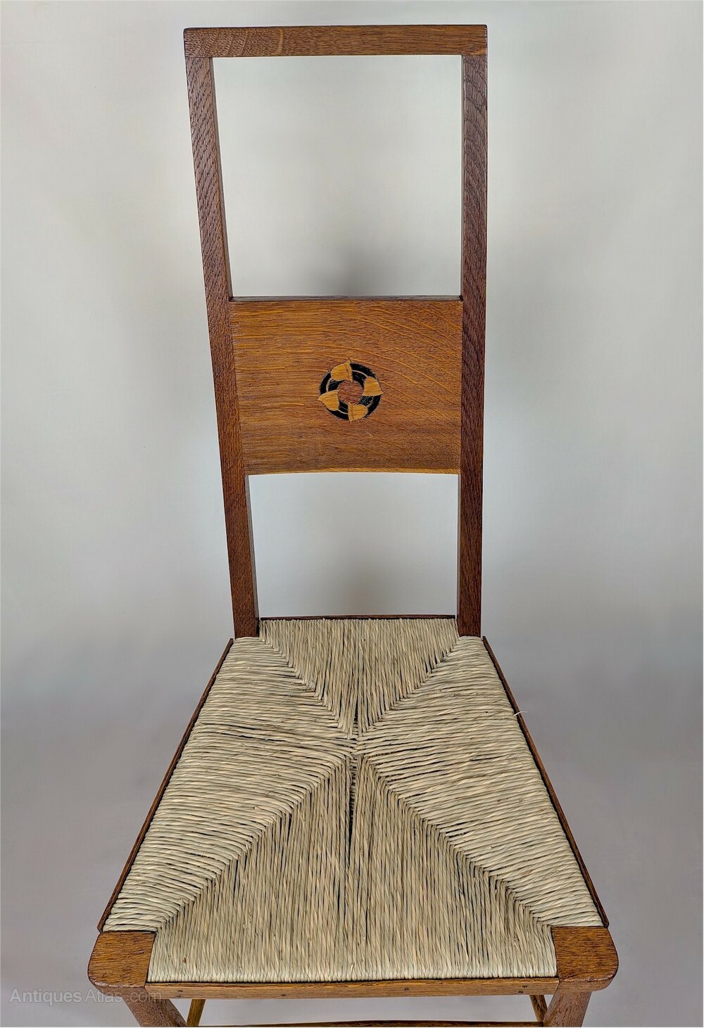 Elegant arts and crafts Scottish School , high back side chair in quarter sawn golden oak . The fine tapered and tapering back legs support an inlaid panel of 4 circular bells on an ebonised background and the chair seat tapers to the back. The chairframe has been tightened , refinished and re-rushed and is now strong and sturdy .