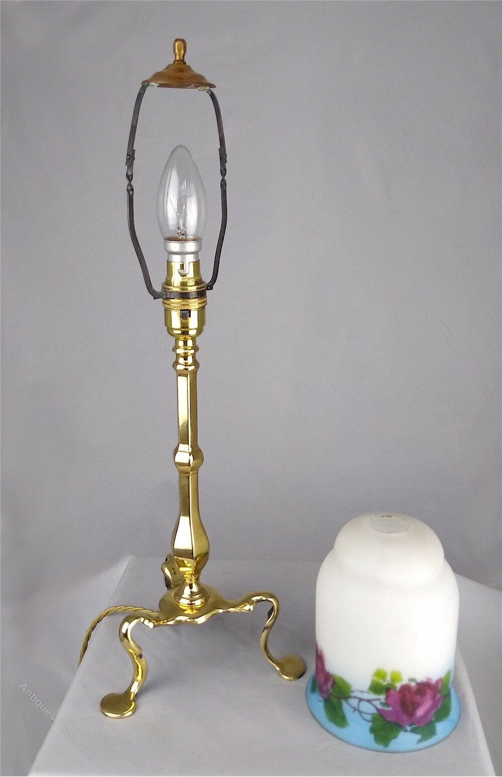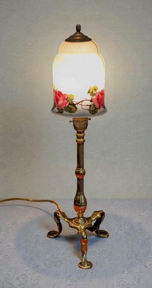 Pretty arts and crafts table lamp in brass , with milk glass shade , decorated with entwined briar rose .This has been polished and lacquered , rewired with silk cord , PAT tested and is ready to plug in .
