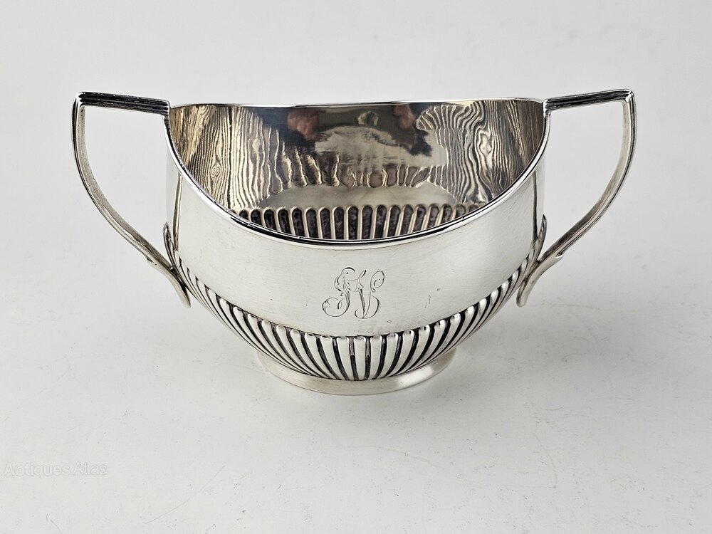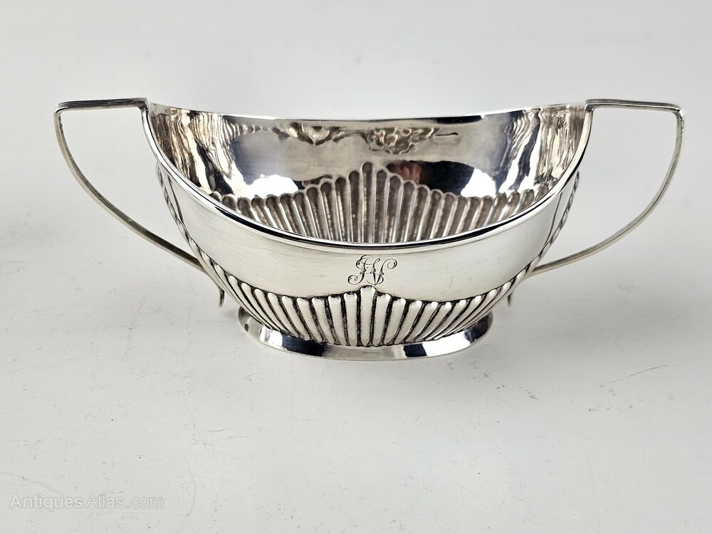 A lovely petite bachelor 4 piece Edwardian solid silver service, teapot, sugar, cream and sugar tongs in lovely condition. Teapot can hold two cups of tea. Hallmark date 1903 for Cornelius Desormeaux Saunders & James Francis Hollings (Frank) Shepherd. Trading from Bartlett's Passage, Holborn Circus, London subsequently Fetter Lane, London EC4