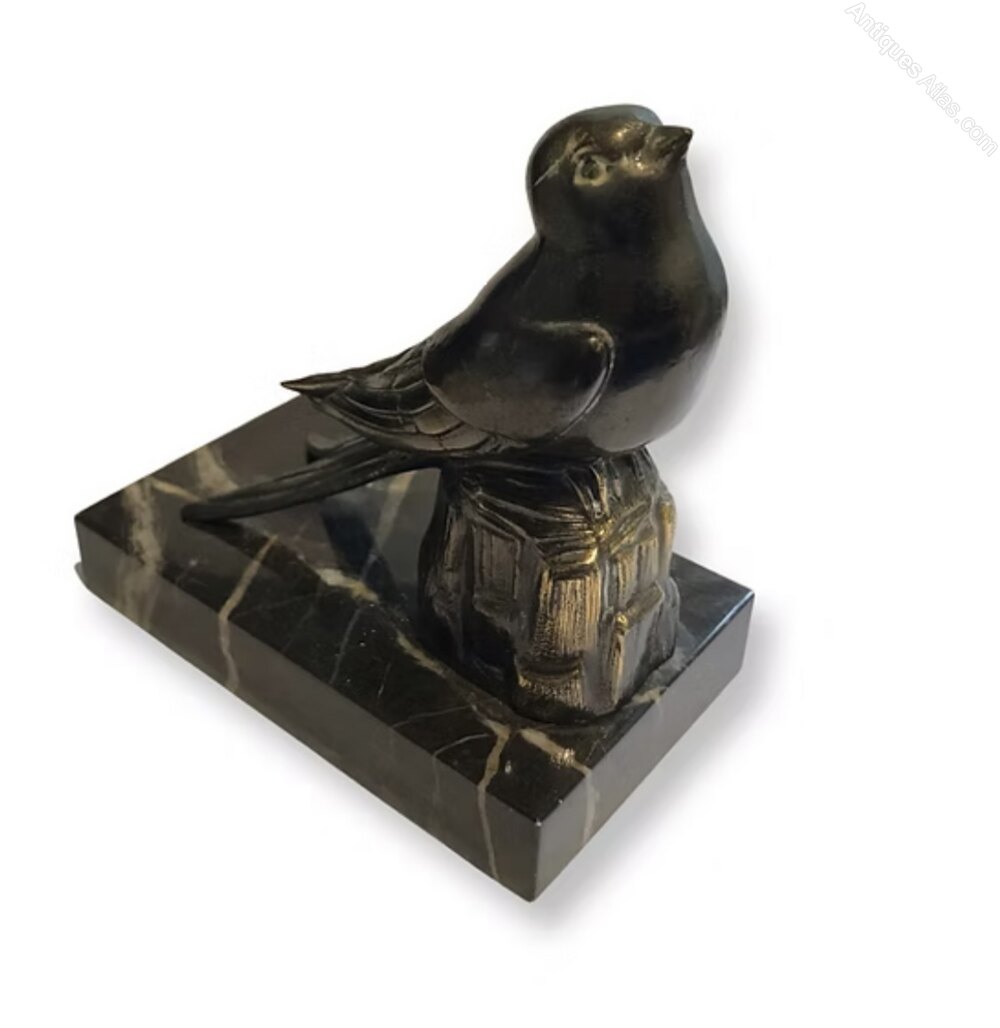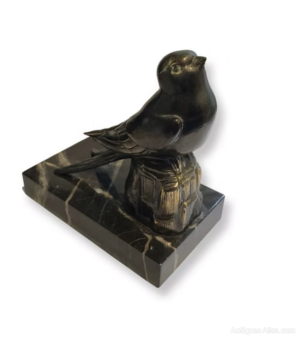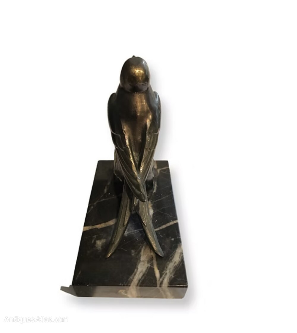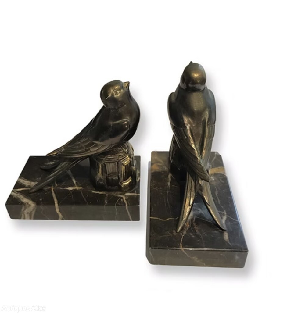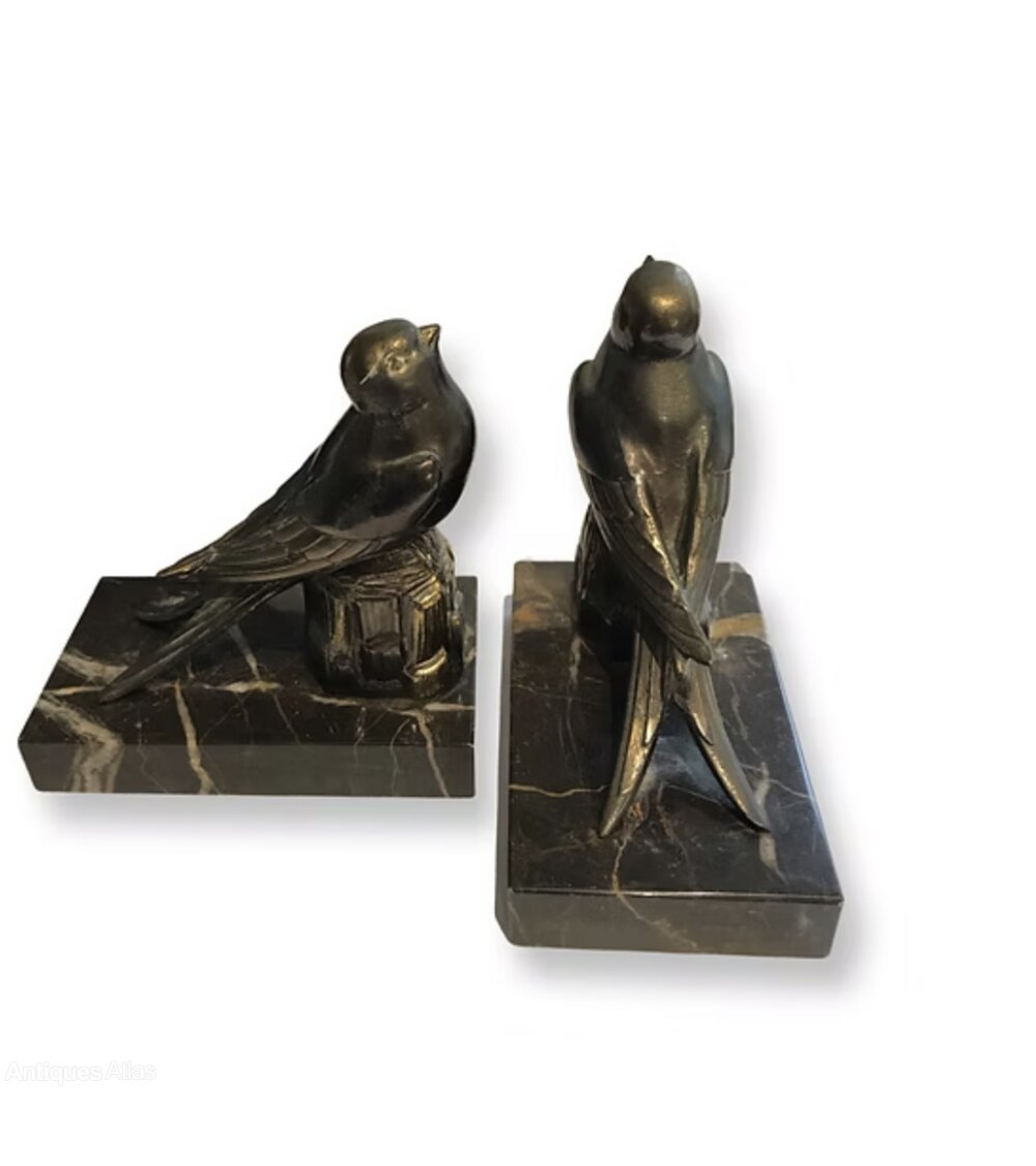 Beautiful pair of Art Deco bookends. Two well defined Spelter swallows sit proudly on a Spelter rock which is raised on attractive marble bases. The long elegant wings add an immediate touch of class. Perfect to display your favourite books between. All in very good original condition.