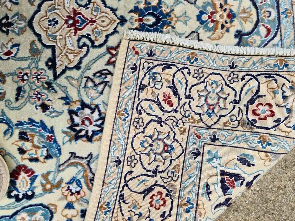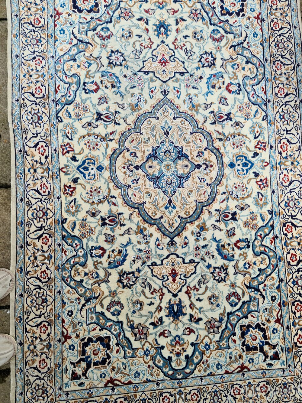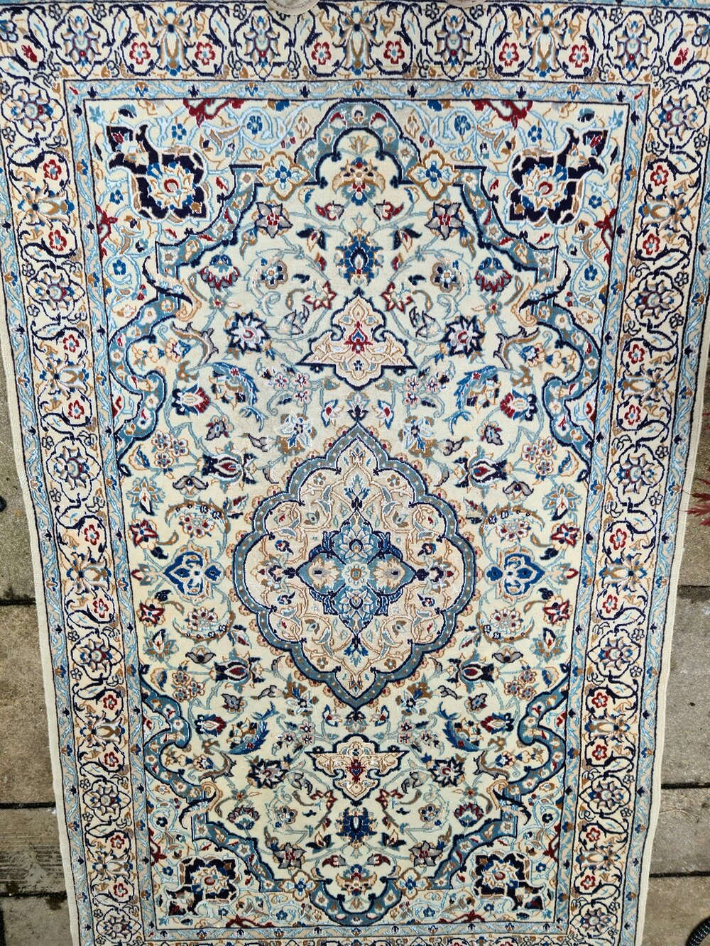 A beautiful vintage Nain rug in wonderful conditon. Beautiful colours with silk and medallion to the centre, rugs of this quality lift the ambience of any room.