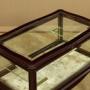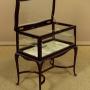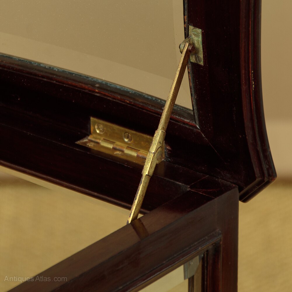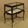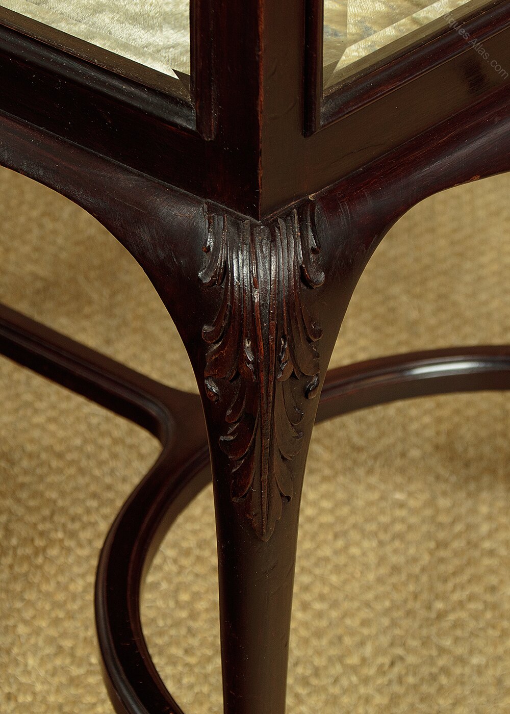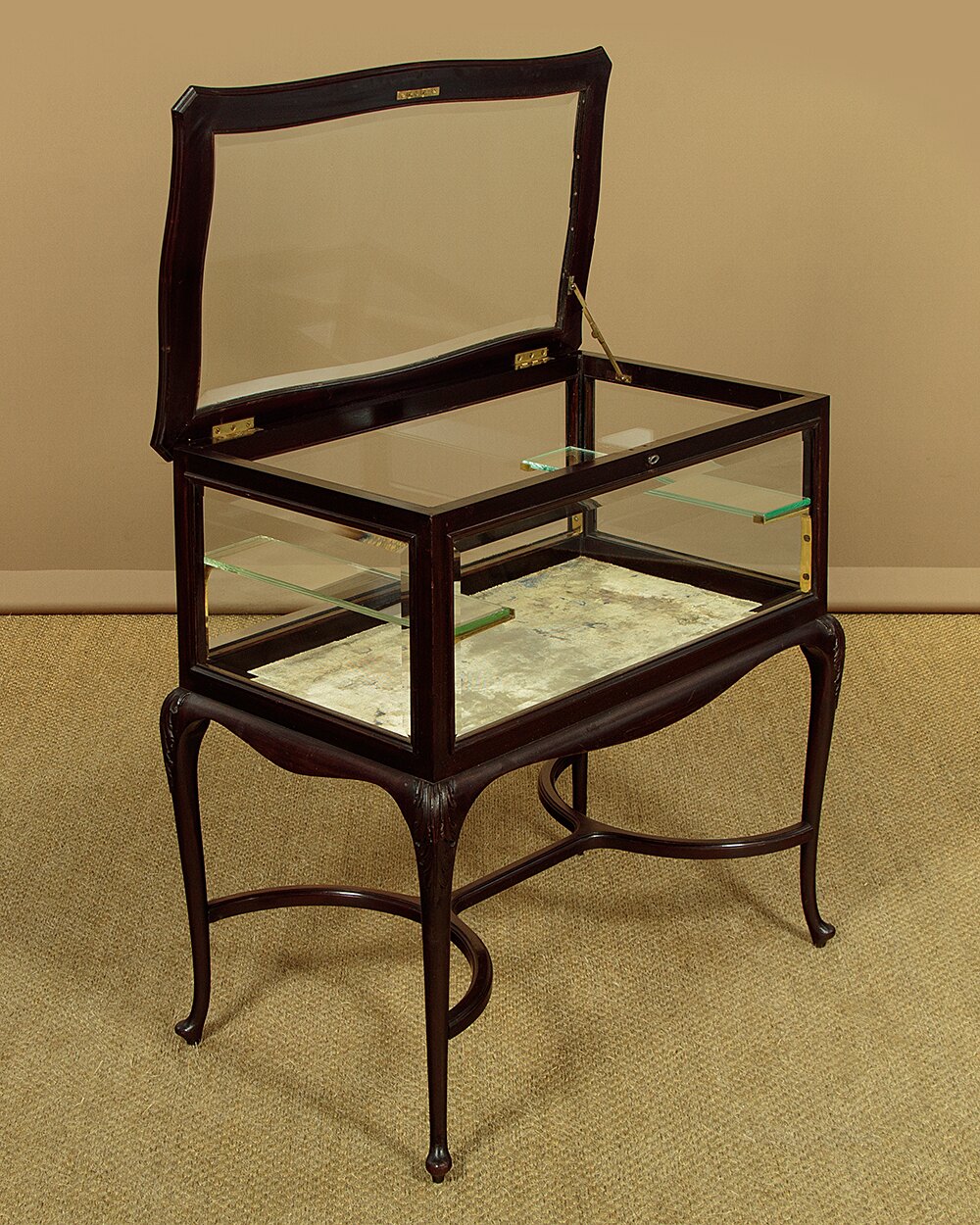 Mahogany bijouterie display table c.1920. Lockable display cabinet top, internal height 11½", featuring two small plate glass shelves inside and silver coloured velvet lining in the base. Of superior quality with bevelled glass panels to lid and all four sides, note also the heavy brass brackets for the shelves, the folding brass stay and hinges and the four lever lock. Dark mahogany frame with serpentine moulded edges to lid and a shaped apron all round. Slim cabriole legs with a carved acanthus detail at the knees, joined with bow shaped and moulded stretchers. Some marks to the finish on the lid. Otherwise excellent condition. Cleaned and waxed in our workshops. Key supplied.