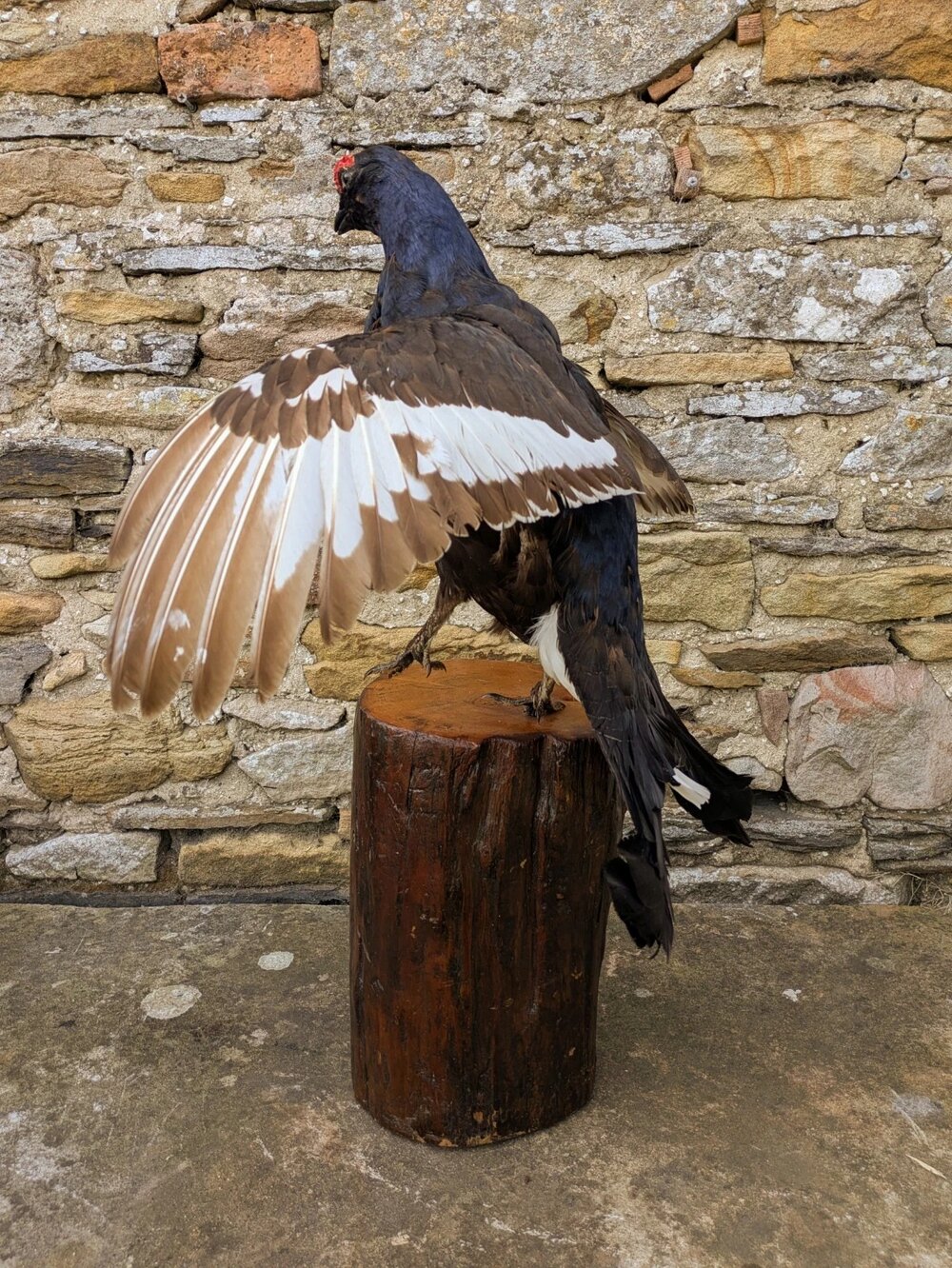 A good taxidermy model of a black grouse full mount adult cockbird in mating pose on one leg mounted on a large wood log.