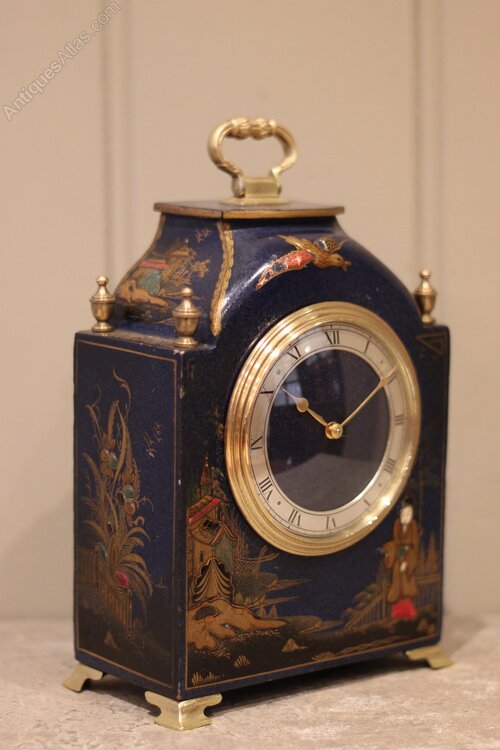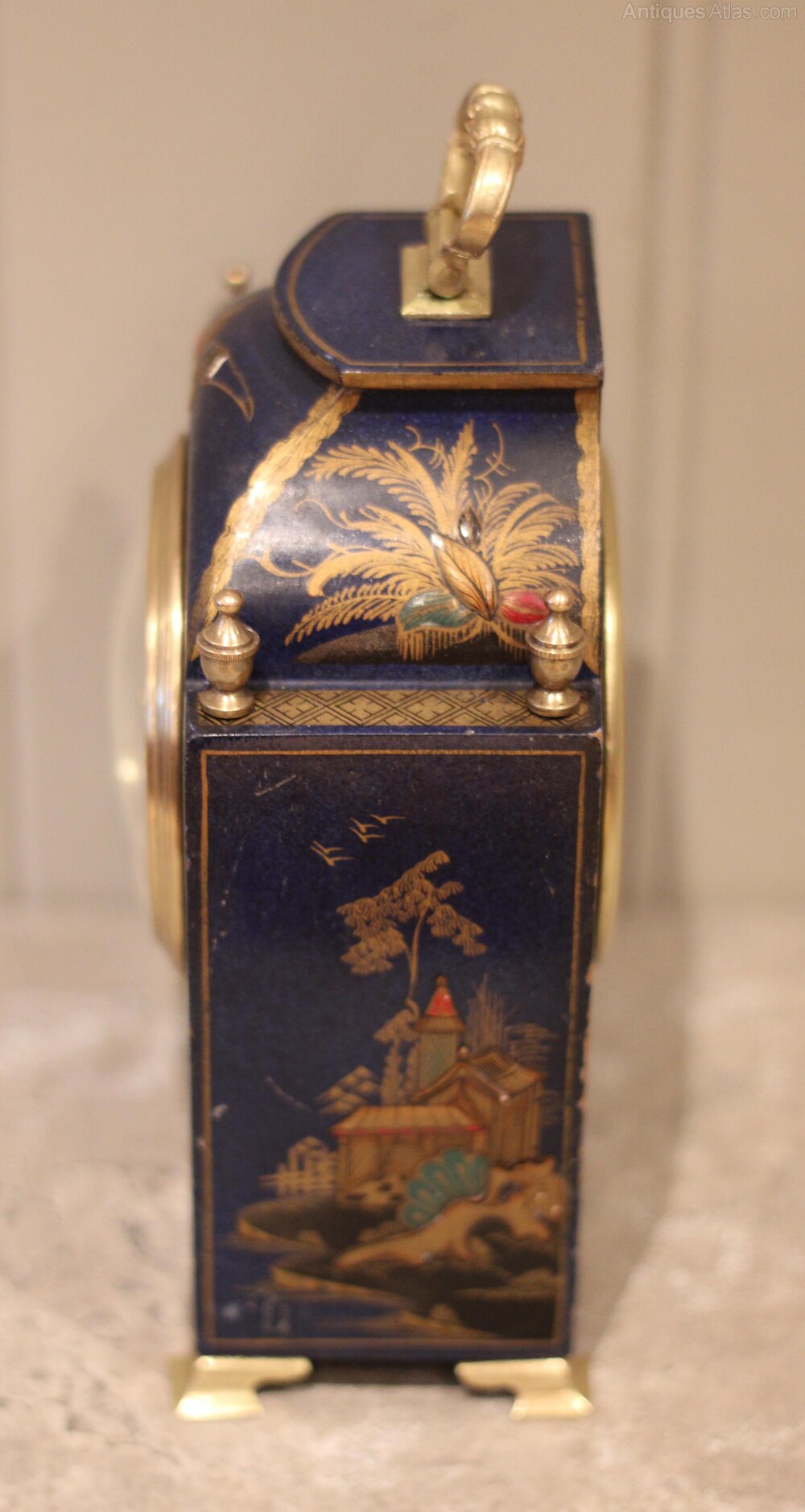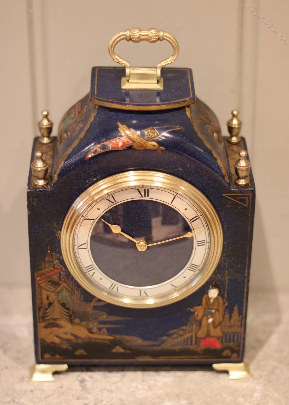 A small deep blue chinoiserie decorated mantel clock, in the style of an English bracket clock dating to around 1920. It has a caddy top with brass corner finials and an embossed carrying handle. The dial has a convex glass and a silvered chapter ring with a matching decorated dial , the detail depicts Chinese scenes, although the case is of English make and decoration. It has an 8 day French lever platform movement