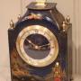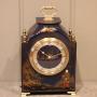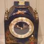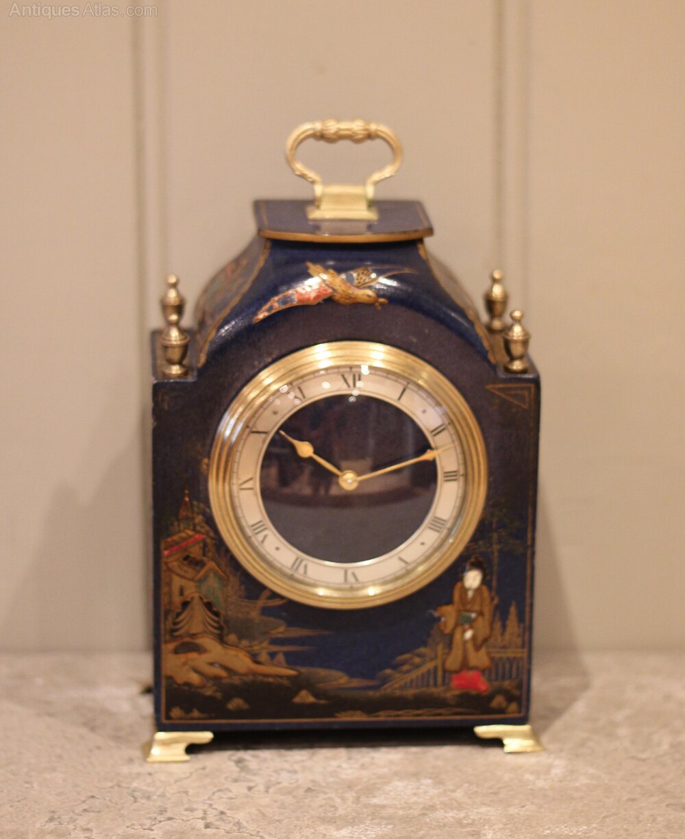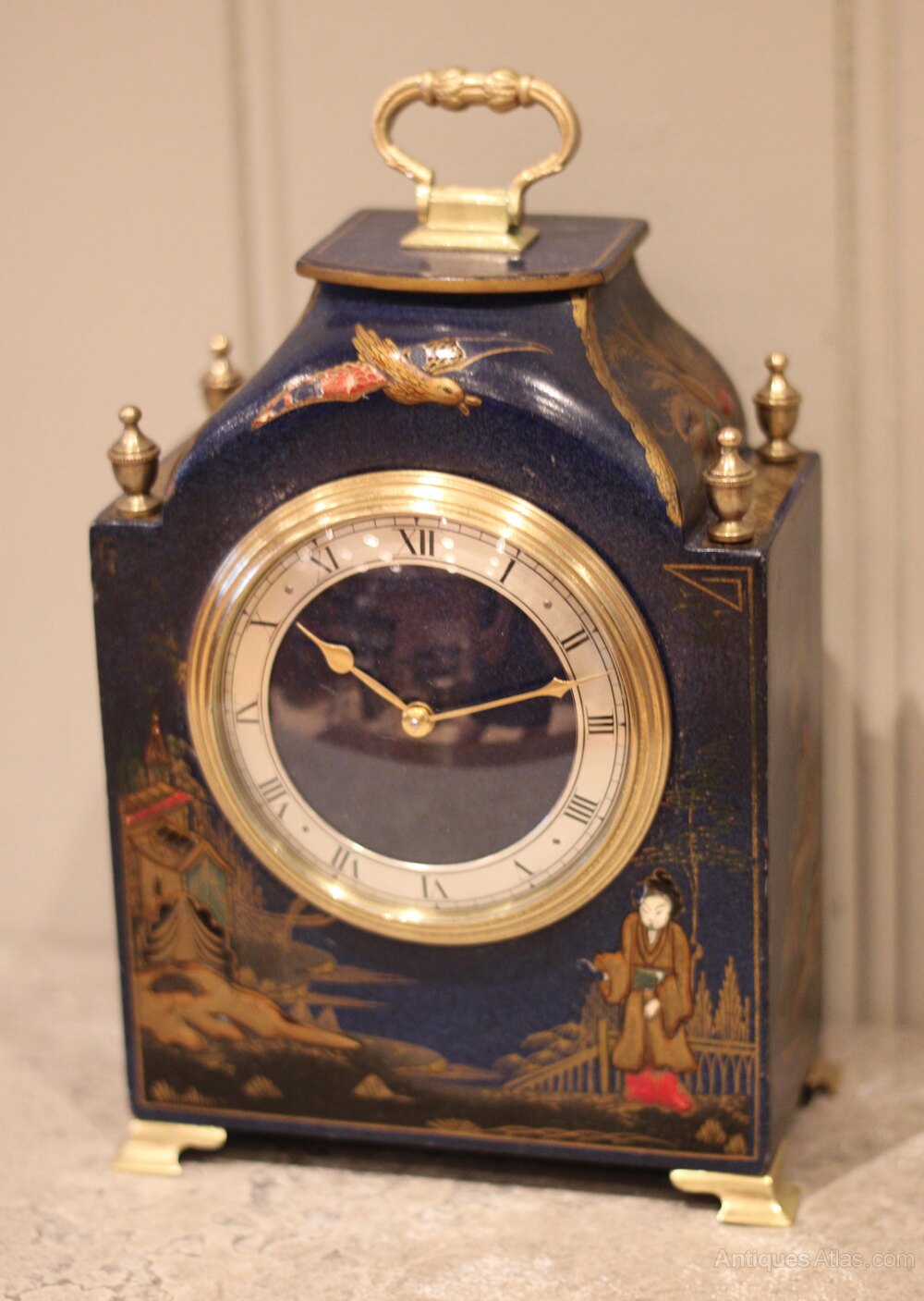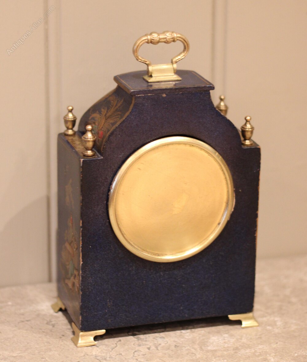 A small deep blue chinoiserie decorated mantel clock, in the style of an English bracket clock dating to around 1920. It has a caddy top with brass corner finials and an embossed carrying handle. The dial has a convex glass and a silvered chapter ring with a matching decorated dial , the detail depicts Chinese scenes, although the case is of English make and decoration. It has an 8 day French lever platform movement