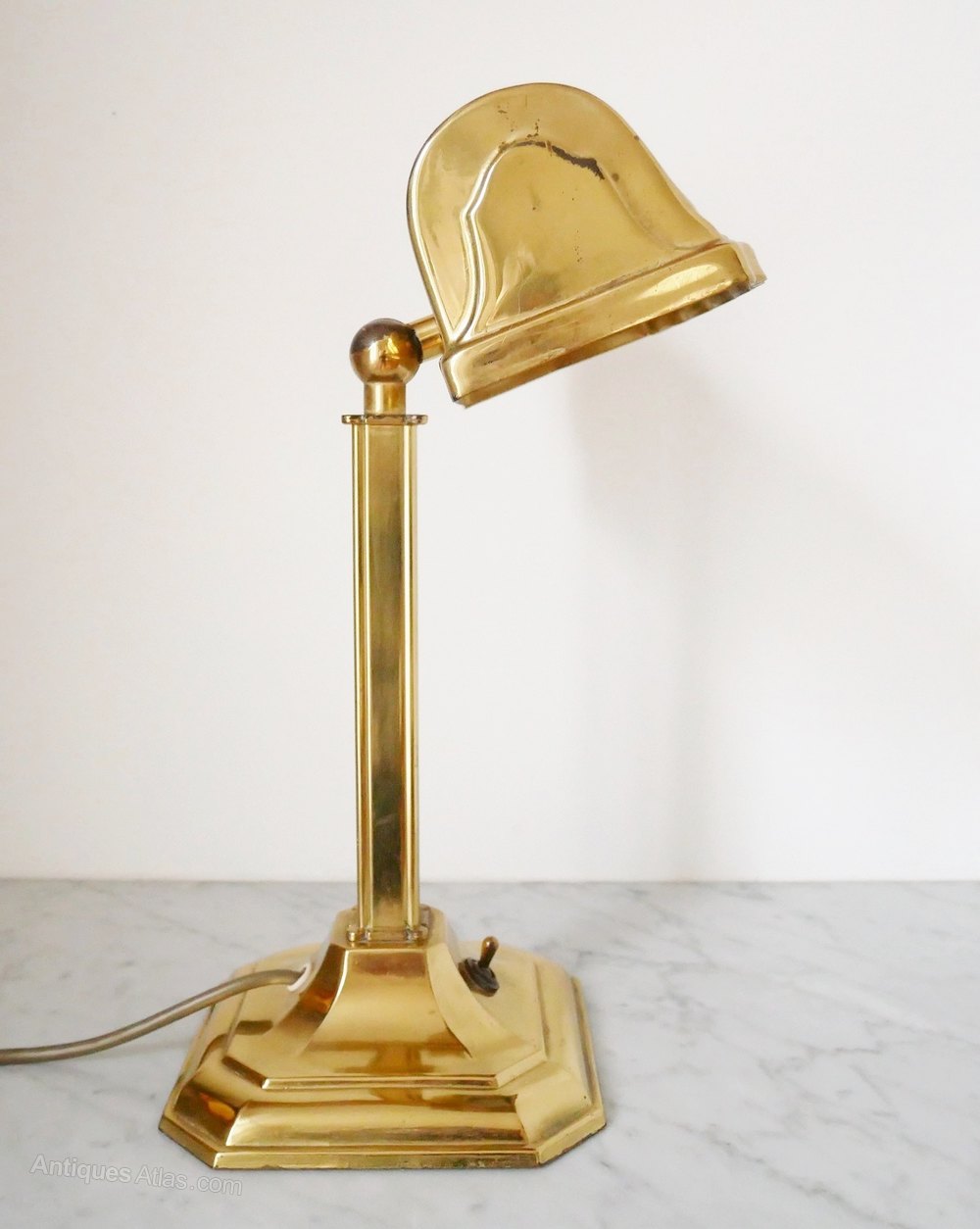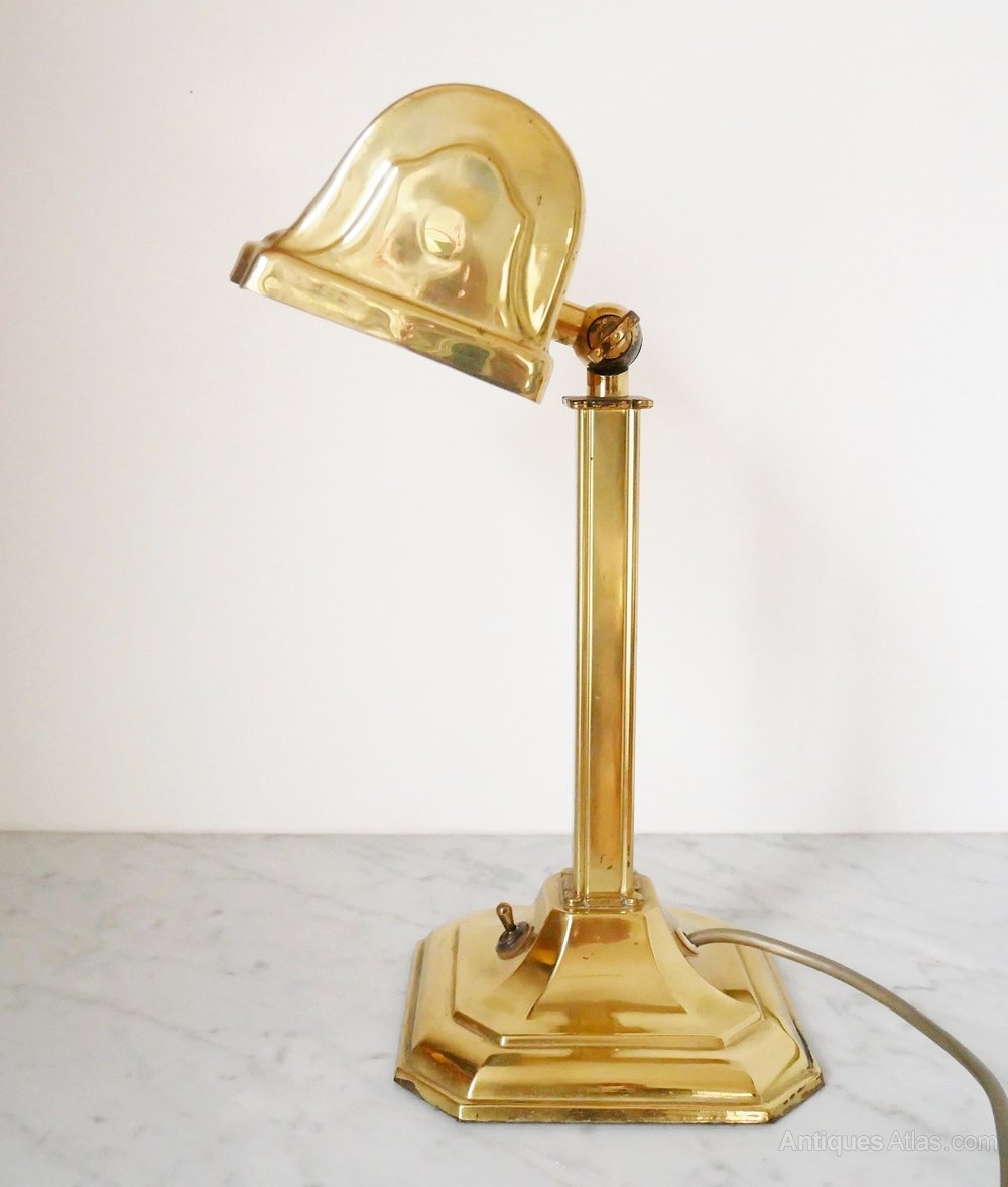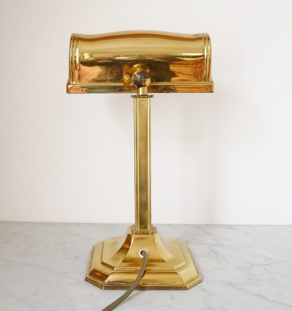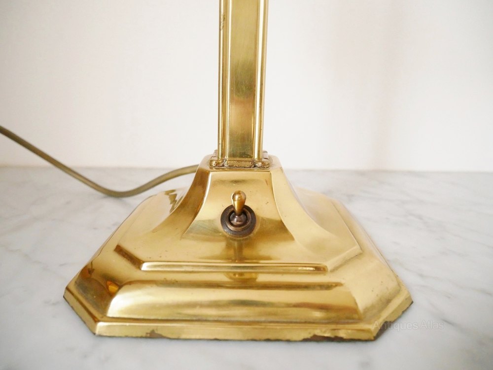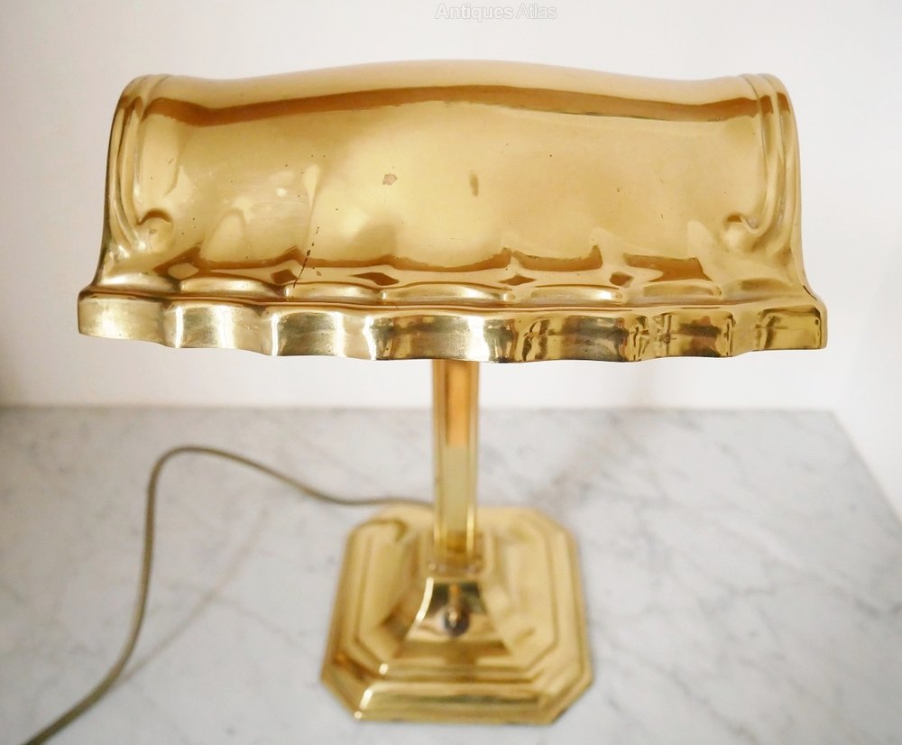 This heavy brass library desk lamp is of a good height and presented in desirable original condition. A wonderful example with the scalloped shade, quite rare.