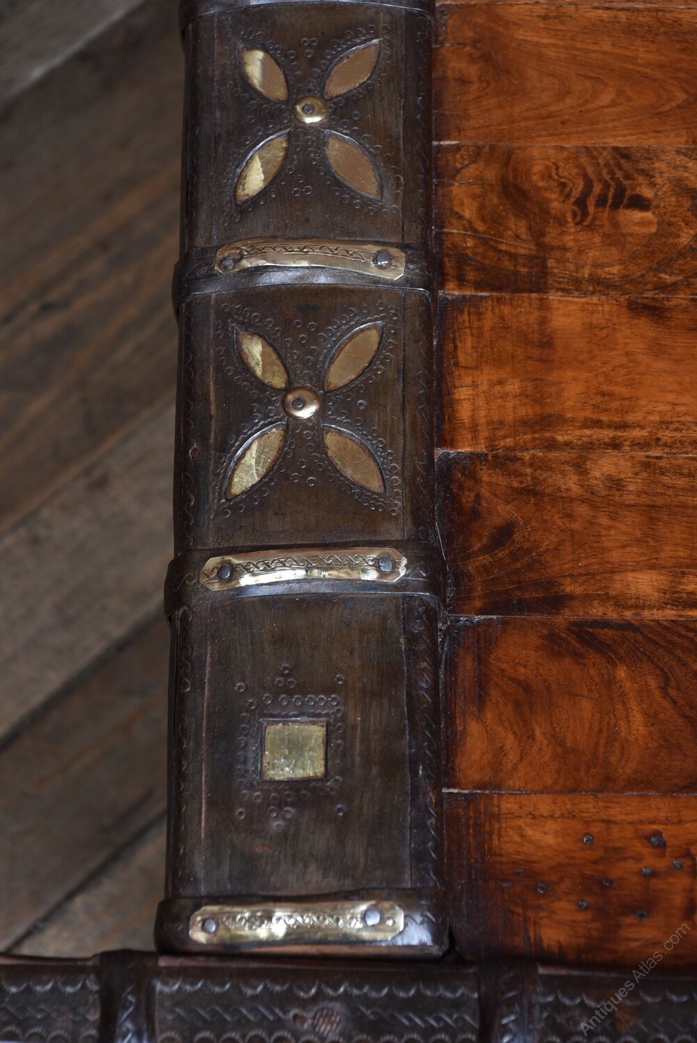 A bold and characterful table blending rustic charm with artisan craftsmanship. The rectangular top is formed from solid wooden planks, framed by riveted metal edging that adds both durability and industrial flair. Beneath, the carved wooden legs are a standout feature—each one adorned with intricate detailing and metal embellishments that speak to its handcrafted origins. The table’s robust proportions and tactile materials make it a versatile piece, equally suited to a dramatic hallway, a creative studio, or a statement dining setting. The aged patina and subtle imperfections only enhance its appeal, offering a sense of history and individuality.
