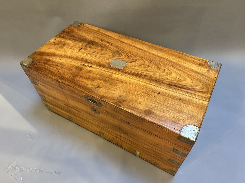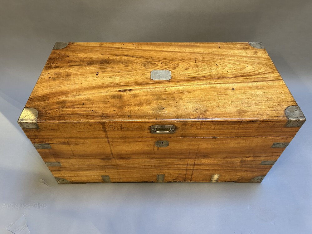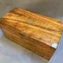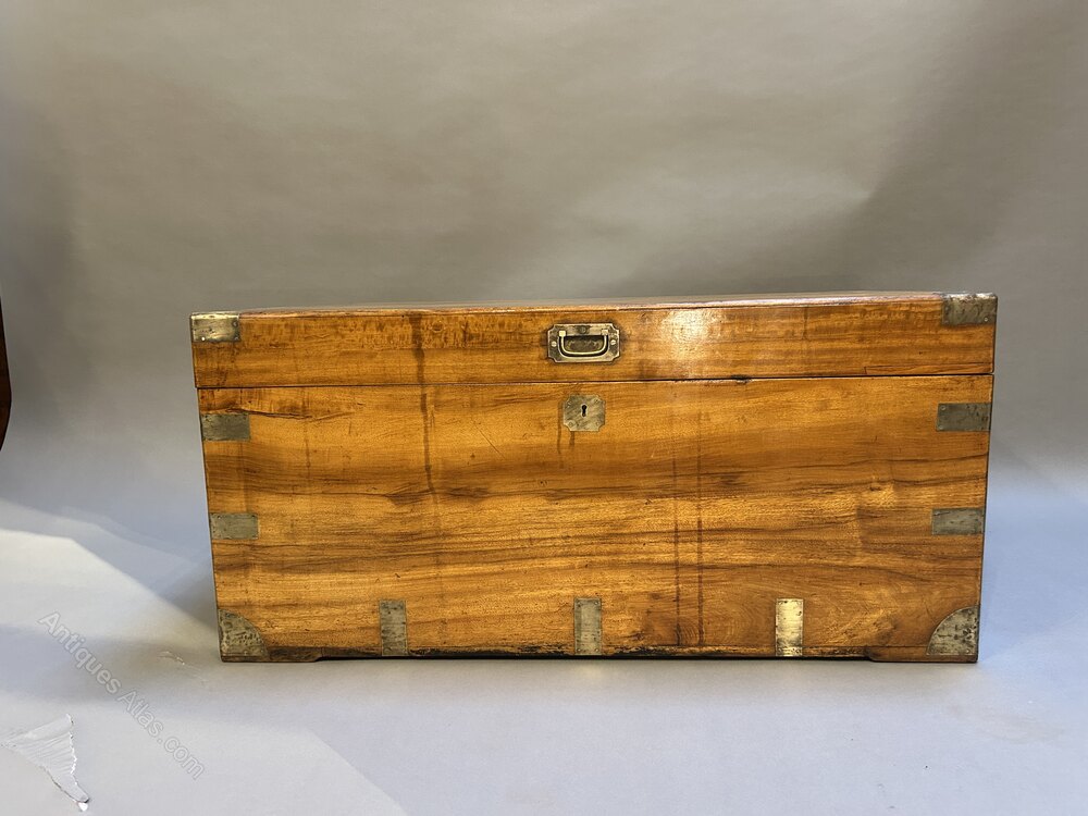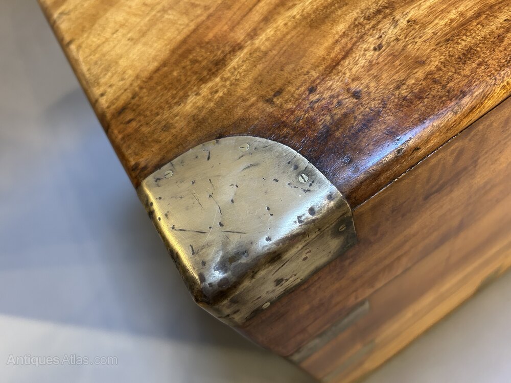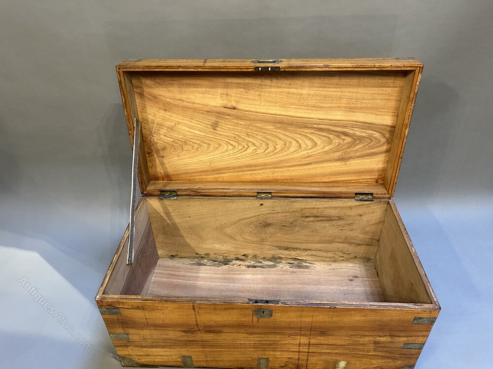 A quality example of good colour & figure, brass bound (screwed, not pinned), rising lid revealing vacant interior with brass carrying handles to each side.