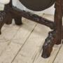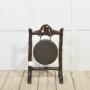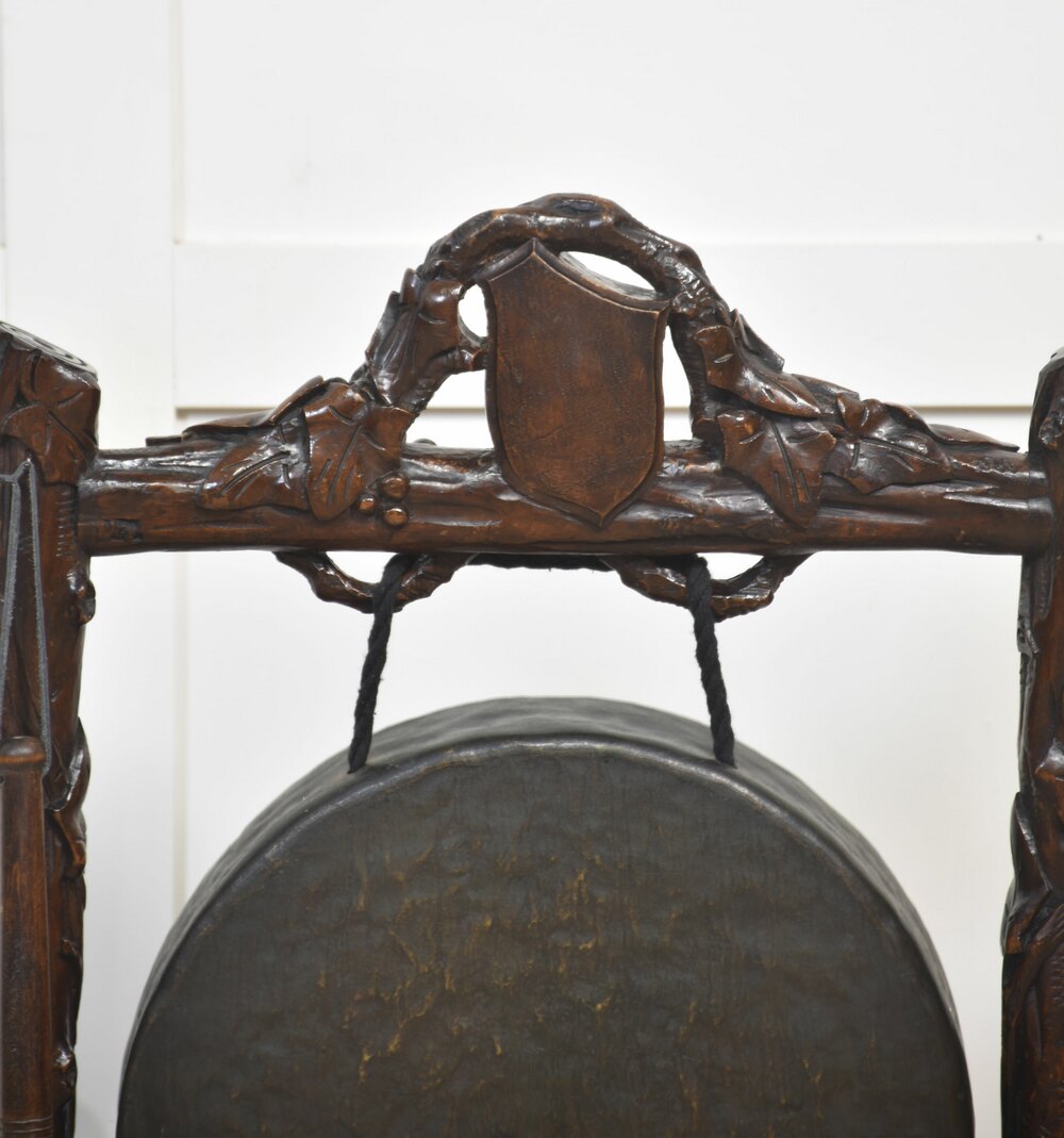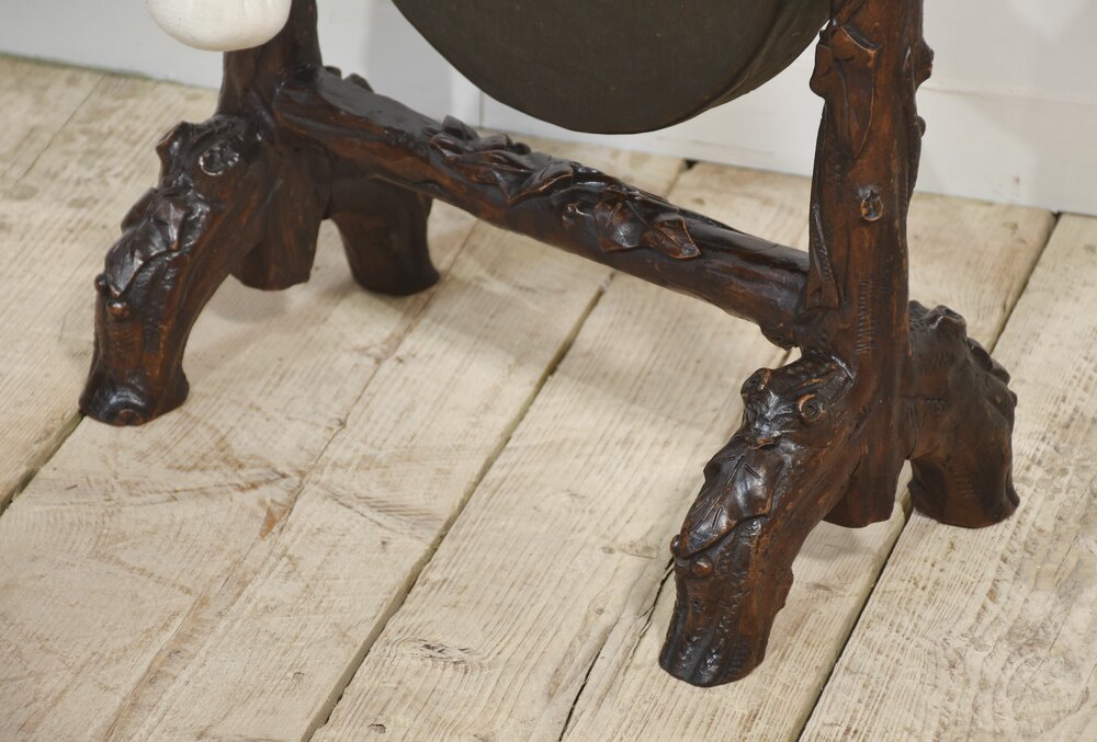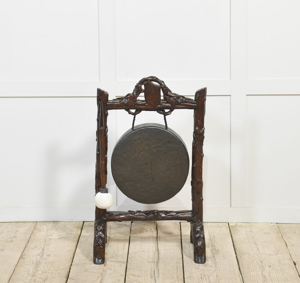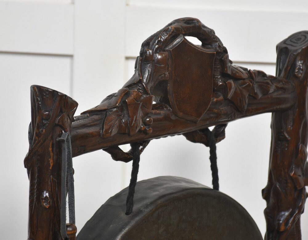 Late 19th century dinner gong, the circular gong suspended in an oak frame of naturalistic branch design with vacant cartouche surmounting between conforming uprights and downswept supports.