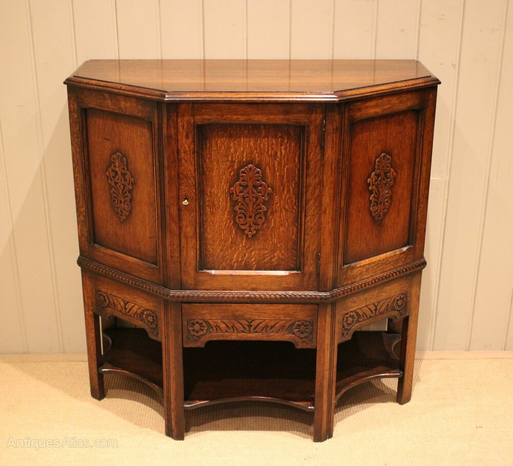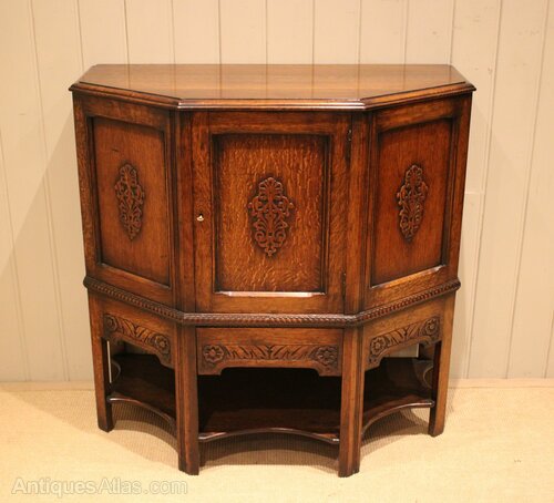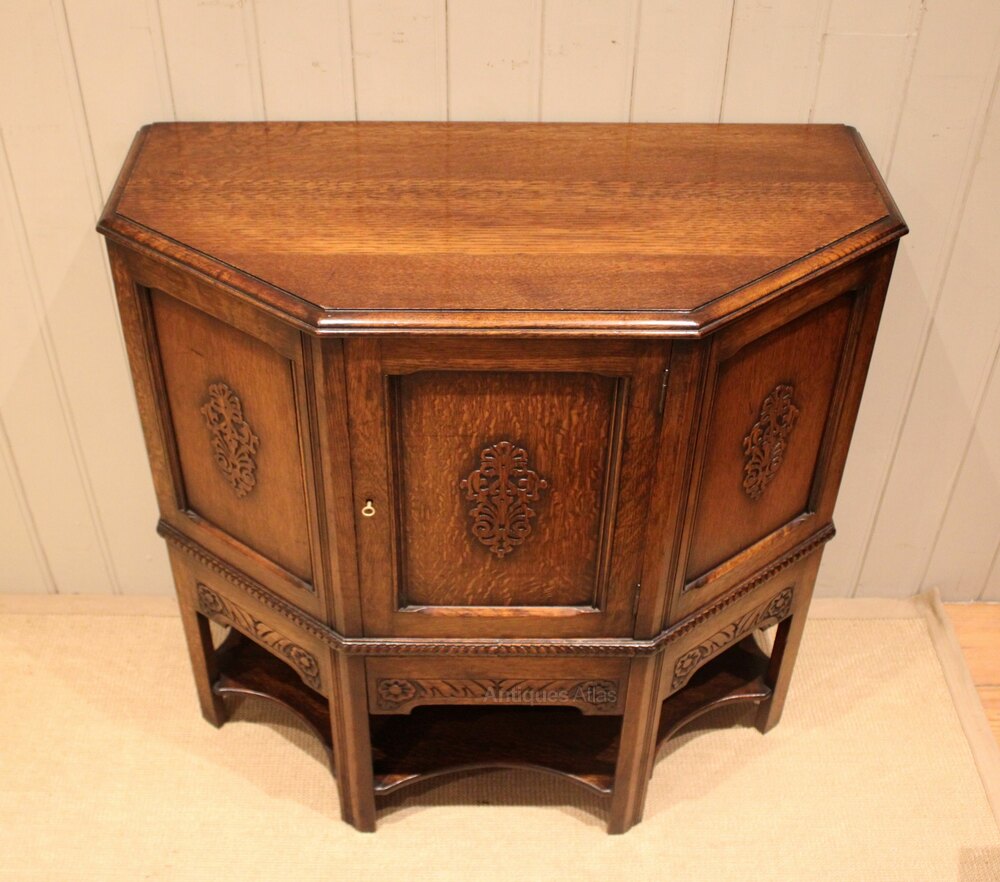 Solid oak cabinet having canted corners with three carved panels to the front , having a carved apron to the base , one of which is a drawer , fitted internally with a curved shelf , raised on straight supports .
