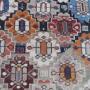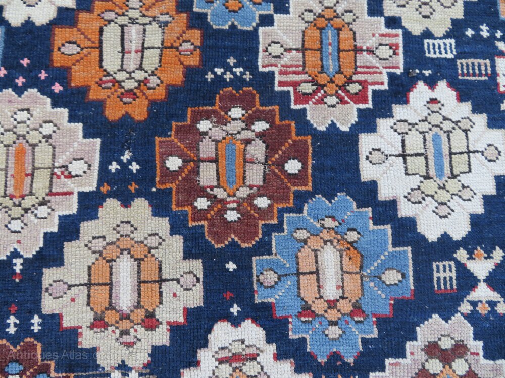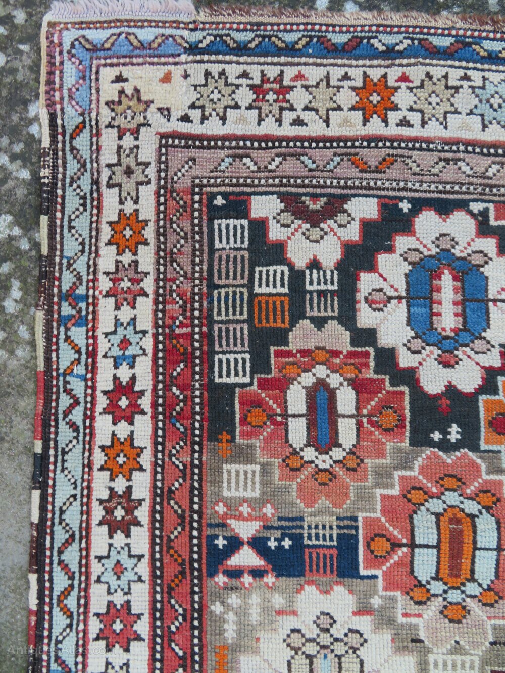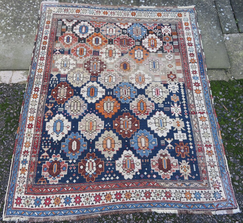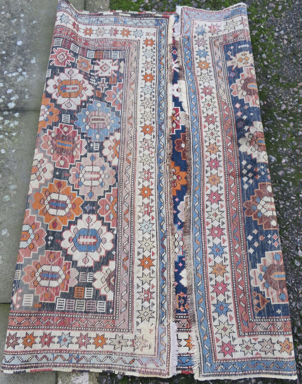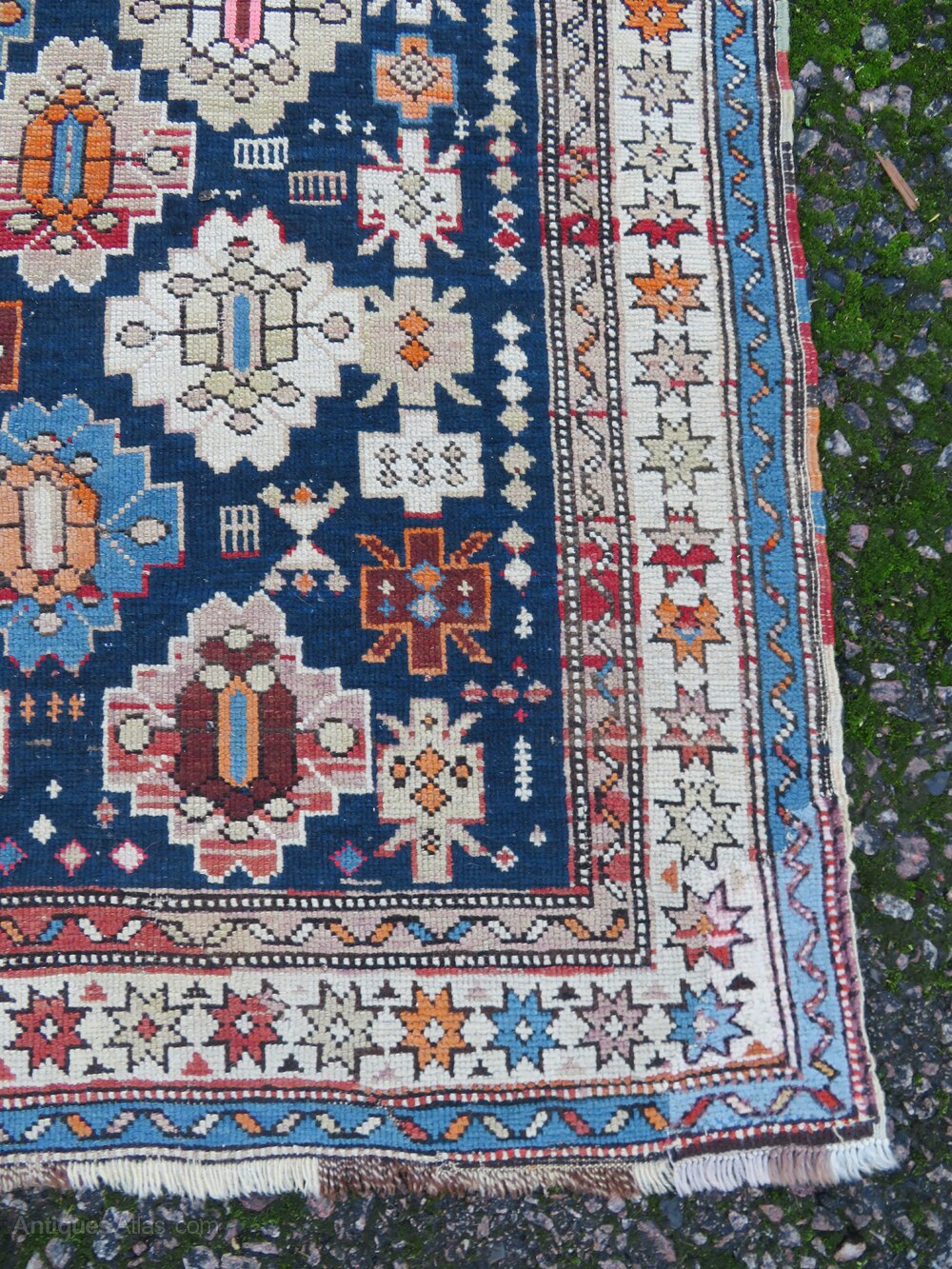 1910s kuba rug. With a kind of a star shaped pattern on a dark blue ground. Alternating coloured side bindings. Some light wear but overall for a rug over 100 years old not bad. There are many detailed images to look at. U. K post £16. Cheaply priced. Size is 4 foot 10 inches by 3 foot 11 inches. 148cm X 120cm. At widest points, all wool construction. Tob 20.