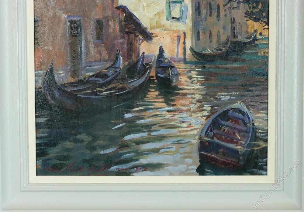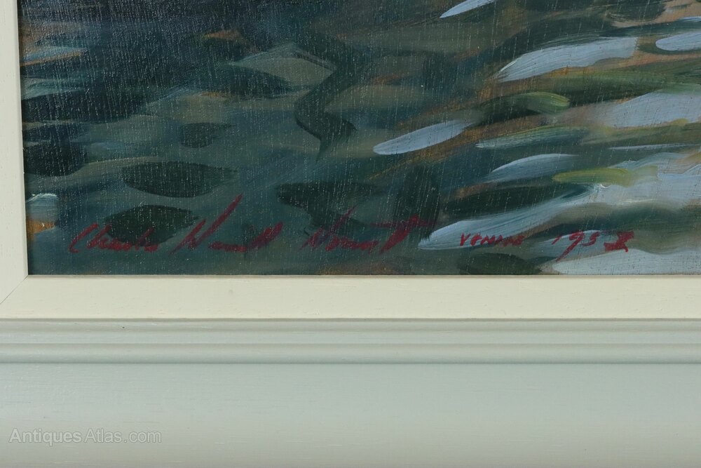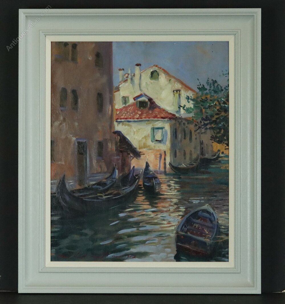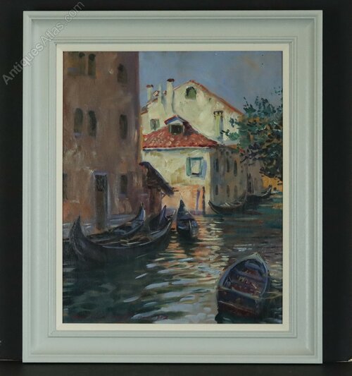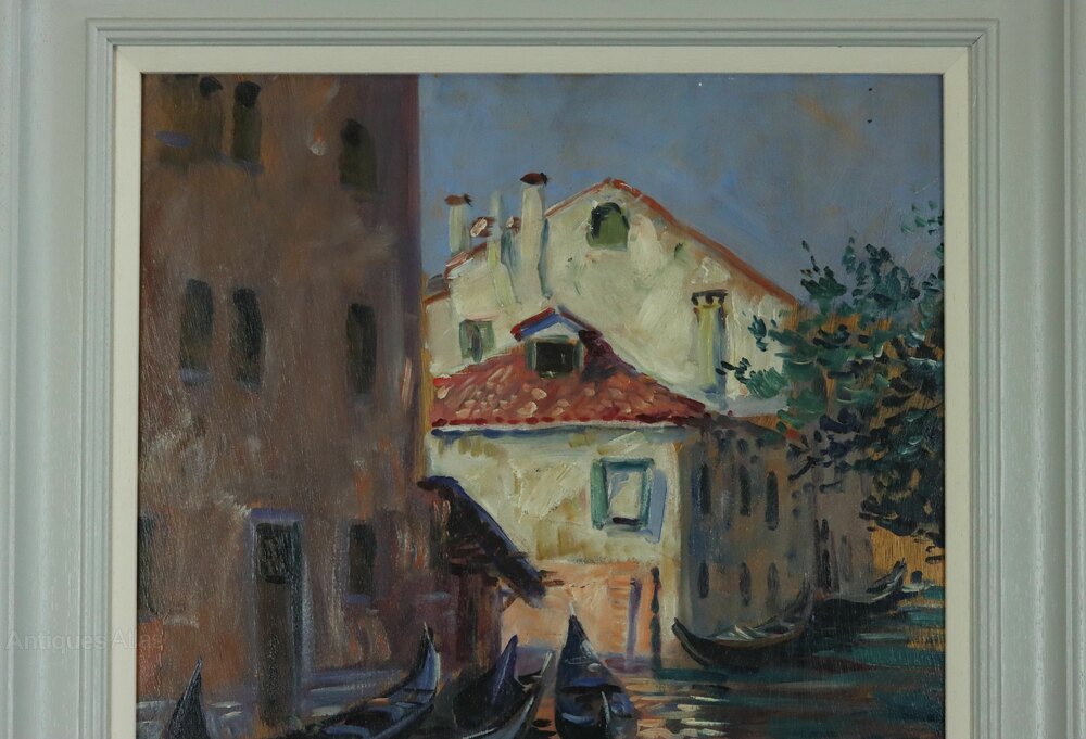 A fine mid-century post-impressionist style oil on board painting of a Venetian canal with gondolas by the American artist Charles Merrill Mount (1928 - 1995), signed and dated 1958. Mount has a good record of works sold on the secondary market, particularly in the USA, with prices usually exceeding $1000. The label on the reverse for Combridge Ltd, Fine Art Dealers and Picture Framers , based at 18 - 20 Grafton Street and 1a Duke Street, Dublin neatly ties in with Mount's move to Ireland in 1961 where he married and fathered four children. By the end of the 60s he had separated from his wife and returned to New York City.