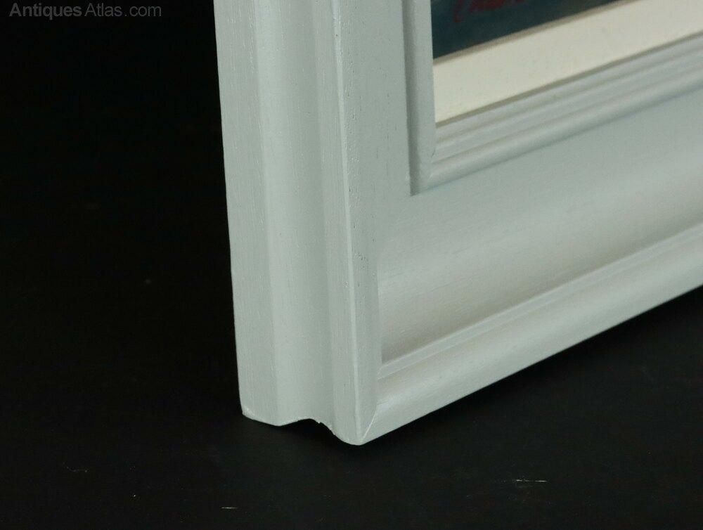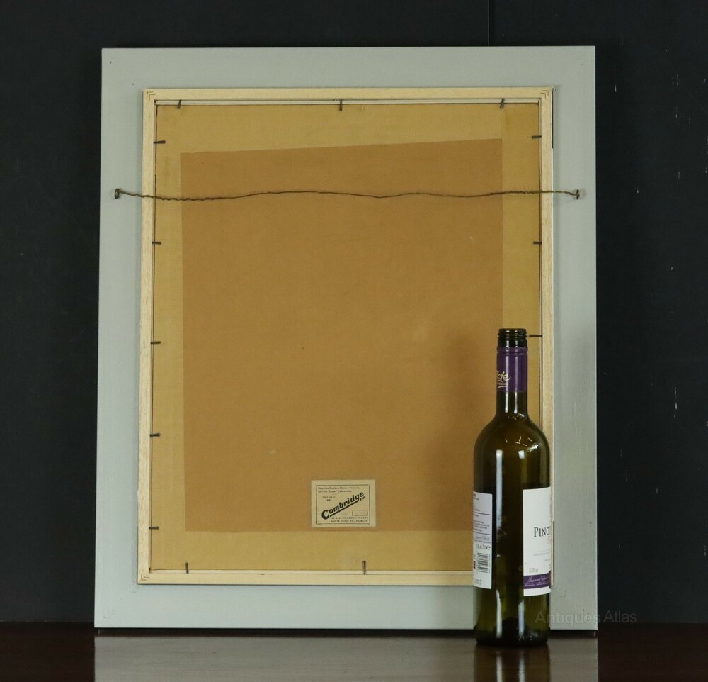 Condition: The painting has been reframed in a bespoke hand-painted wooden frame with inner ivory coloured wooden slip. The wide outer frame has been finished with several coats of Farrow & Ball Lamp Room Gray Estate Eggshell for interior wood. The framer's label was removed from the original frame (now discarded due to poor condition) and re-attached to the reverse.