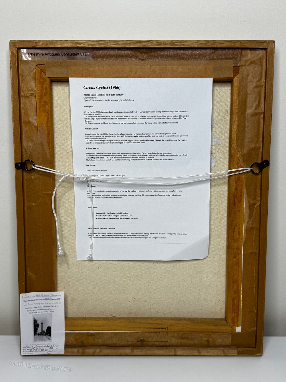 Circus Cyclist embodies the poetic essence of Lyrical Surrealism, where stillness and fantasy serve as metaphors for inner reflection. Eagle’s combination of compositional precision and emotional restraint makes the work a compelling meditation on post-war introspection—the moment of silence after spectacle, the fragile balance between control and reverie.