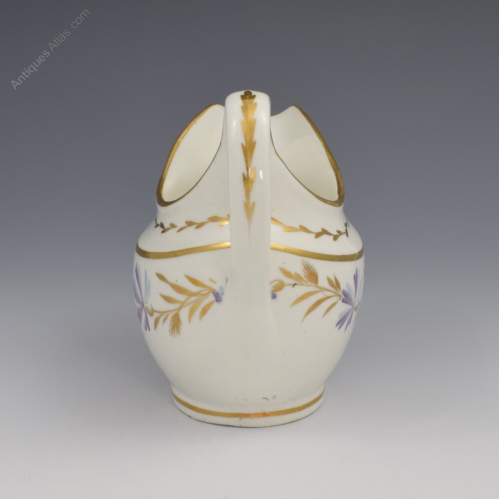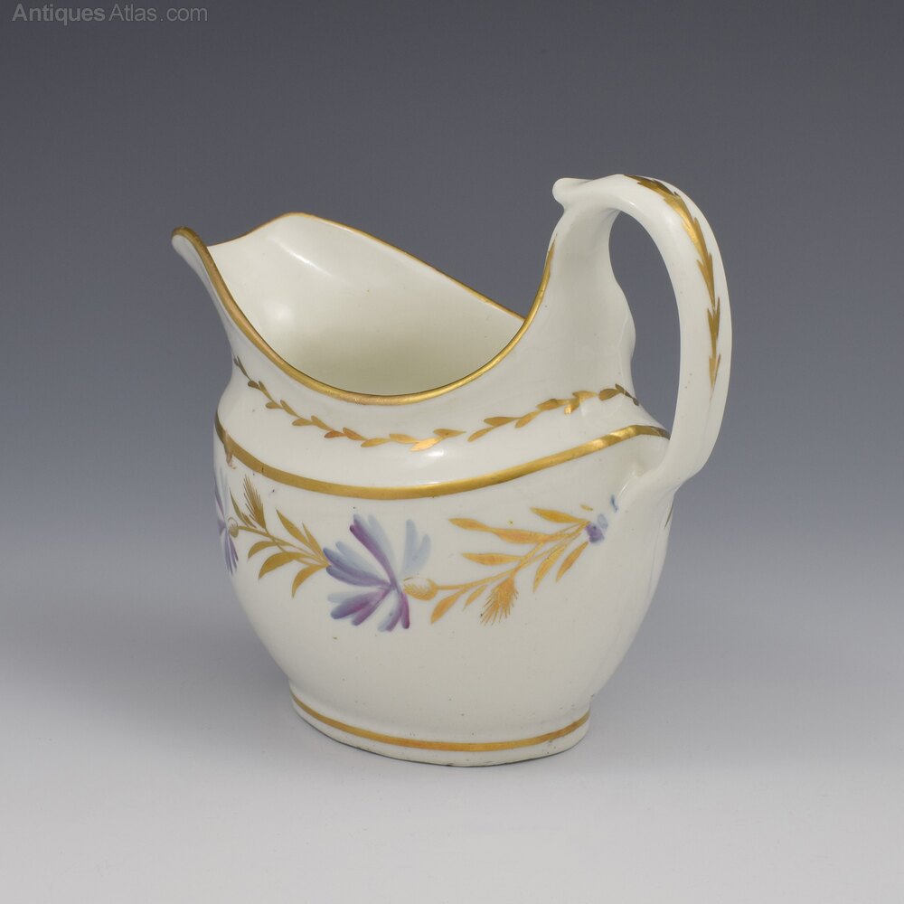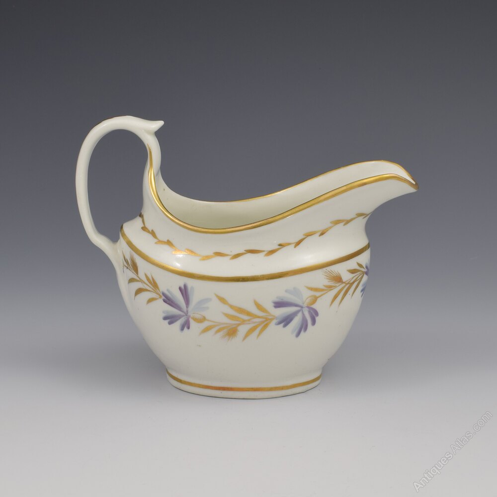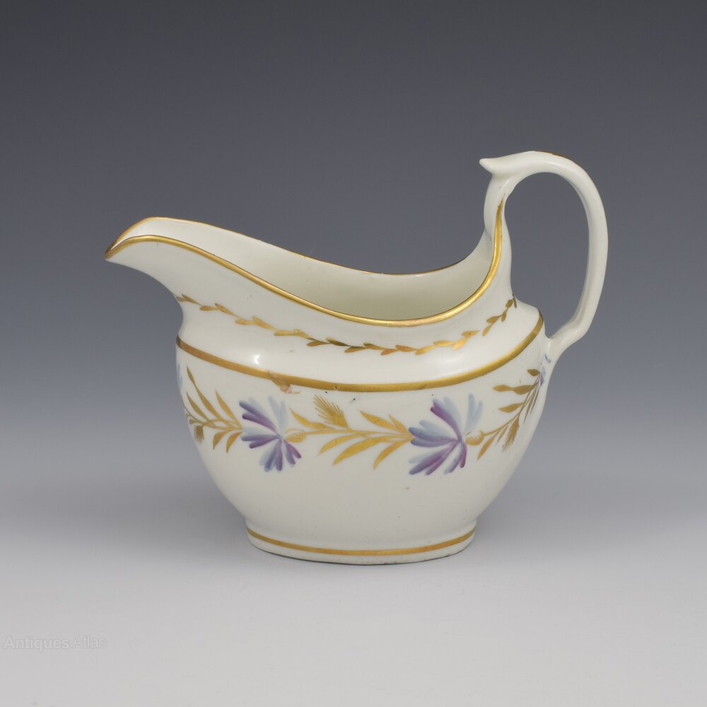 A pretty Georgian bone china porcelain milk jug, of boat form with distinctive raised strap handle with sharply angled inward step at the bottom and flattened thumb rest sitting just below the top of the handle. A broad running frieze of stylised cornflowers, loosely painted with sky blue and violet enamel and delicate gilt stems, buds and feathery foliage. Further gilded bands around the foot, shoulder and rim and foliate border running below the rim and up the handle. Unmarked, attributed to Coalport (John Rose), teawares of Class D type, c.1807-1810.