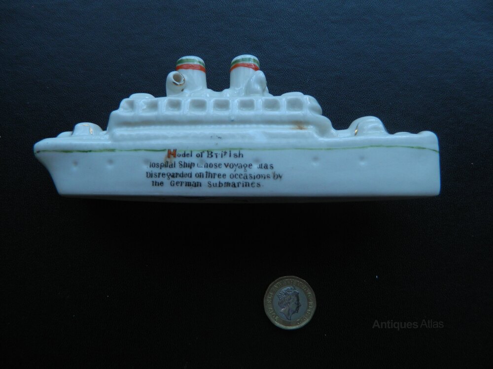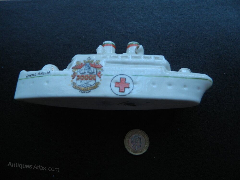 A larger than normal crested ware ship model of H.M.S.Anglia.by Carlton China. The town represented is Chatham.The Anglia was a hospital ship that was disregarded by German Submarines three times.There are no chips or cracks.Post will be £4.99.
