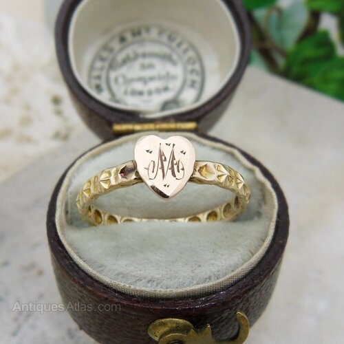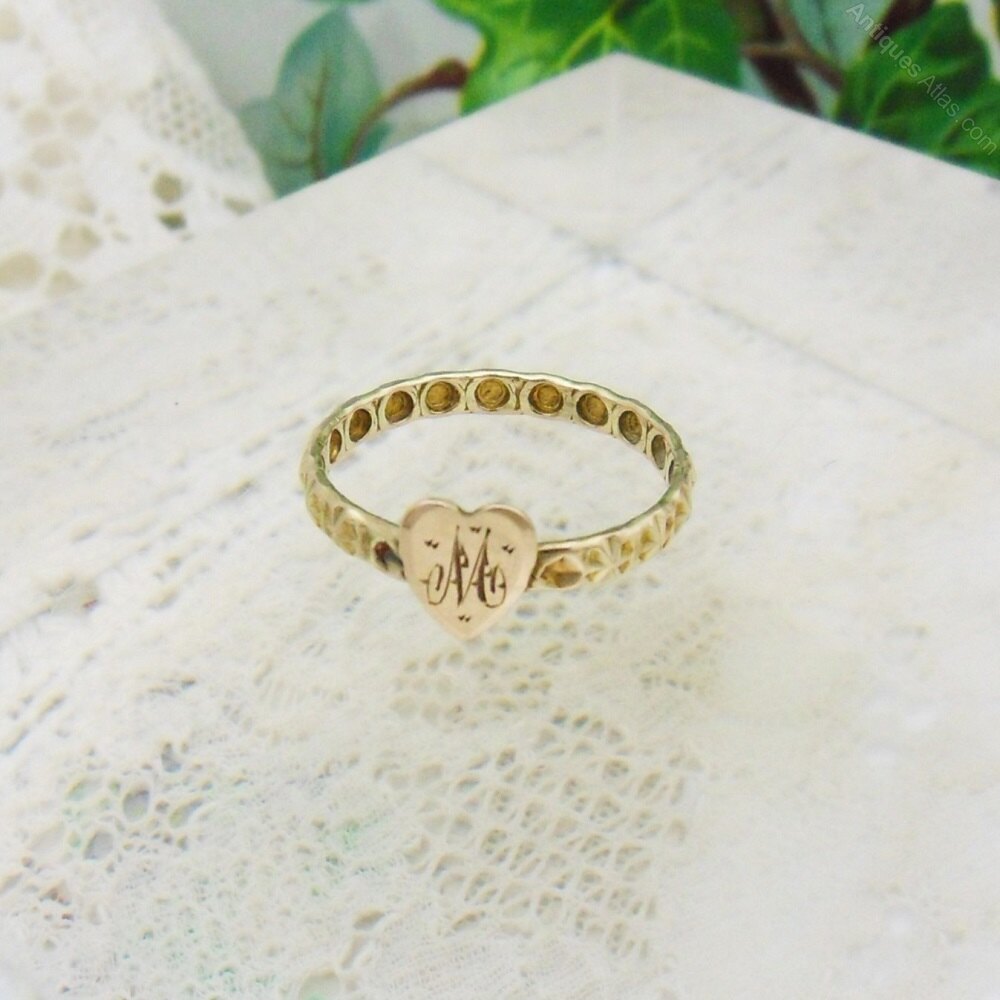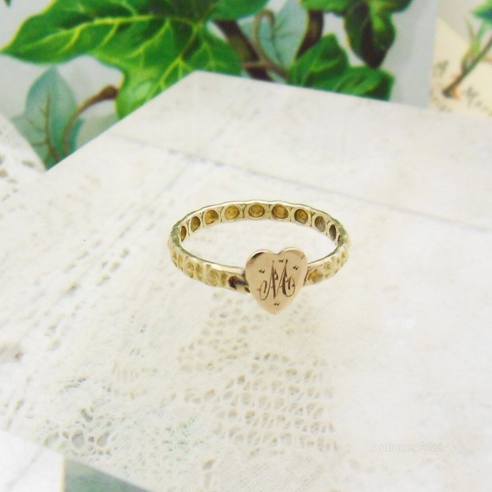 Dainty 9ct heart motif ring engraved 'M' 1900