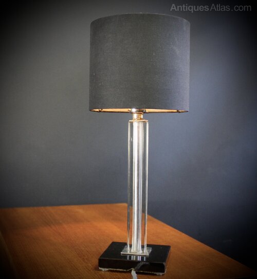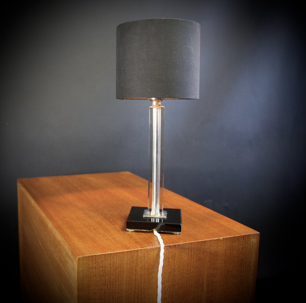 Deco table lamp with black glass base. Clear glass stem on square black glass base, re-wired with white silk woven flex. Minor chip to corner of base. Measures 28 cm to top of bulb holder x 9.5 cm square