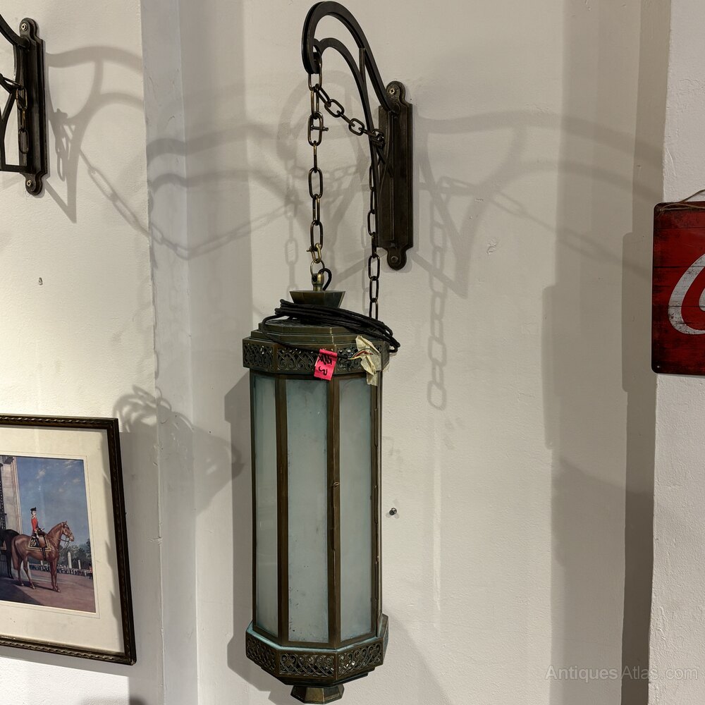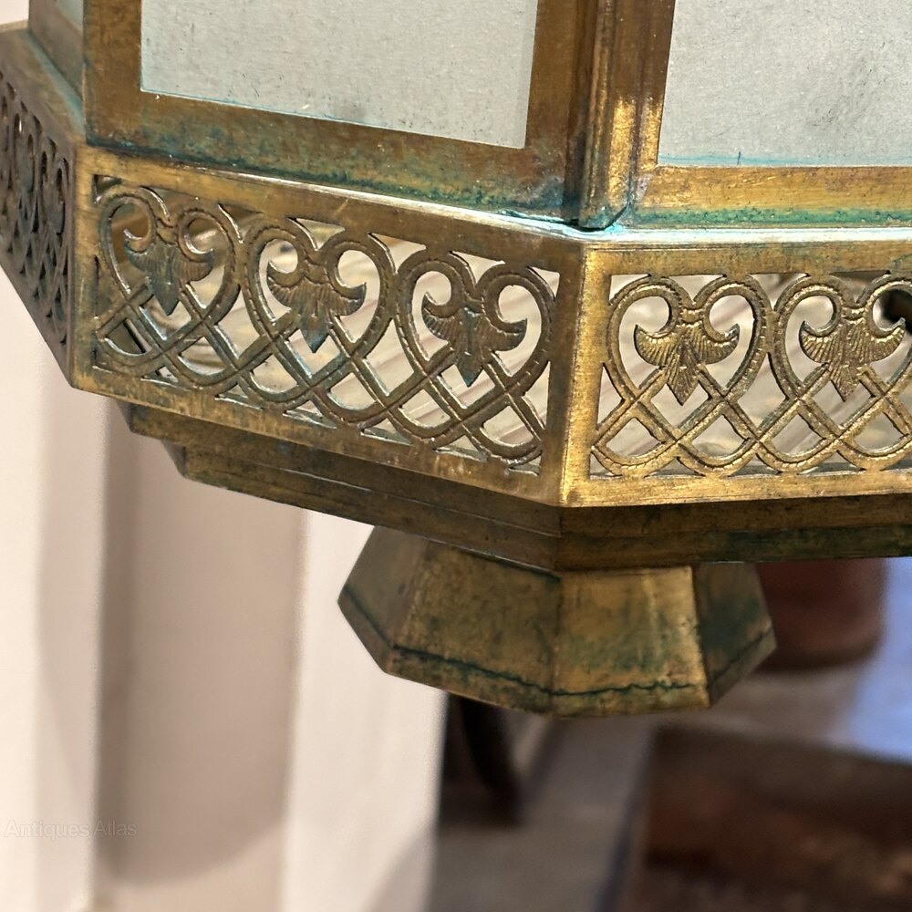 A striking early 20th-century hanging lanterns, crafted from brass with glass panels set within an octagonal frame. Each lantern features intricate pierced brass gallery bands with repeating scroll and foliate motifs, complemented by their original patinated finish.