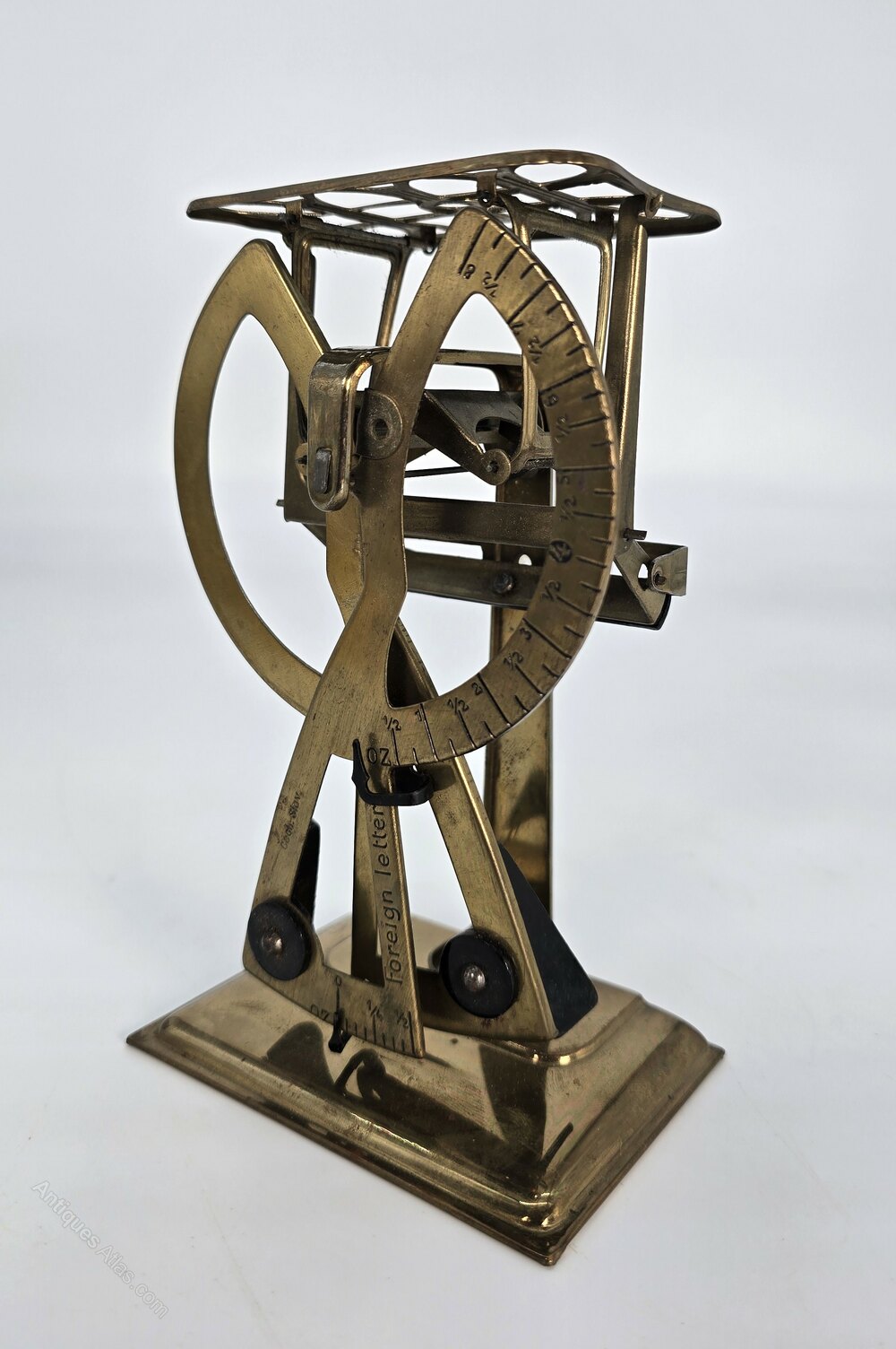 This unusual set of postal letter scales has great eye appeal. They are made in brass with a complicated cantilevered balance movement. They are stamped for manufacture in Czechoslovakia.