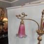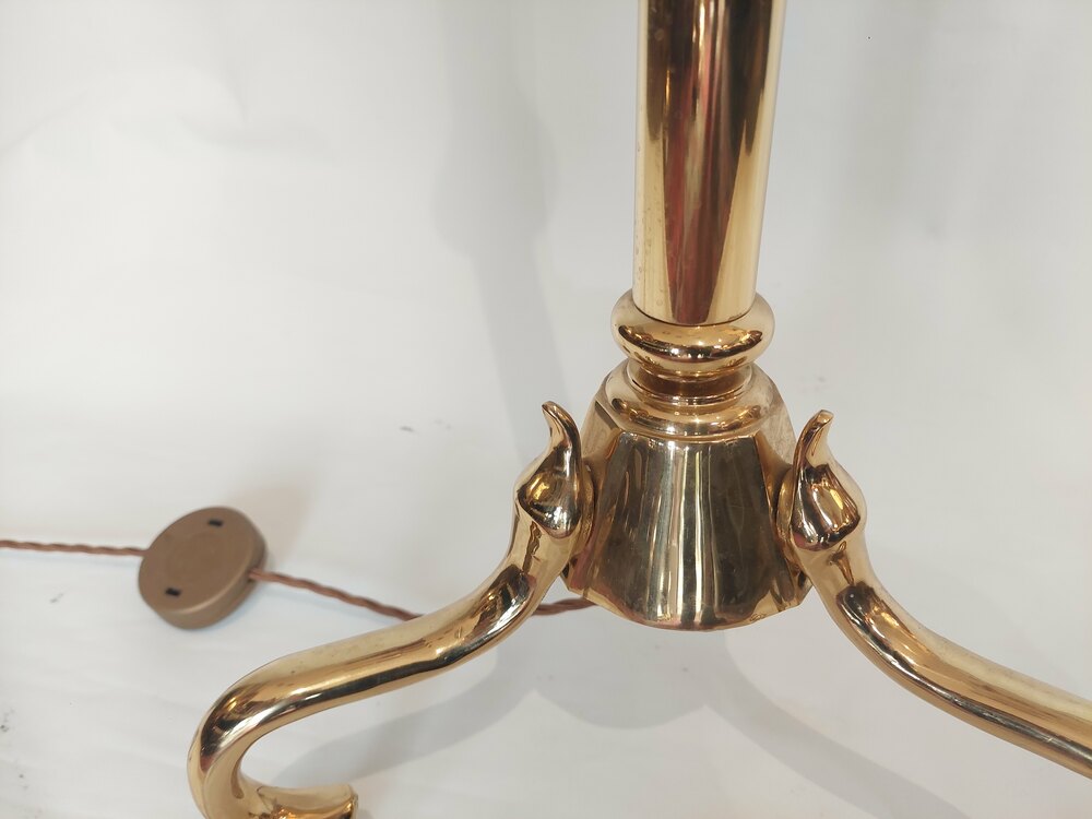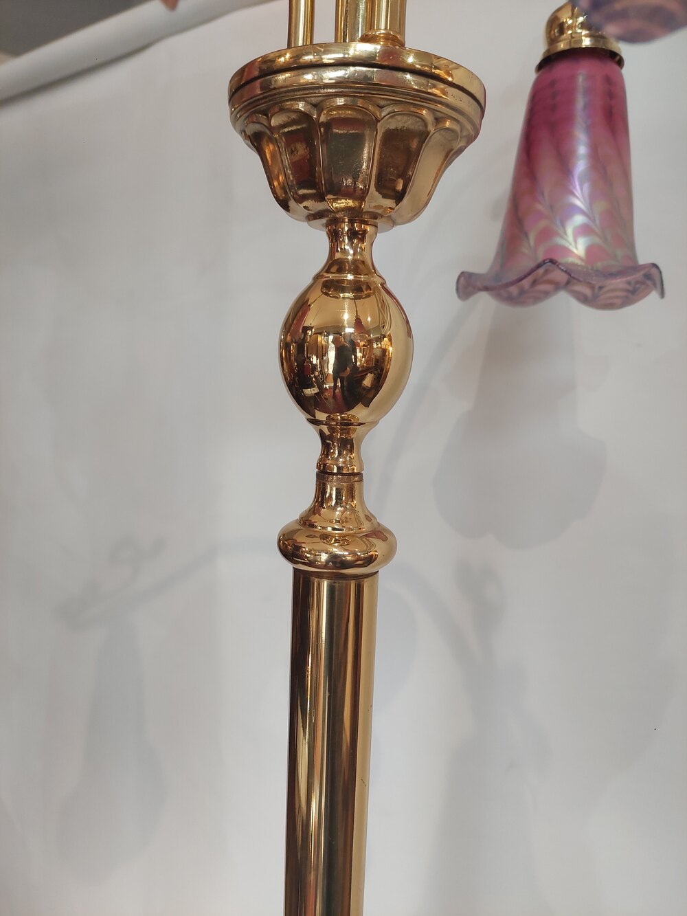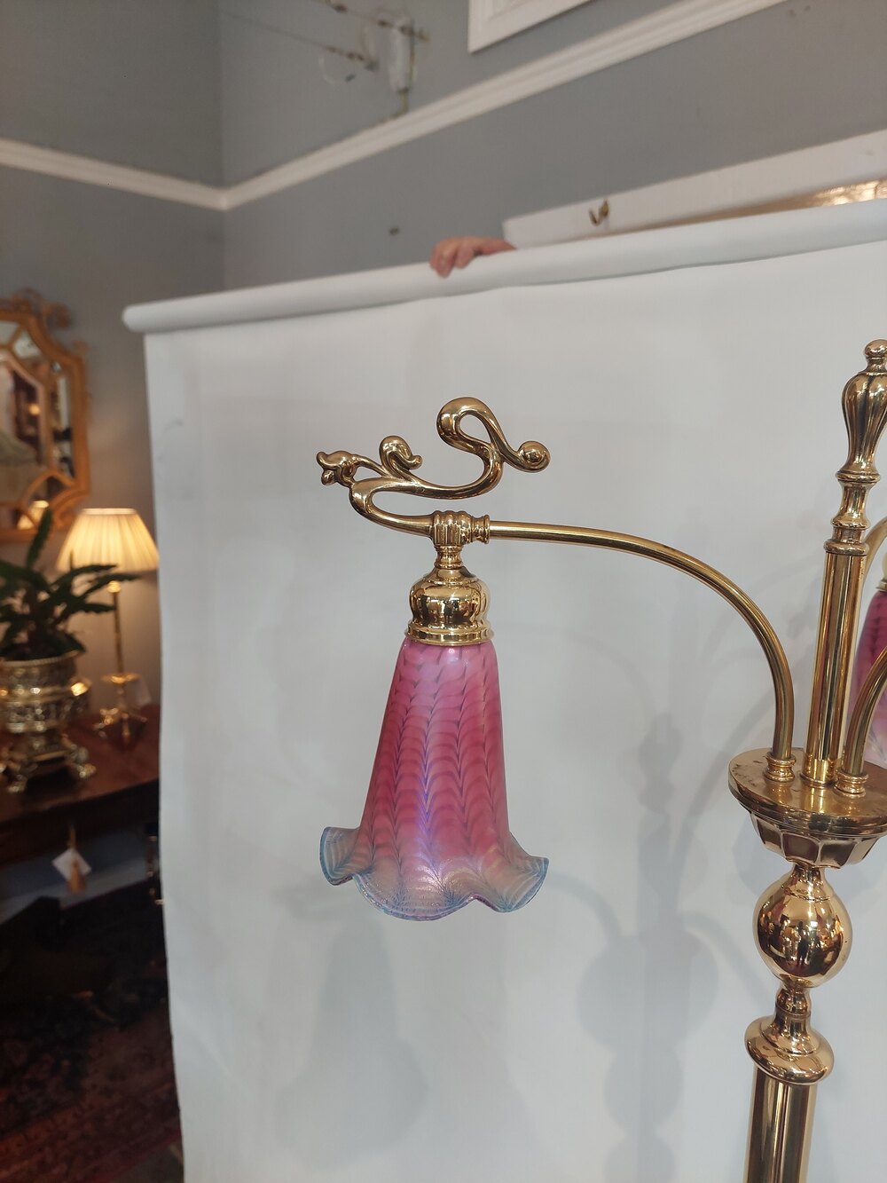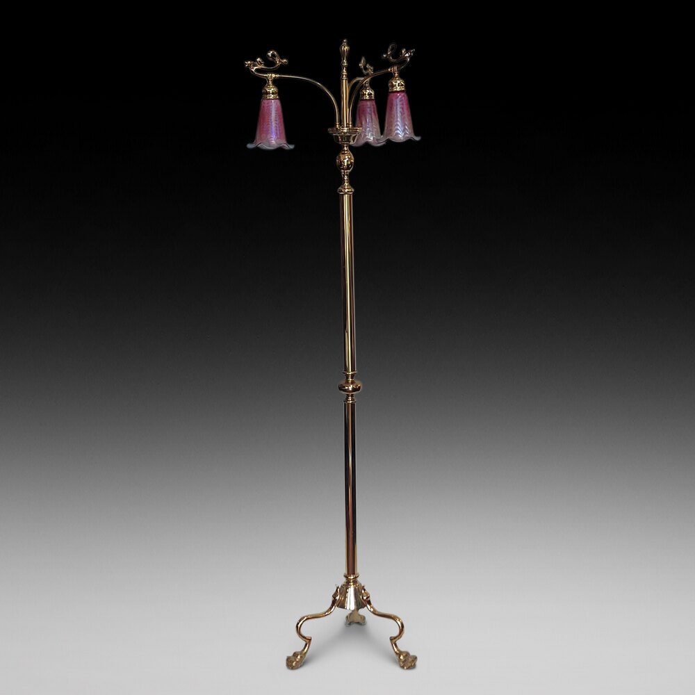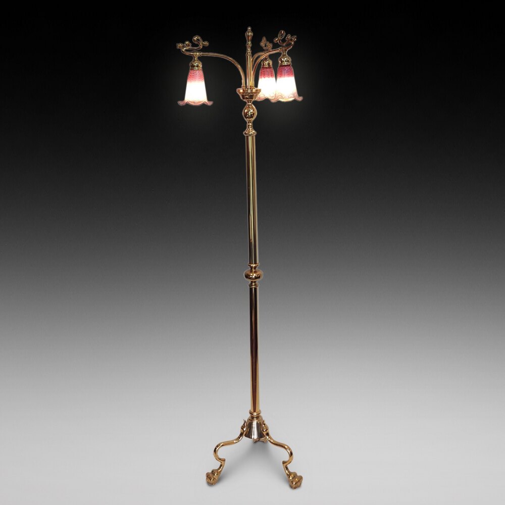Early 20thC Art Nouveau Brass Standard Lamp - with 3 arms, art glass shades and stylistic fittings leading to tripod base with hairy paw feet - 18" diam x 66"h- all lights and lamps have been rewired with authentic corded flex, fitted with either foot switch or finger clicker switch and are Pat tested