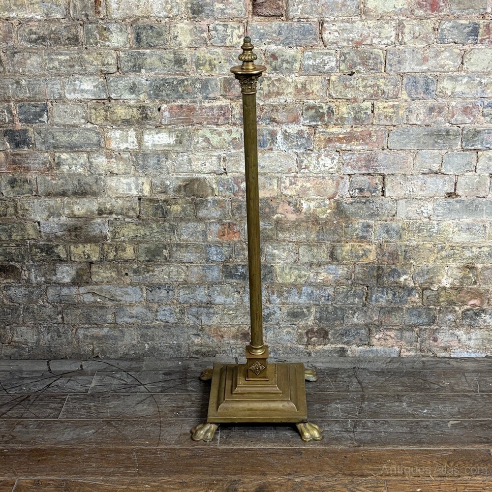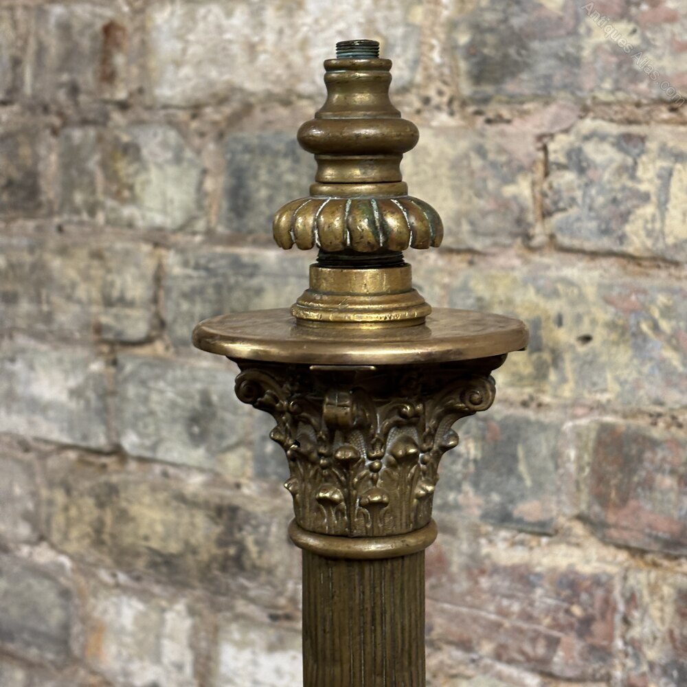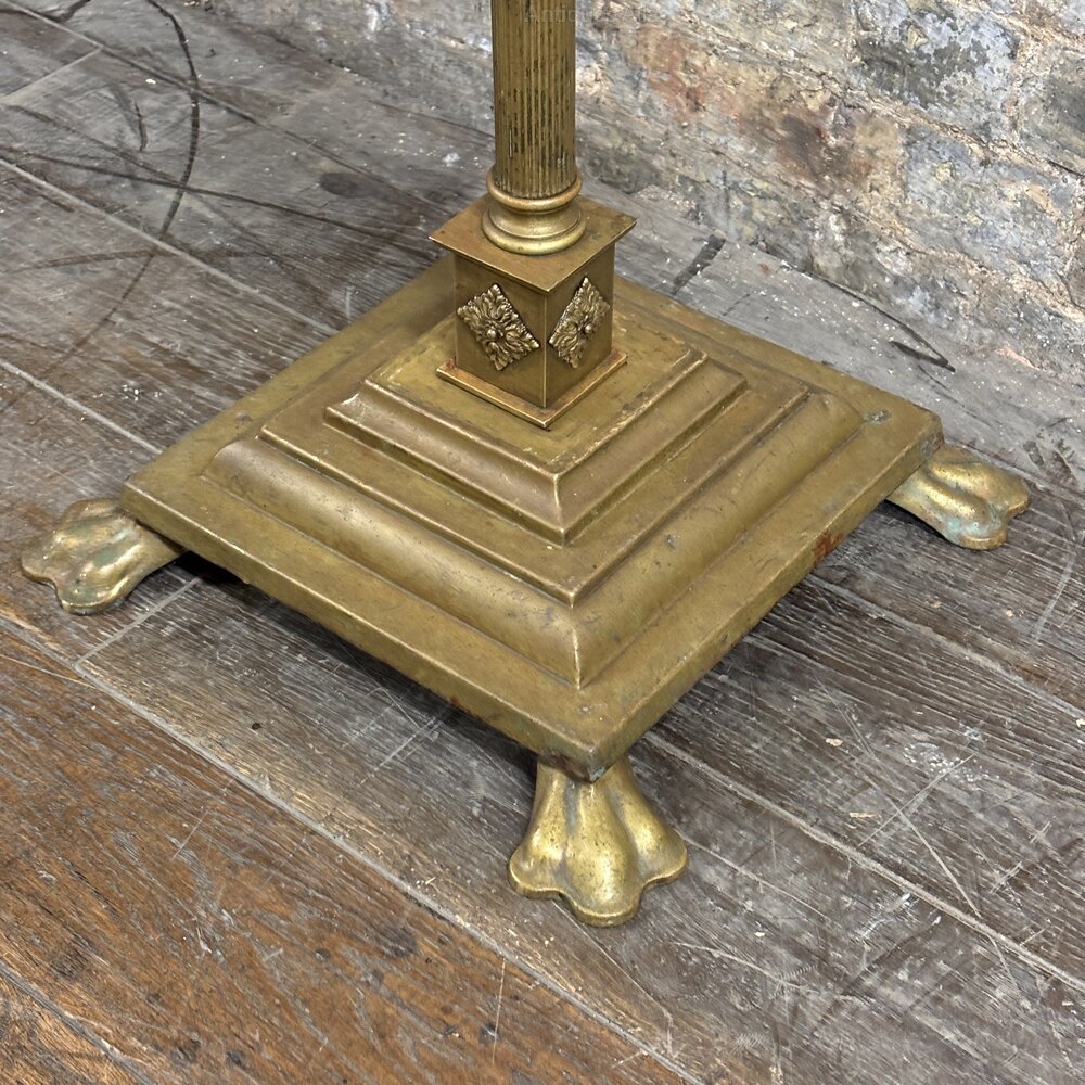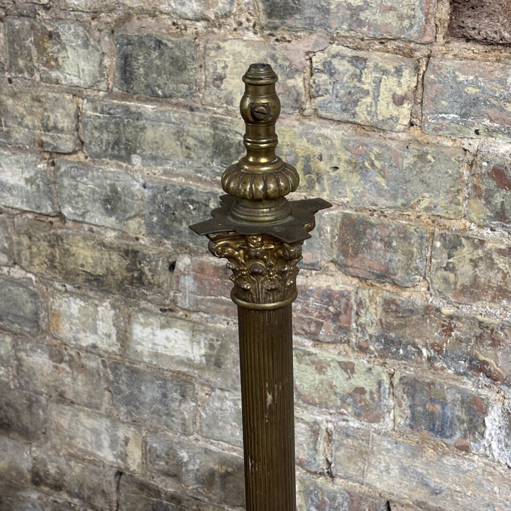 A striking Edwardian floor lamp base crafted from brass and bronze. The designed has been influenced by the neoclassical style, the fluted column is topped with a detailed Corinthian capital, resting on a stepped square base with claw feet.