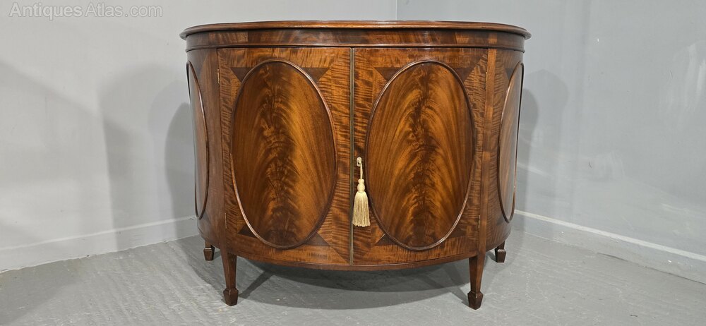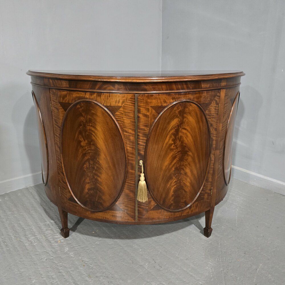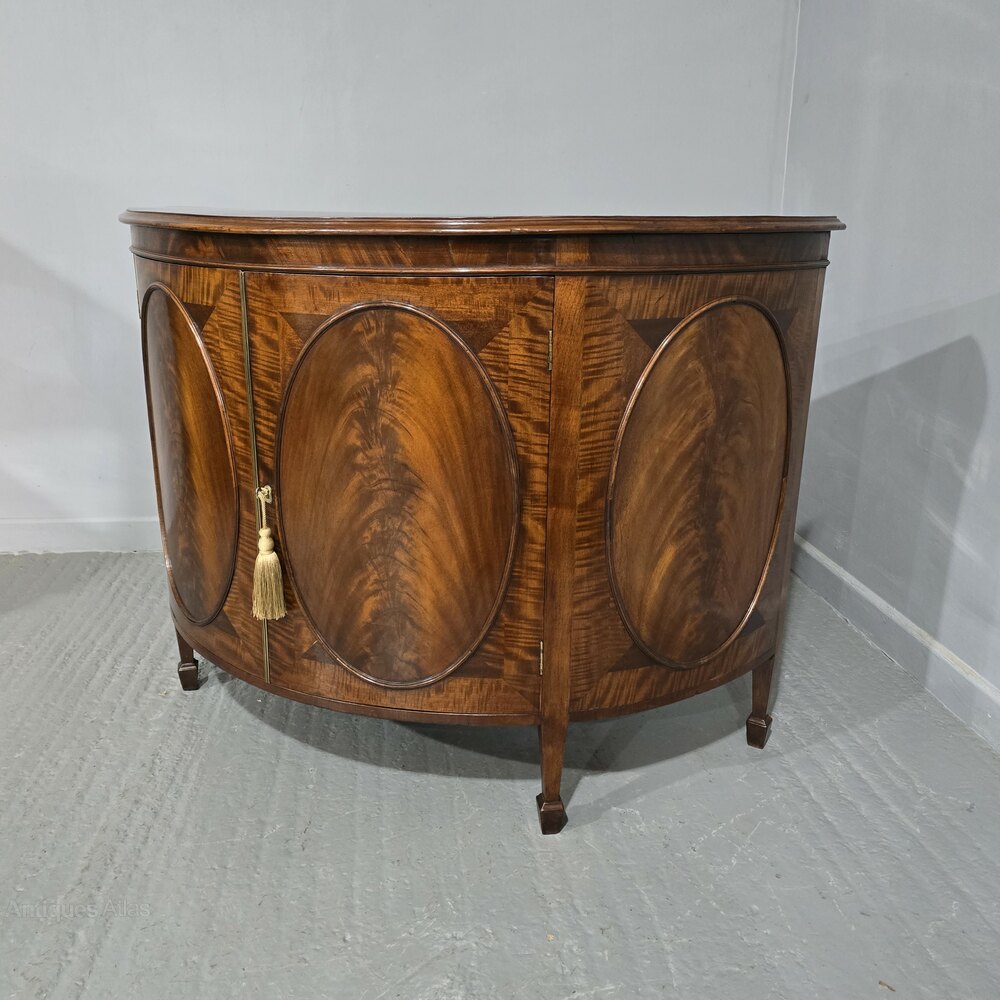 A very nice Edwardian mahogany two door demi lune sideboard, oval panels, brass slamming strip, single shelf inside, in very good all round condition.