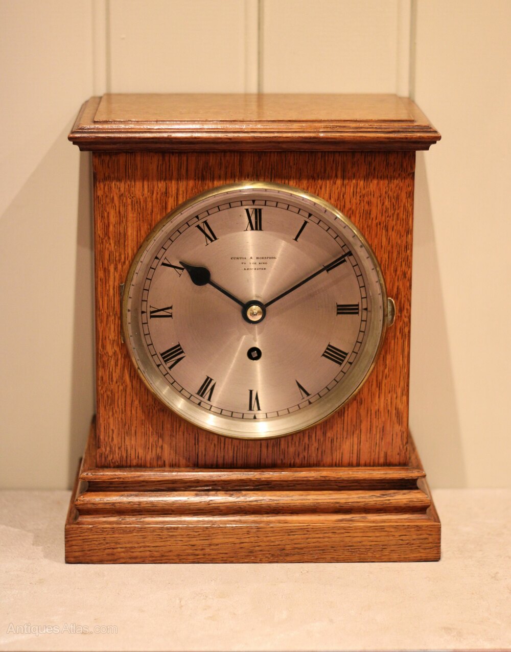 A substantial English solid oak cased timepiece mantel clock. The rectangular case has a flat top, and brass bun feet. It has a silvered dial, signed by the original retailer Curtis & Horspool Liecester suppliers to King Edward VII with a cast brass bezel and thick bevel edge glass. The substantial 8 day timepiece (does not strike or chime) has a chain driven fusee movement.