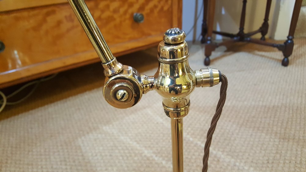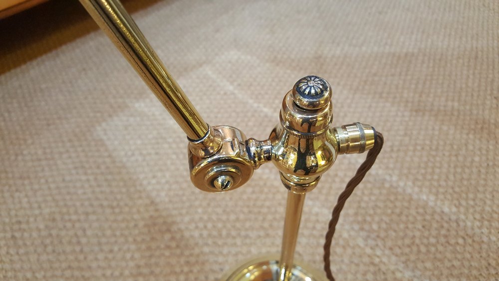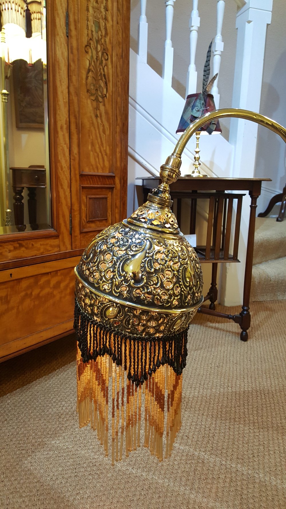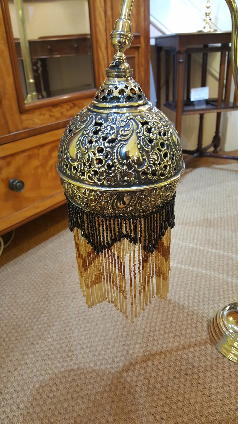 Edwardian Persian Influenced Pierced Brass Desk Lamp with beeded fringe and adjustable arm - all lights and lamps have been rewired with authentic corded flex, fitted with either foot switch or finger clicker switcth and are Pat tested.