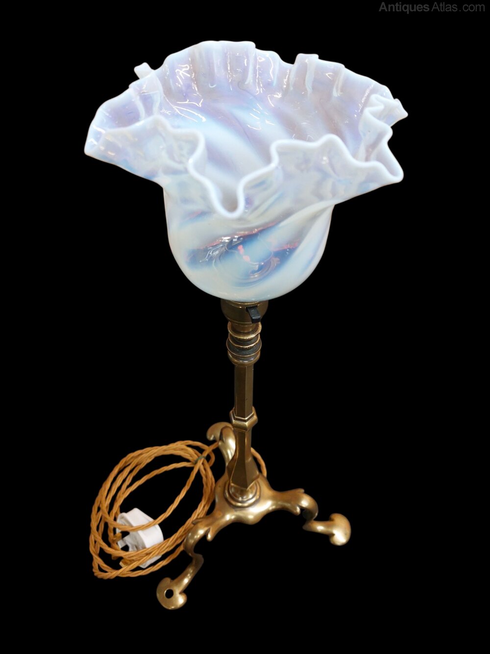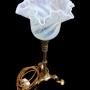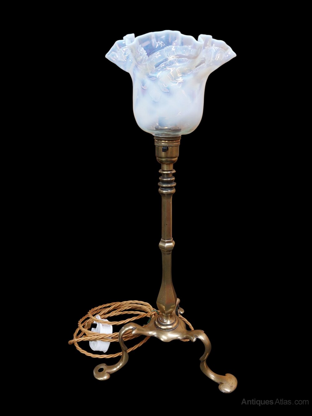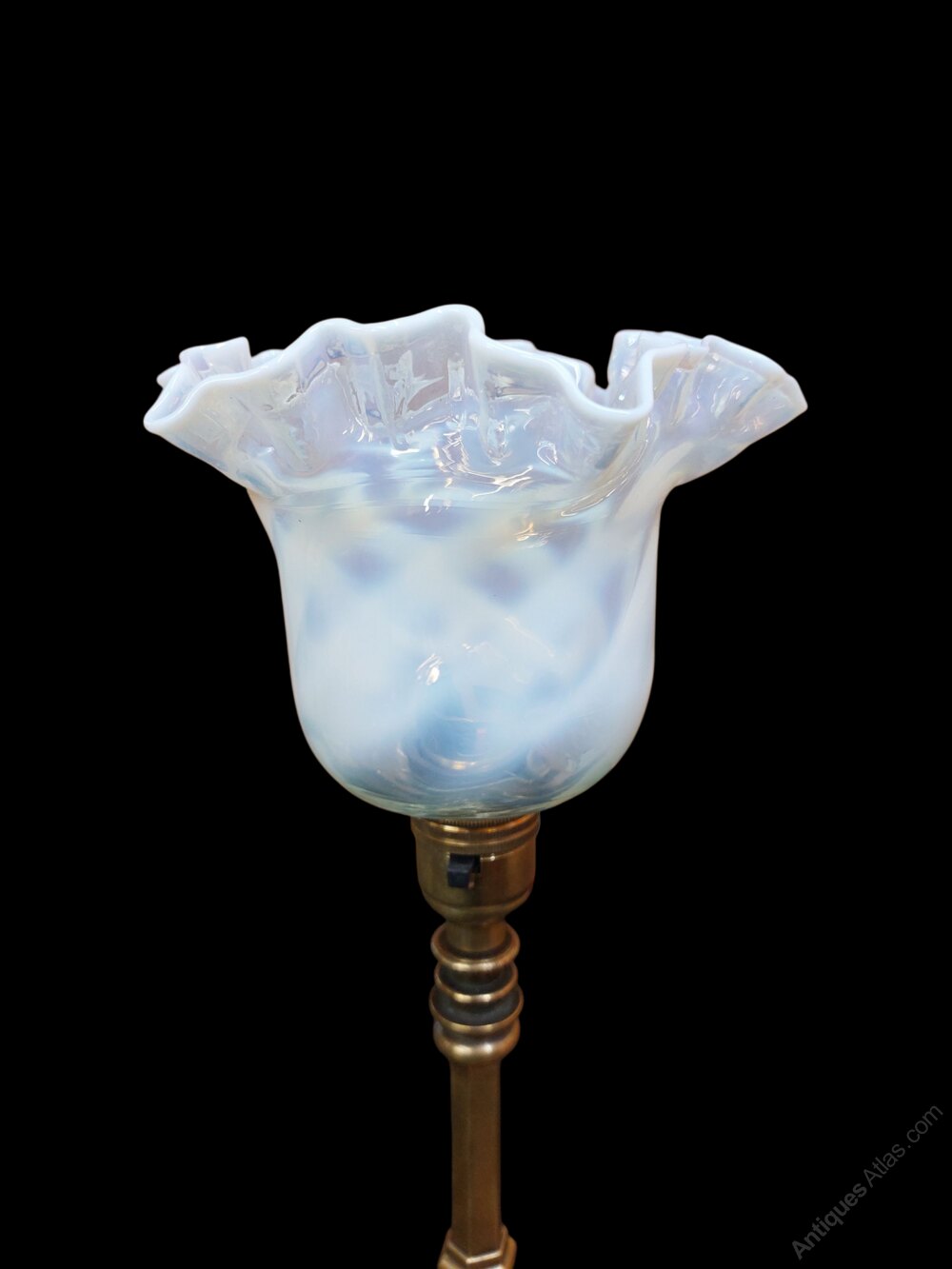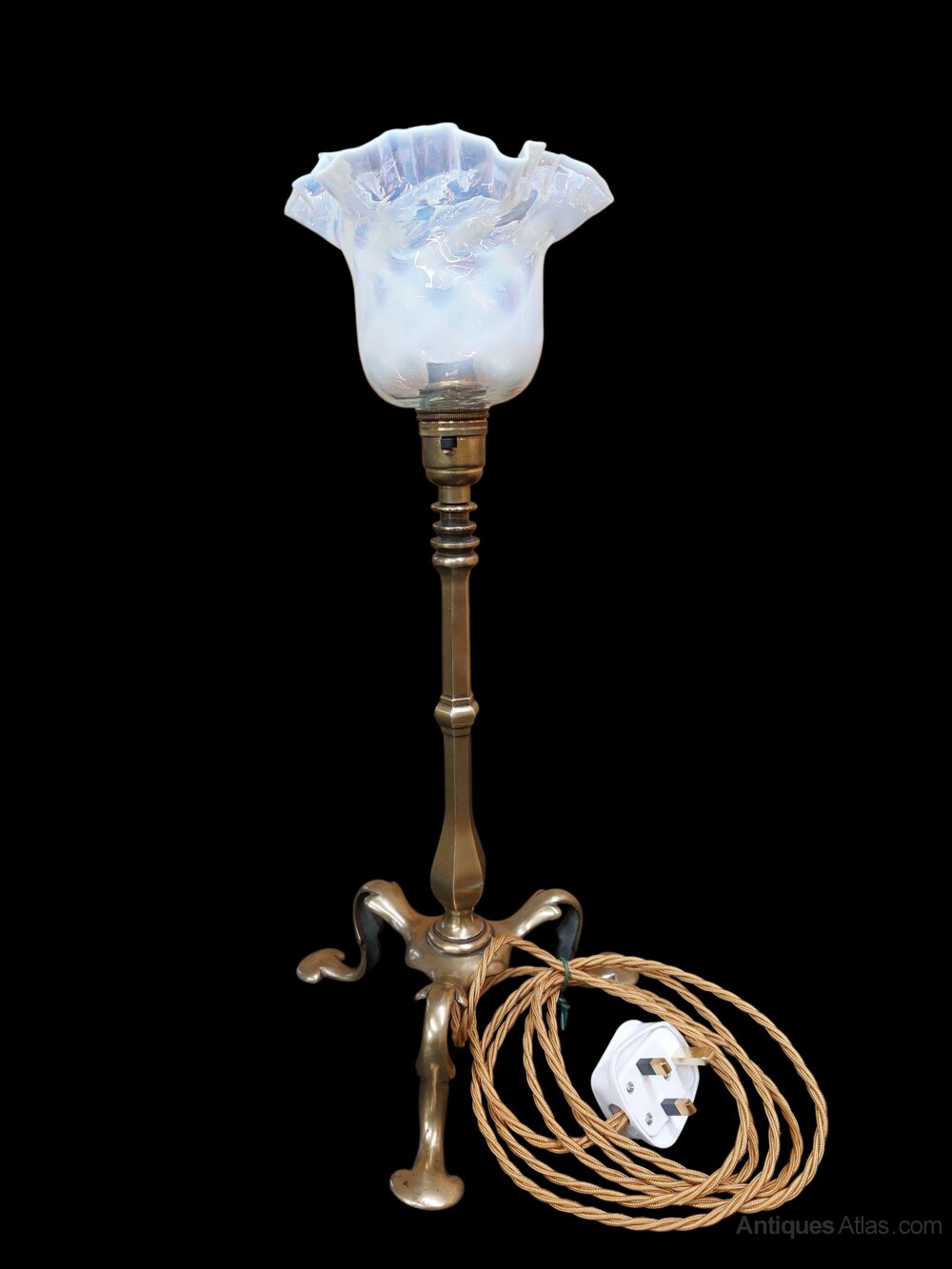A fabulous quality English brass Pullman table lamp with the original uranium glass shade. Stamped F and S Regd. (I think this is Faraday and Sons or Falk and Stadelmann). Rewired in traditional flex and ready to use. Dates to 1910. 17" tall x 8 1/4" foot to foot. Shade 6" wide at top.