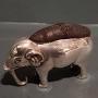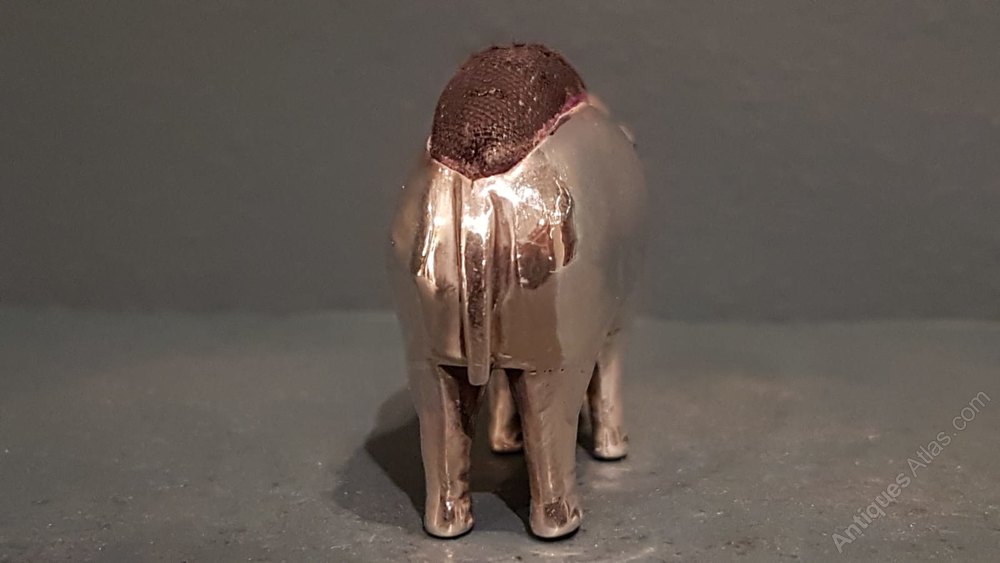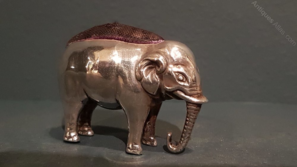 An Edwardian period solid silver novelty elephant pin cushion, hallmarked Birmingham 1906. Superb detail with no ware or damage, inset original fabric covered pad to the top forming the pin cushion. Bears the makers mark for Adie & Lovekin. Presented in excellent original condition with a deep shine. Measures 2" wide x 0.5" deep x 1.5" high.