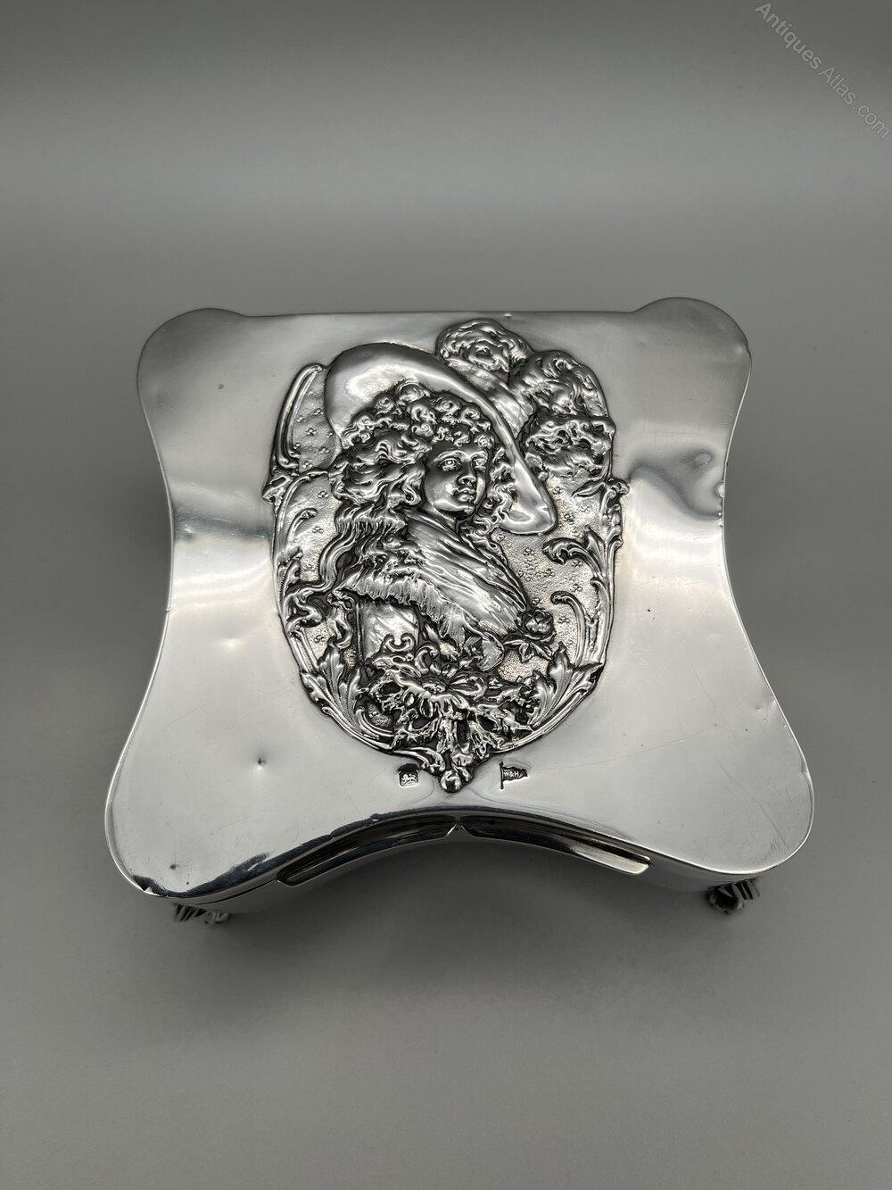 Here we have a striking large Edwardian Sterling Silver Jewellery Box. The box is square with bowed sides and stands on four paw feet. The lid is embossed with an image of a lady surrounded by flowers in the Gainsborough style. The interior has a pale green satin and velvet lining with a tray to hold seven rings and a general storage space in front.