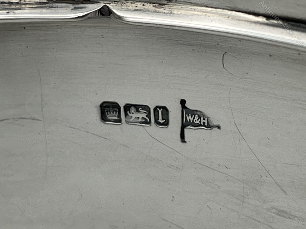 The hallmarks, on the front of the box, are well struck and clear to read. They show the lion passant for Sterling Silver, the crown assay mark for Sheffield, the date letter l for 1903 and the famous W & H in a pennant makers' mark for Walker & Hall. There is a secondary partial set on the lid.