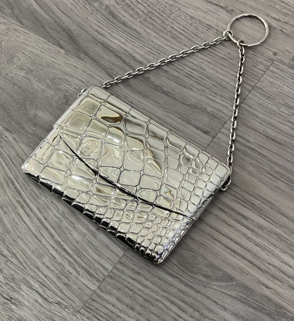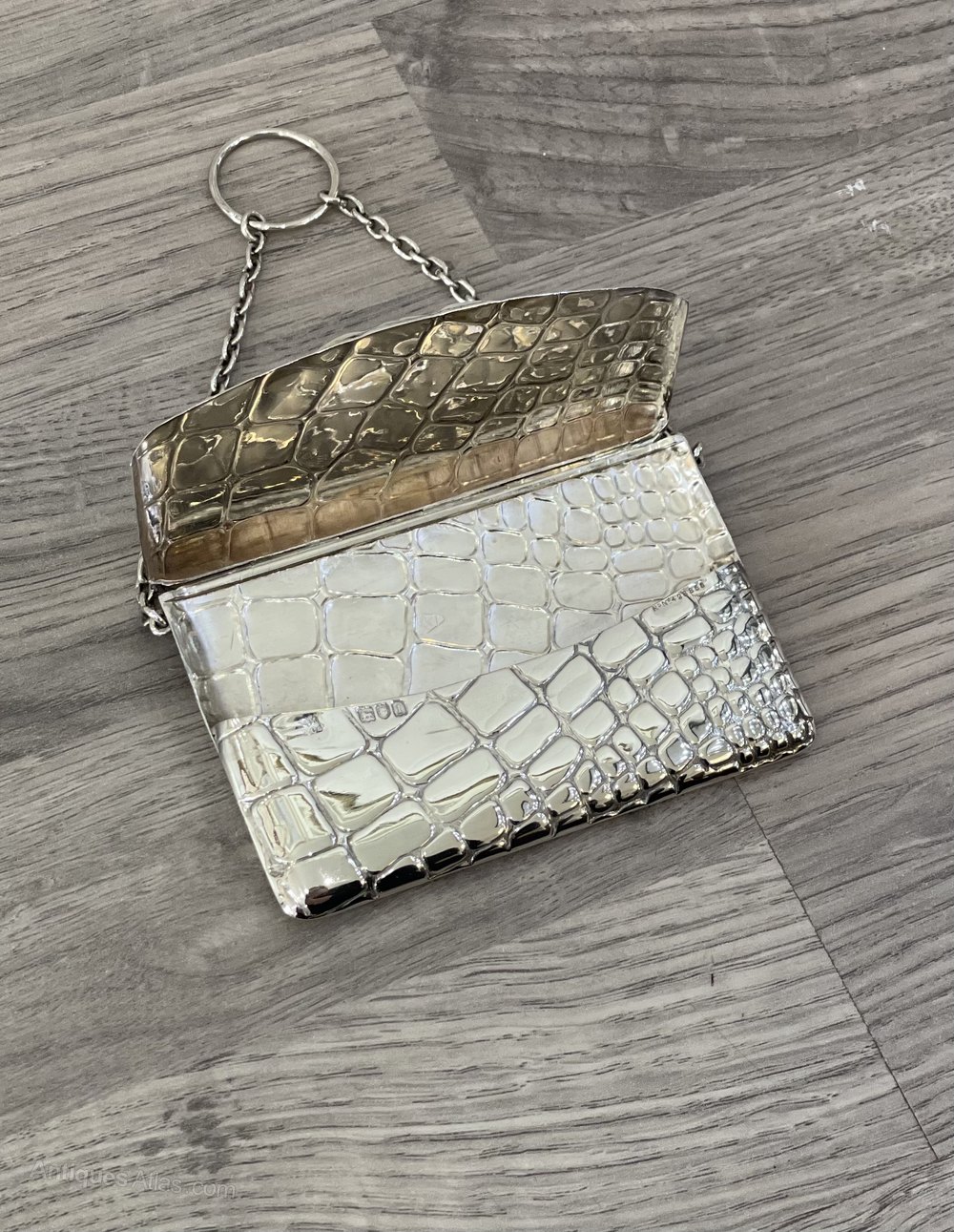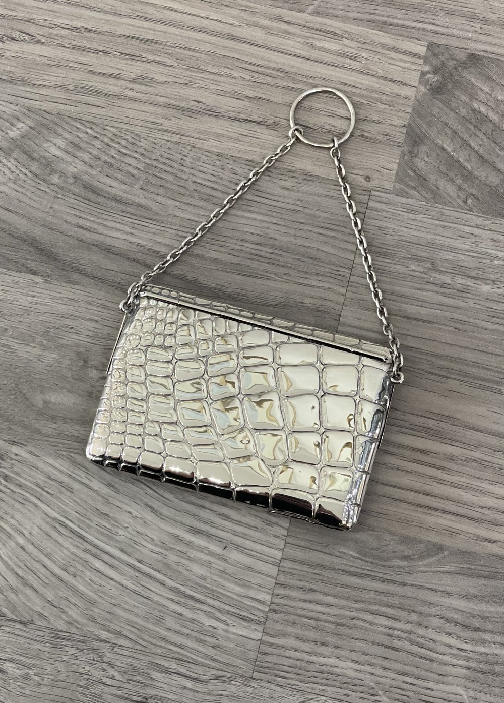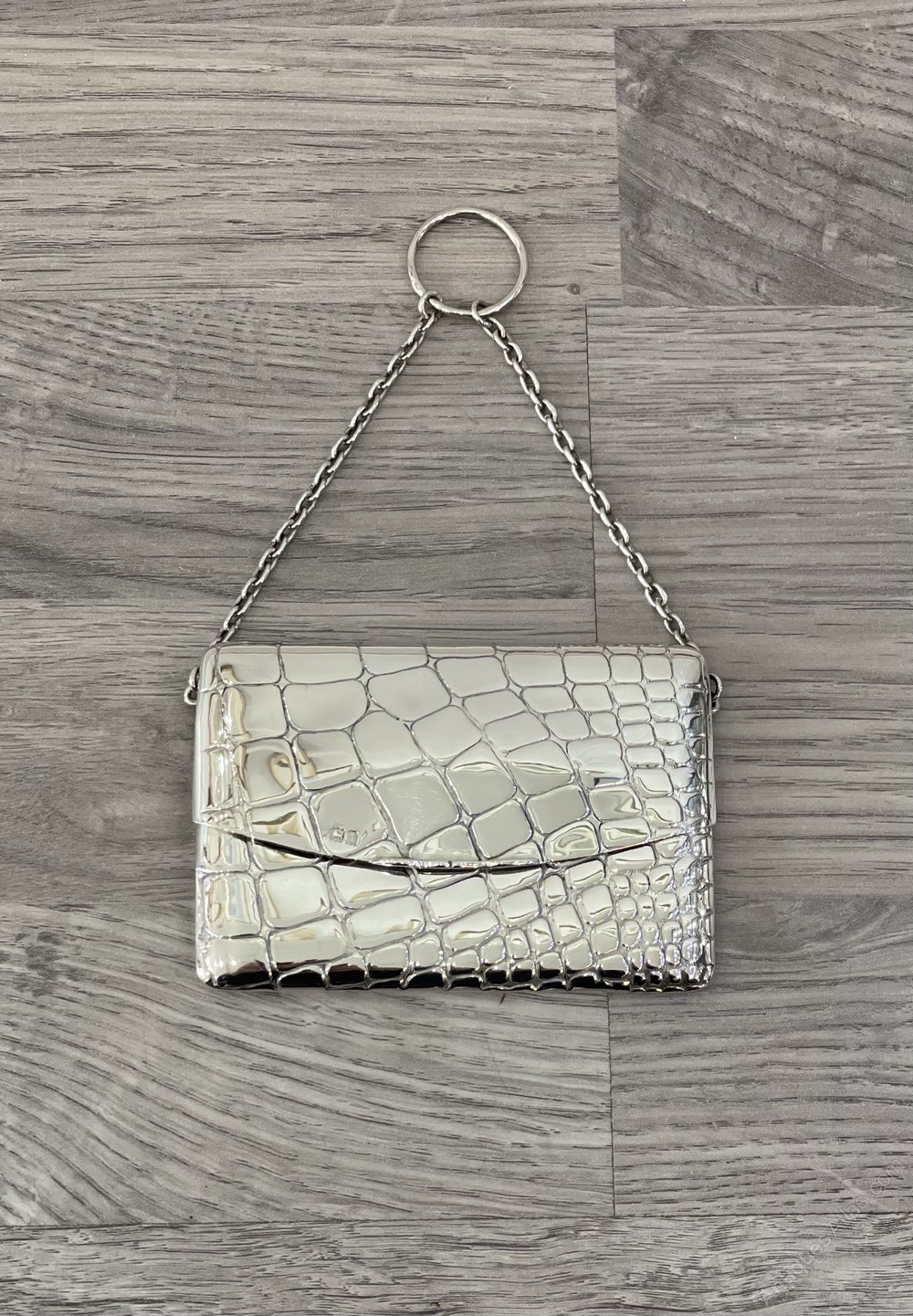 A good Edwardian solid silver ladies evening dance card purse by Sampson Mordan & Co, hallmarked London 1906. This fabulous weekend example, in the form of crocodile leather, with original chain and ring. The perfect size for credit cards, ID, business cards etc.