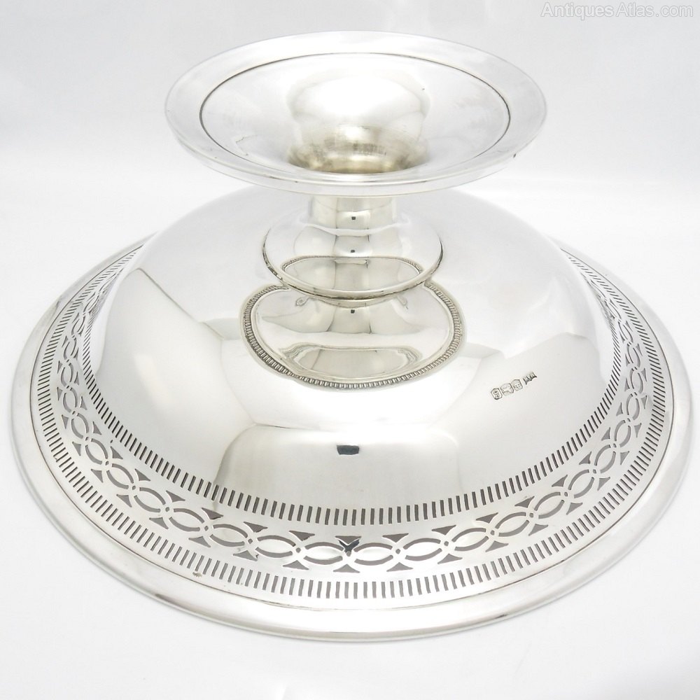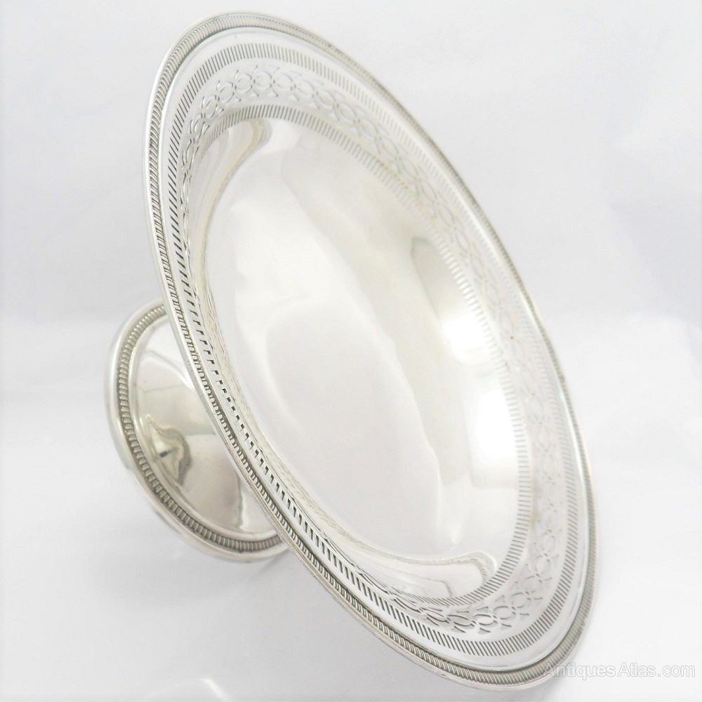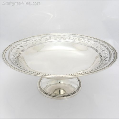 A beautiful solid silver tazza dish. The lovely design comprises a polished silver bowl with pierced pattern to the edge and a neat patterned around the rim. This pattern is repeated around the edge of the circular pedestal foot. The quality of both the style and the craftmanship is very apparent.