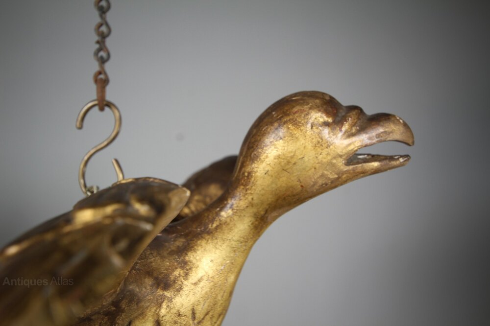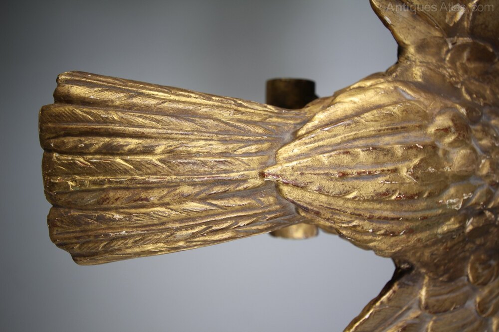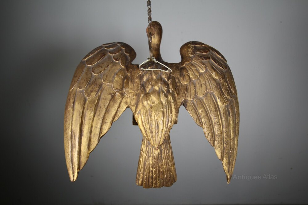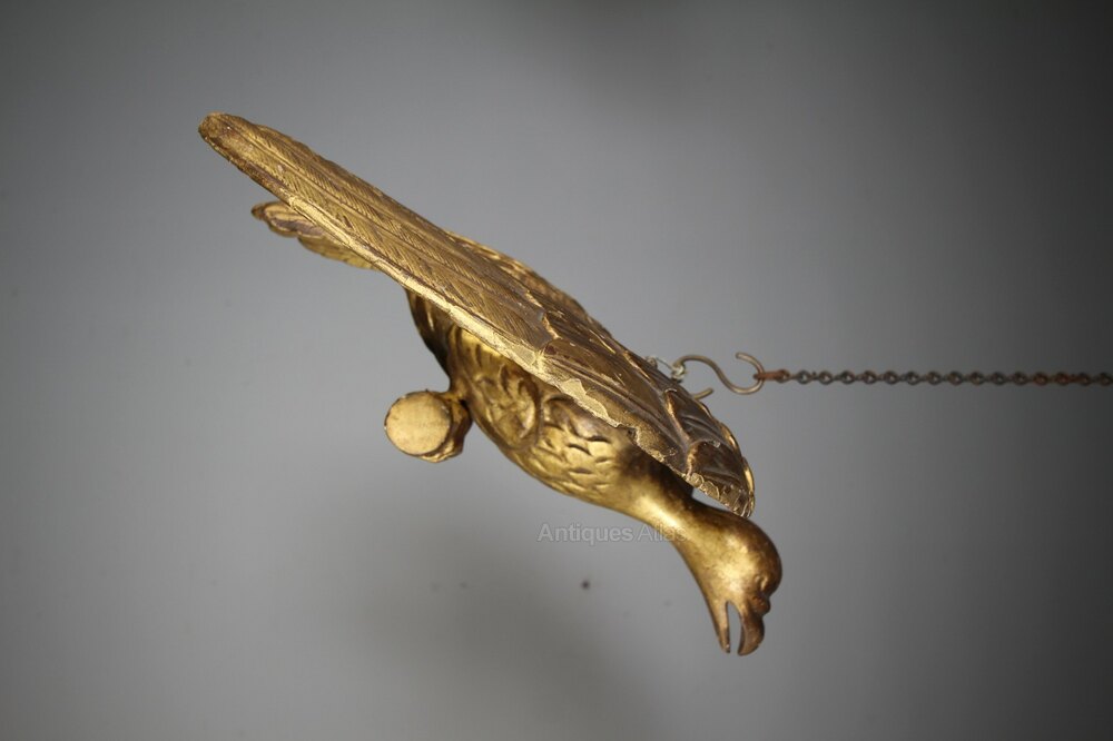 A beautiful late 18th century antique carved pine Phoenix bird of large scale and in the original gilt finish. Wonderfully hand carved feathers and talons gripping a pole. Never part of a mirror, designed to hang in space. In excellent condition, a lovely decorative Georgian antique mythical bird.