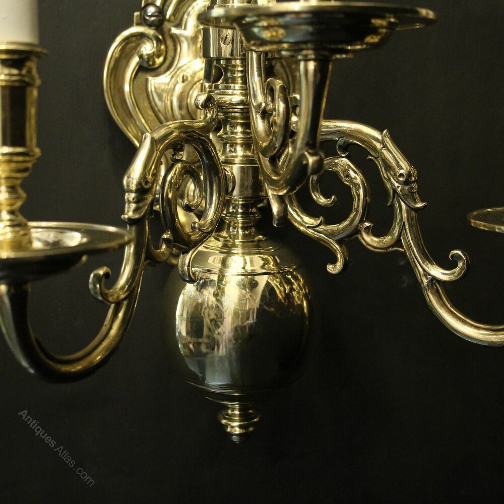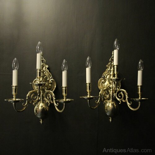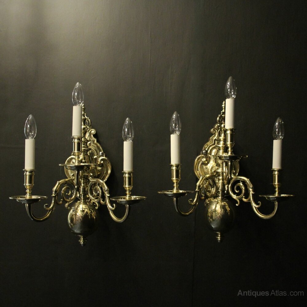 An English pair of repolished brass triple arm antique gasolier wall lights, the scrolling arms with circular bobeche drip pans and banded candle sconces, issuing from a elongated knopped centre with large bottom ball and pierced urn finial, having an elaborate foliated backplate, sympathetically repolished and lacquered. Fully rewired and PAT tested. All our wall lights come with aged brass screws for fixing and spare bulbs.