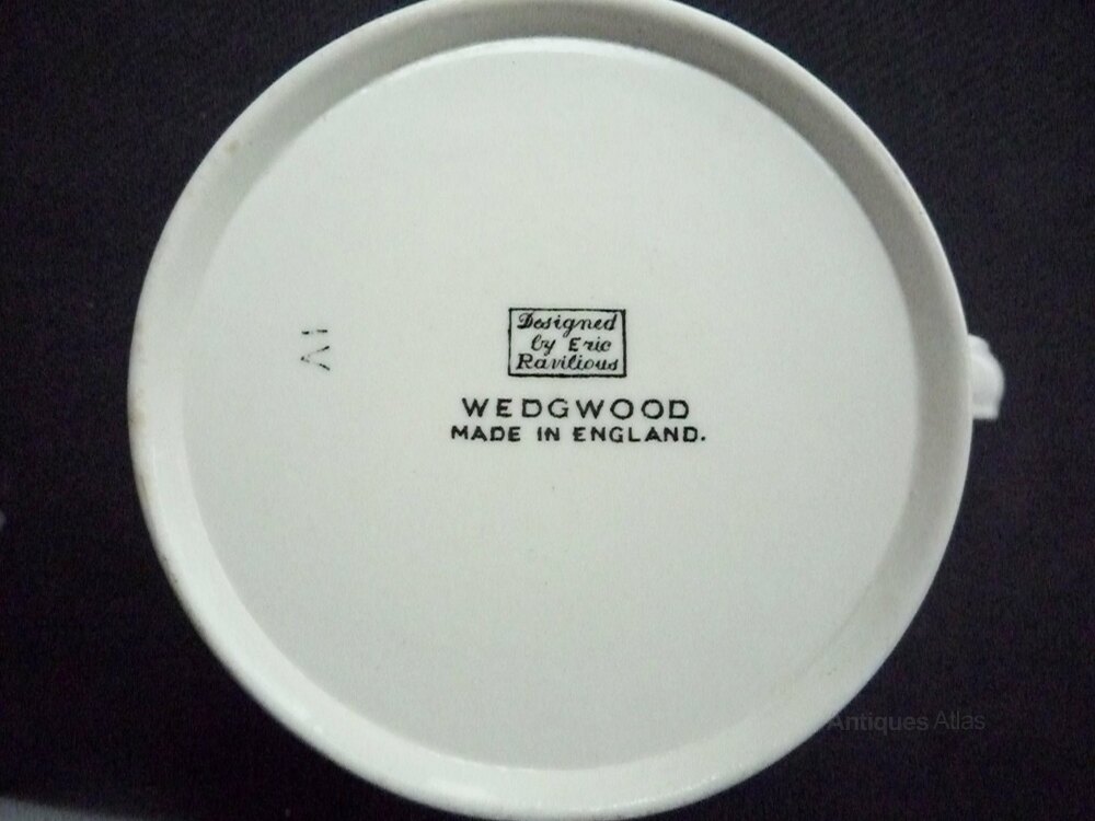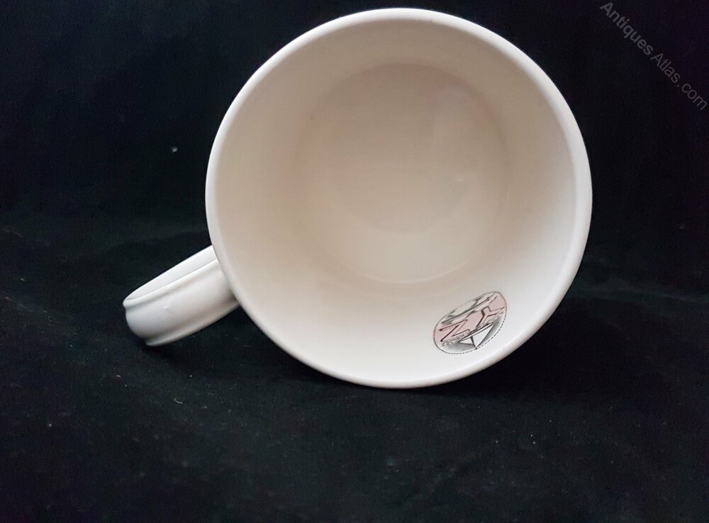 An original Alphabet Mug by Eric Ravilious for Wedgwood. 8cm high. The various vignettes sybolising images he remembered from childhood. A for aeroplane / S for swan / U for umbrella etc. This is fabulous example in immaculate condition but please look closely at the photos as they form part of the description. No chips, cracks, pattern loss, marks or crazing. Unused having been kept on display only. Not to be confused with modern reproductions and museum re-issues.
