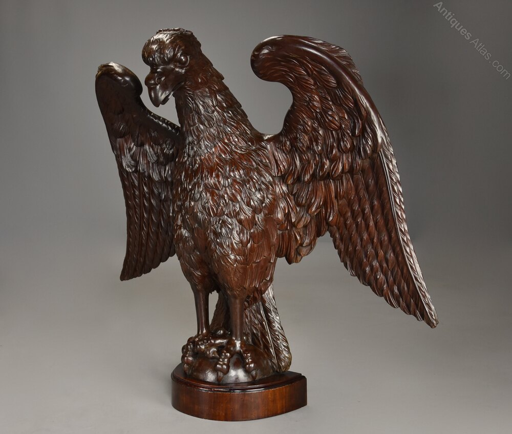 Below, the large walnut eagle finely carved in the Baroque style with outspread wings is supported on a plinth base, the carved eagle possibly originating as a lectern and can be displayed as a superb stand-alone carving if preferred.