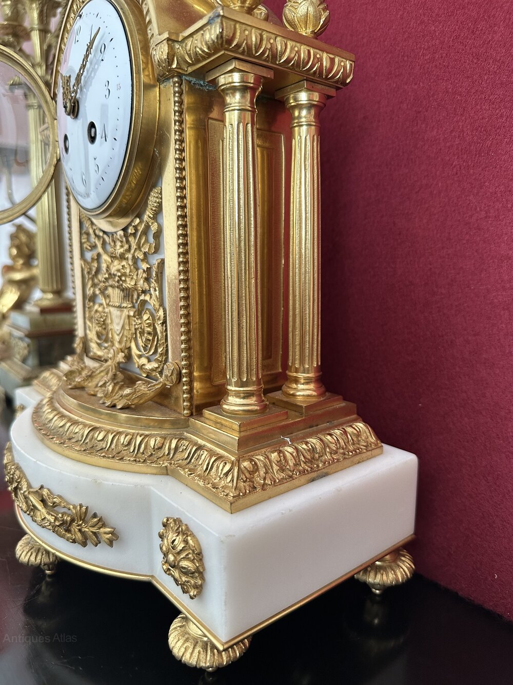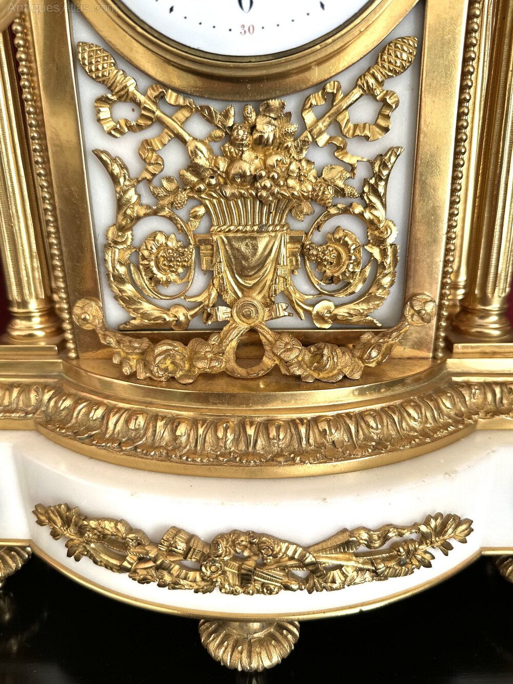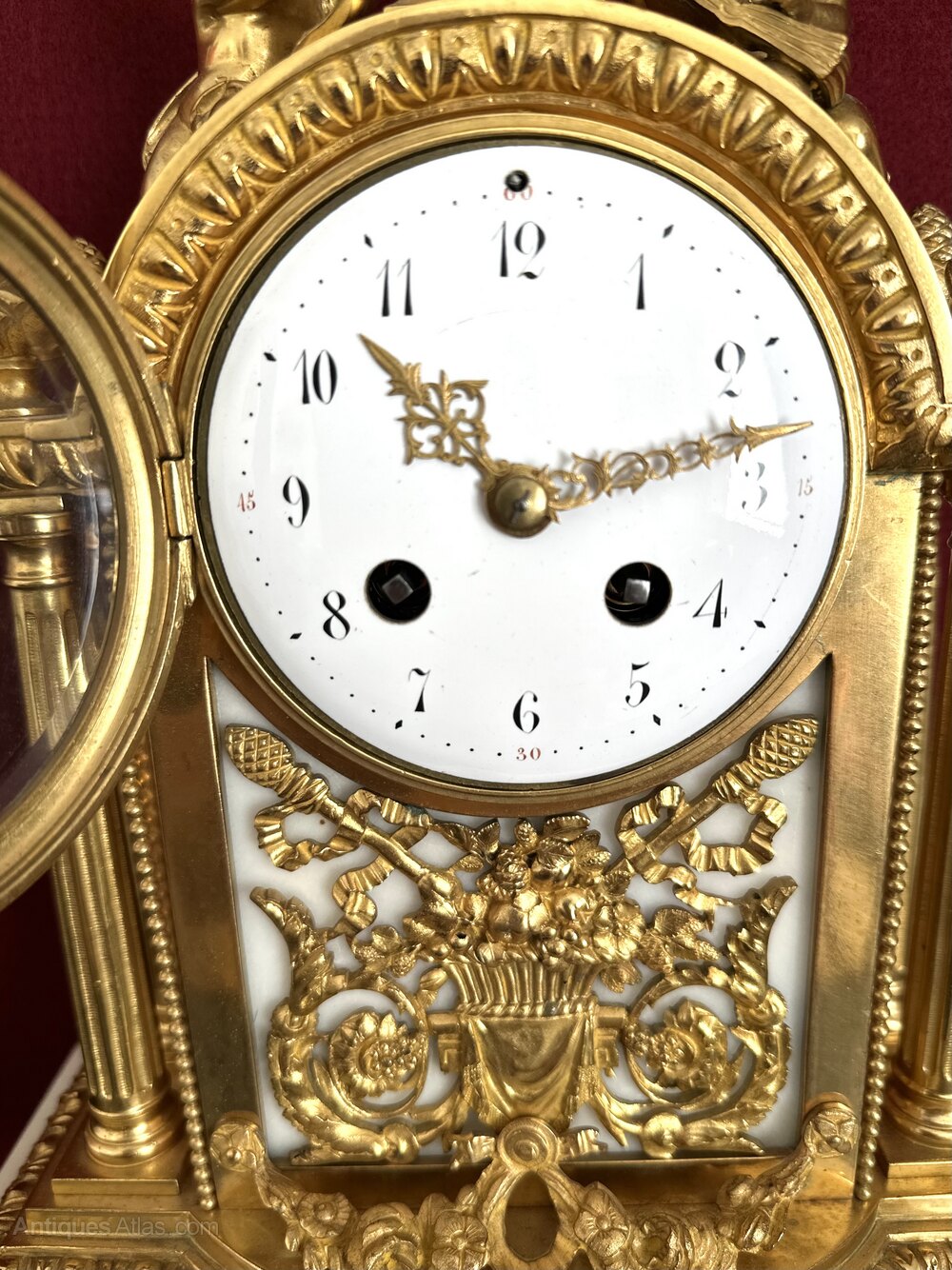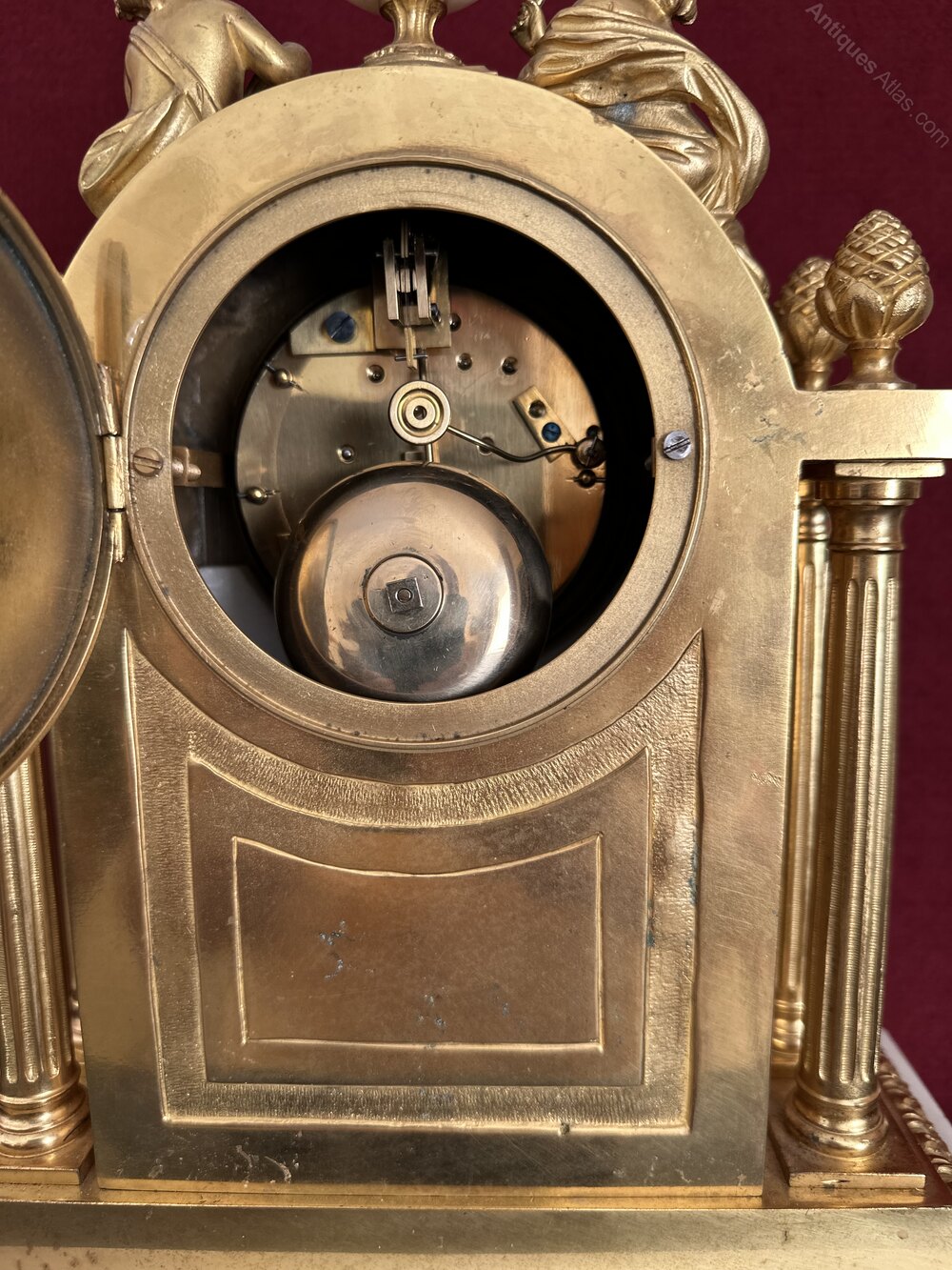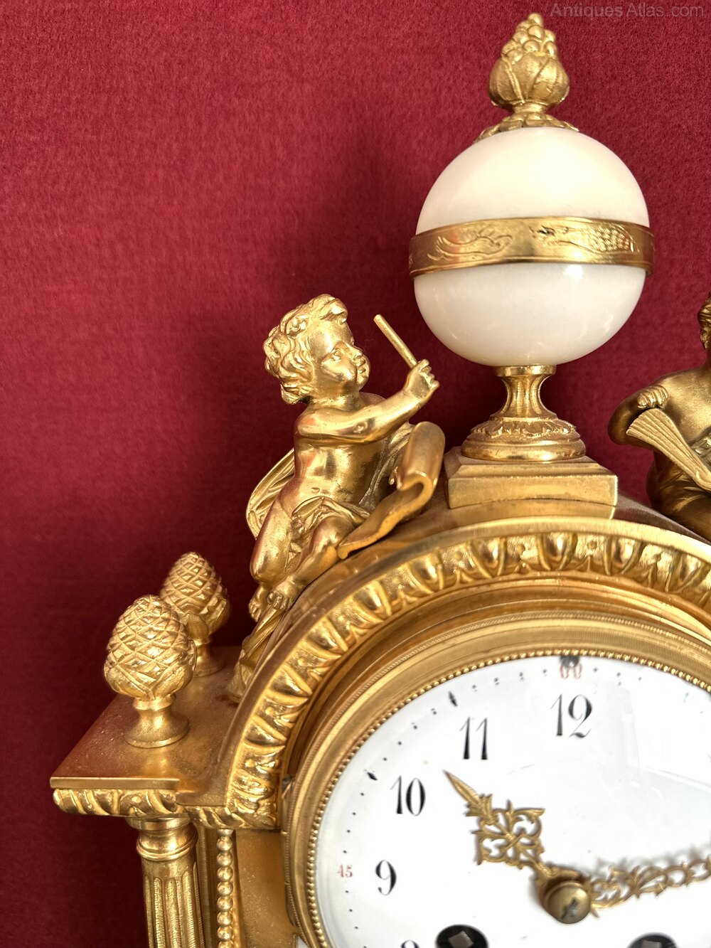 A fine gilt mantle clock of eight day duration striking the full hours and half hour on a cast bell, giving a very pleasant mellow chime. This is one of the finest mantle clocks of this type that we have had for some time, depicting two scholarly cherubs studying the signs of the zodiac.