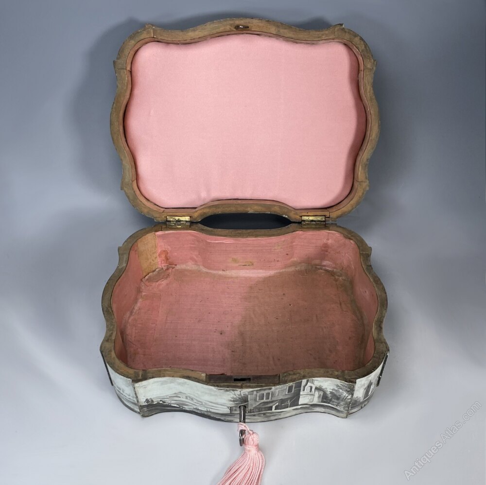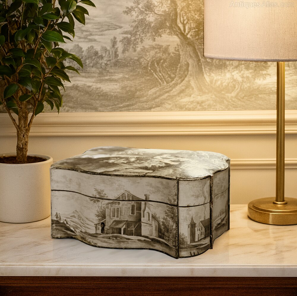 Boxes made in the Belgian town of Spa are best-known for their unrivalled quality of decoration. These boxed often feature romantic paintings of local scenes, buildings and natural surroundings as well as flowers and animals. Spa boxes became highly sought-after souvenirs for visiting European aristocracy during the 18th and 19th centuries. As a result of the aristocratic patrons who frequented Spa for holidays, the town attracted the best painters from across the continent. These craftspeople found new levels of success in crafting Belgian Spa boxes in service of this affluent market.