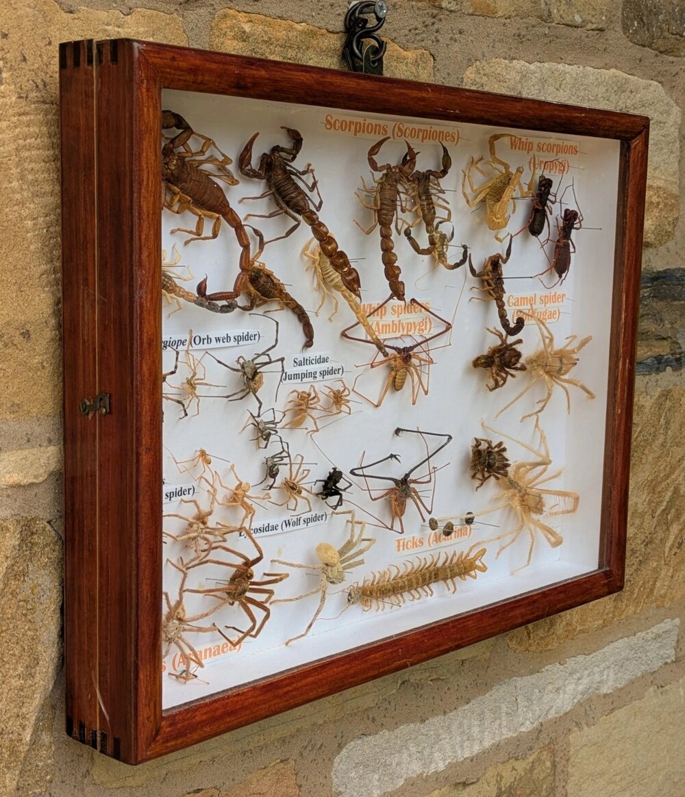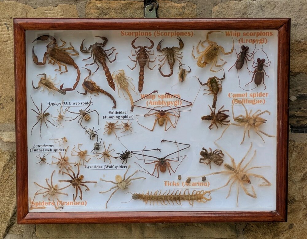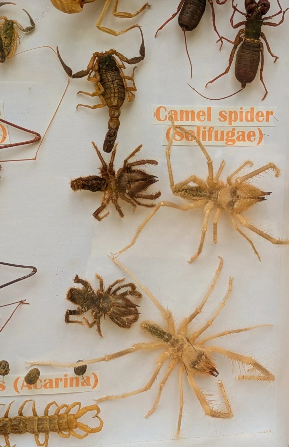 The specimen include funnel web spider, camel spider, jumping spider and whip spider as well as scorpion examples including the whip scorpion (uropygi).
