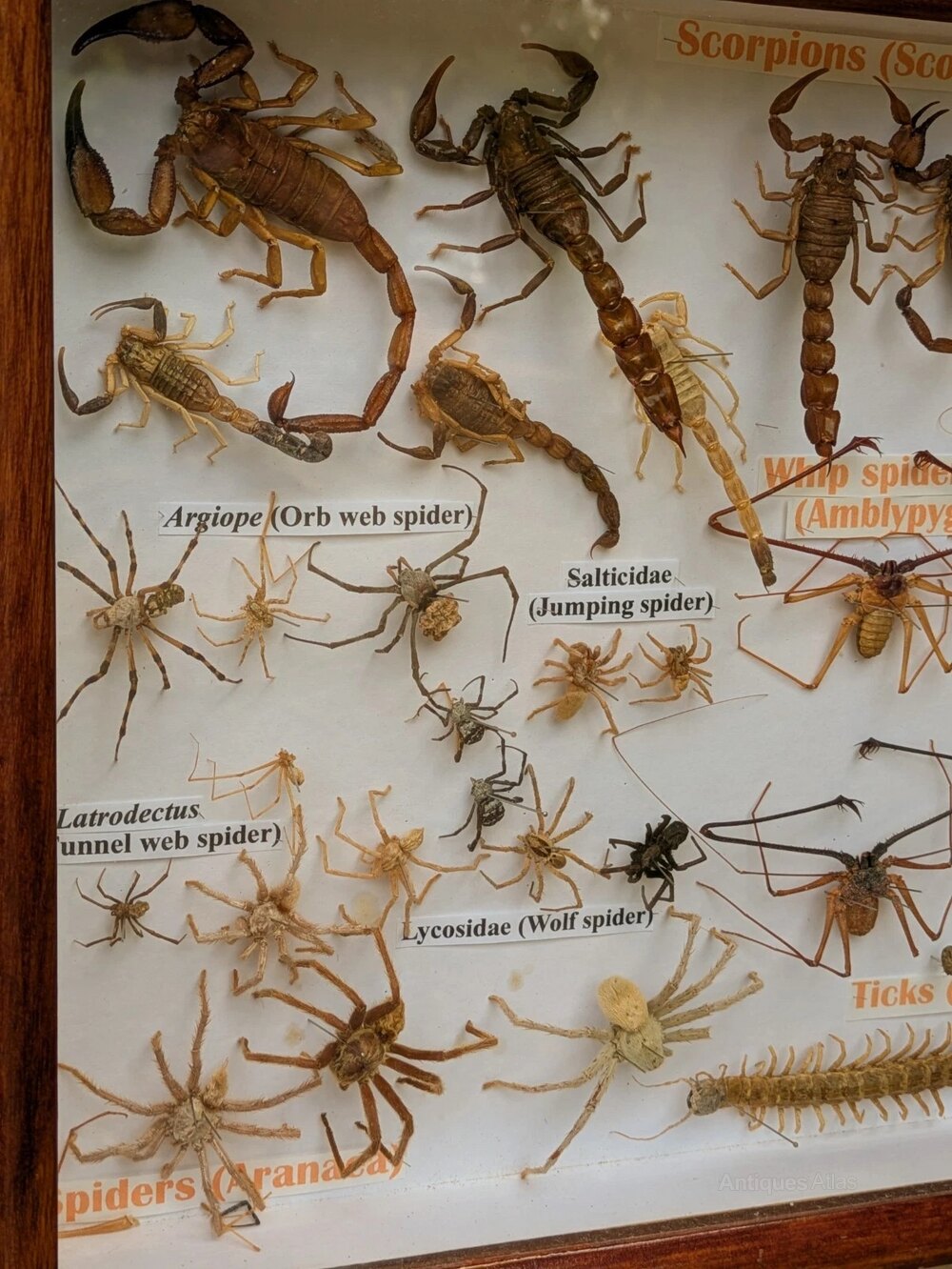 A superb case of rare spider and scorpion specimen in excellent condition dating from the early 20th century.