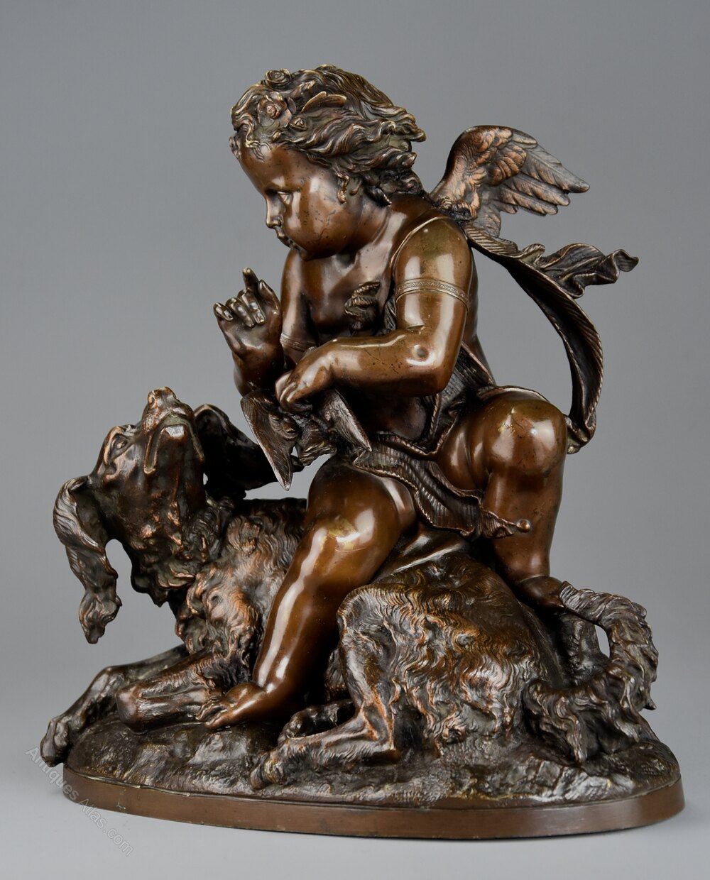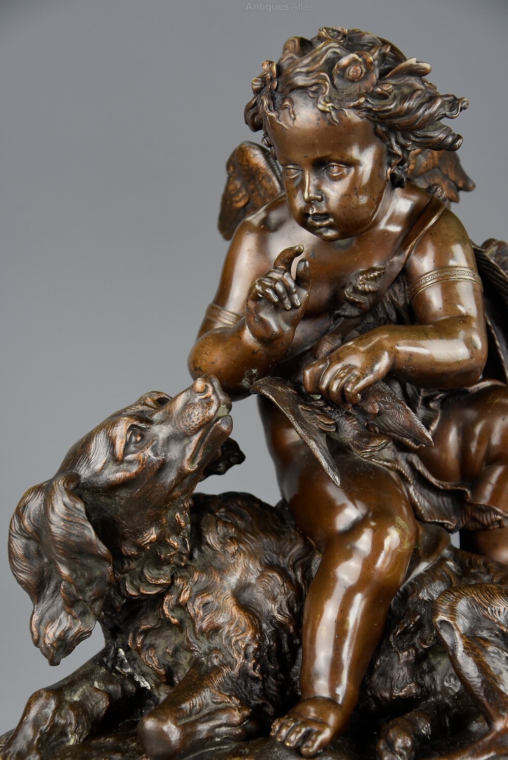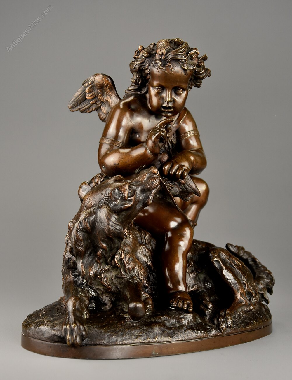 This fine quality bronze depicts a winged cherub holding a bird away from a spaniel dog all resting on naturalistic oval base.